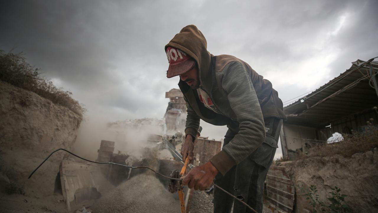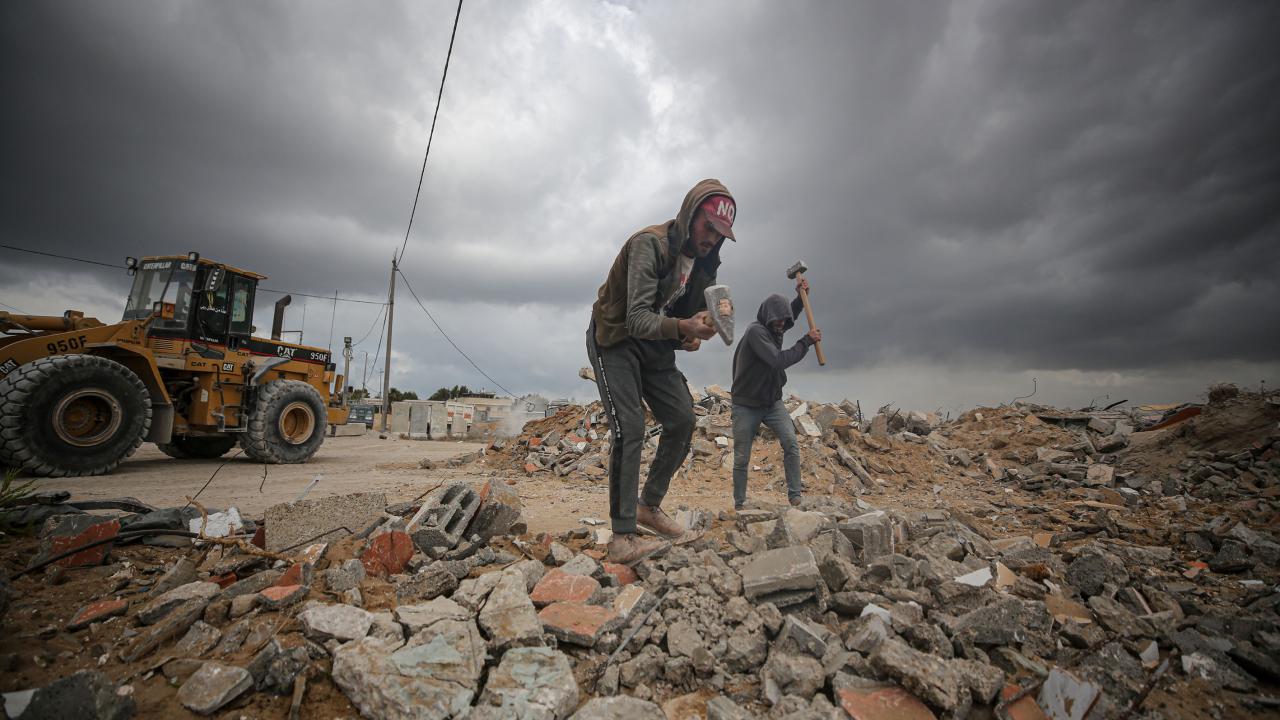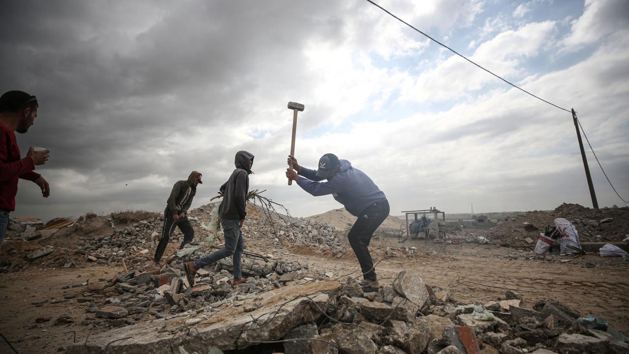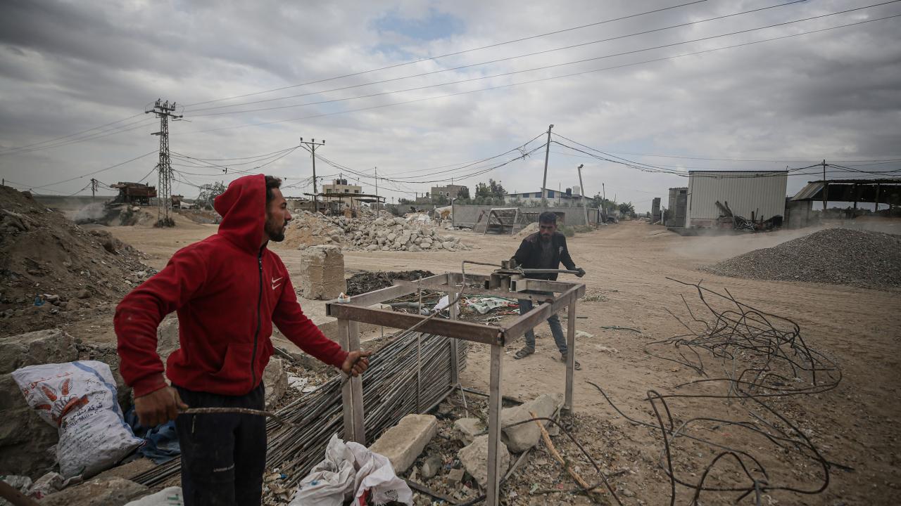 Gazze`deki ablukanın devam etmesi sonucu inşaat malzemelerinin az bulunması sebebiyle işçiler, zor şartlarda enkaz arasında topladıkları kullanılmış demirlerin geri dönüşümü için çalışıyor.