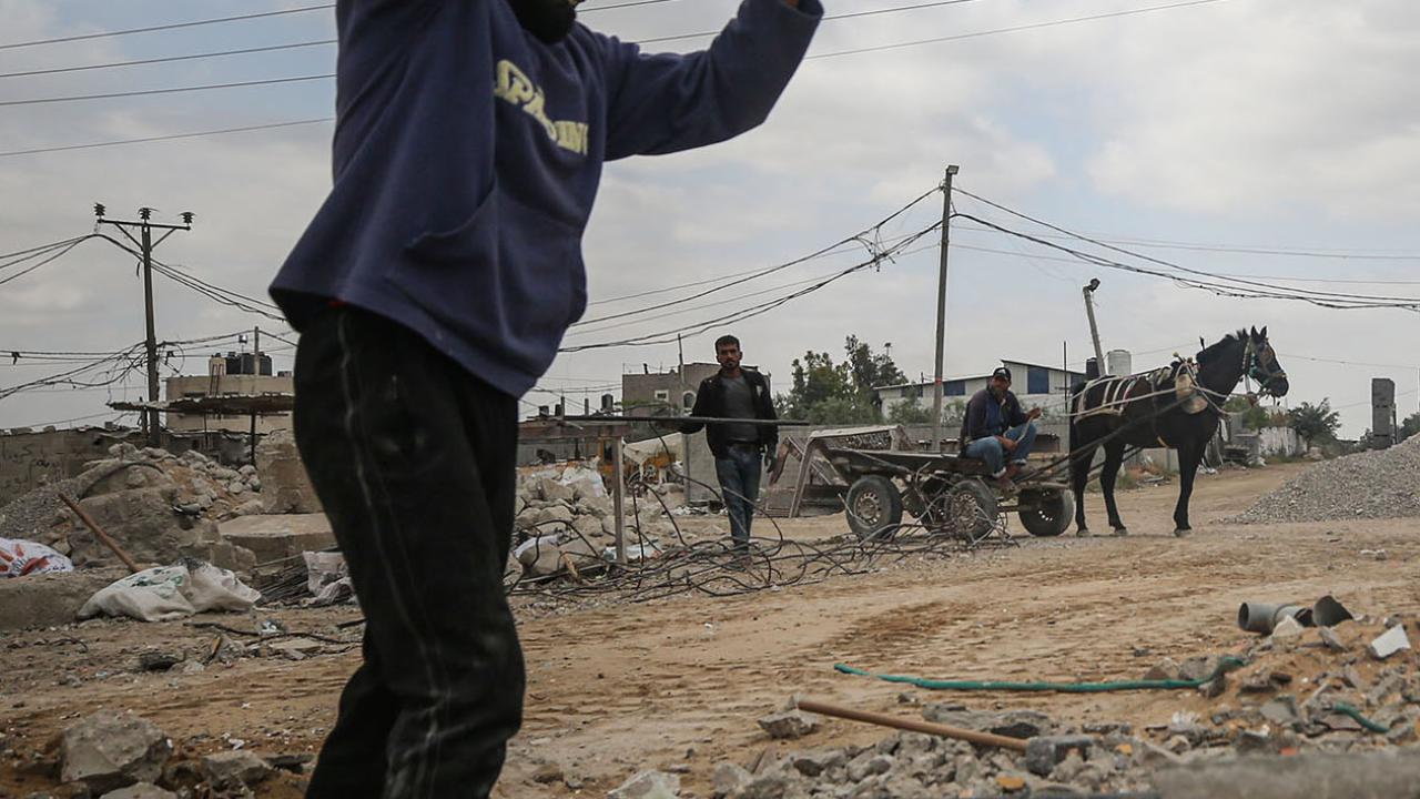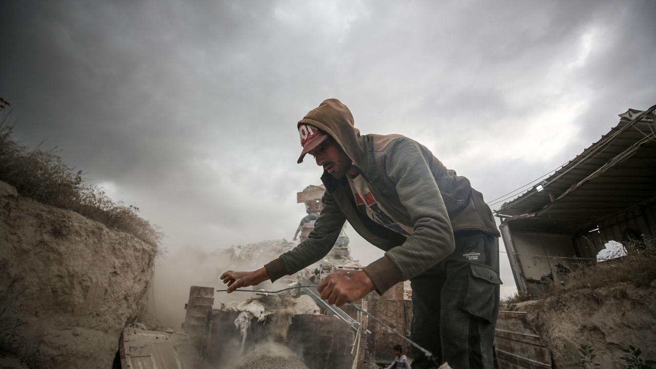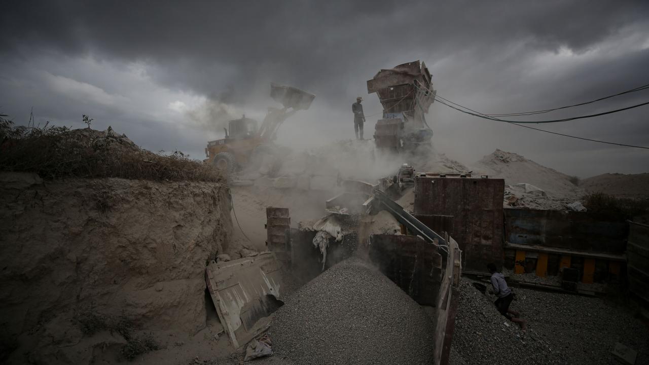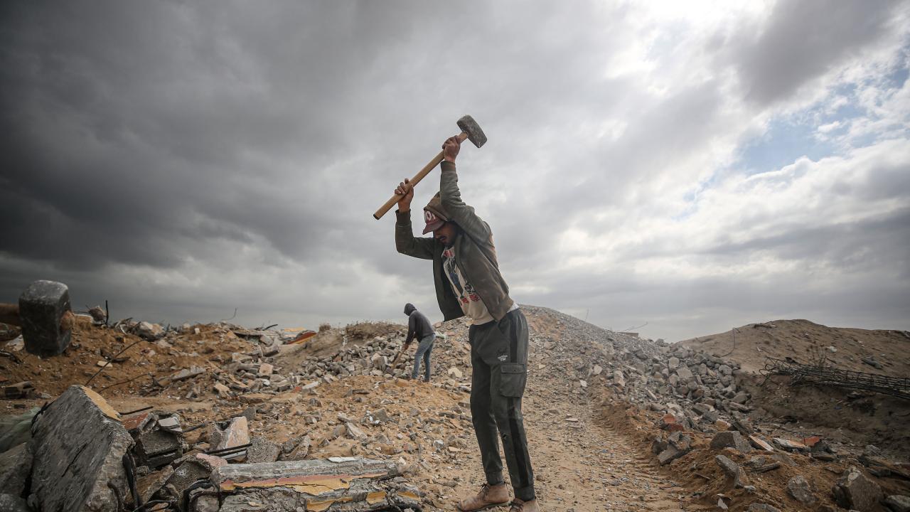Gazze`deki ablukanın devam etmesi sonucu inşaat malzemelerinin az bulunması sebebiyle işçiler, zor şartlarda enkaz arasında topladıkları kullanılmış demirlerin geri dönüşümü için çalışıyor.