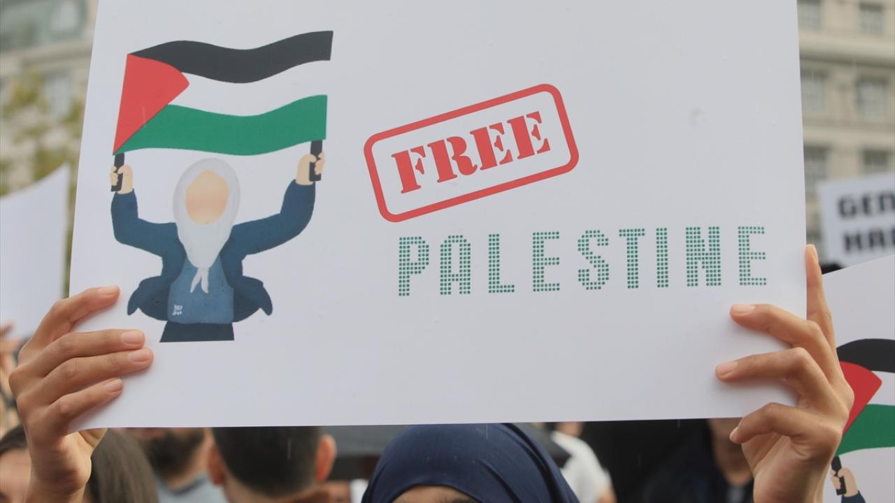 Filistin bayrakları ile Filistin halkına destek mesajlarının yer aldığı dövizler taşıyan göstericiler, `Filistin`e özgürlük` sloganları attı.