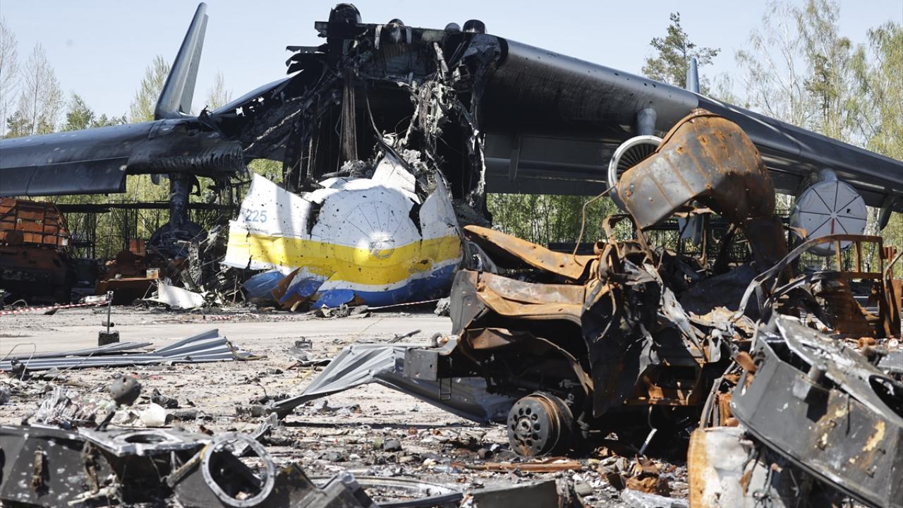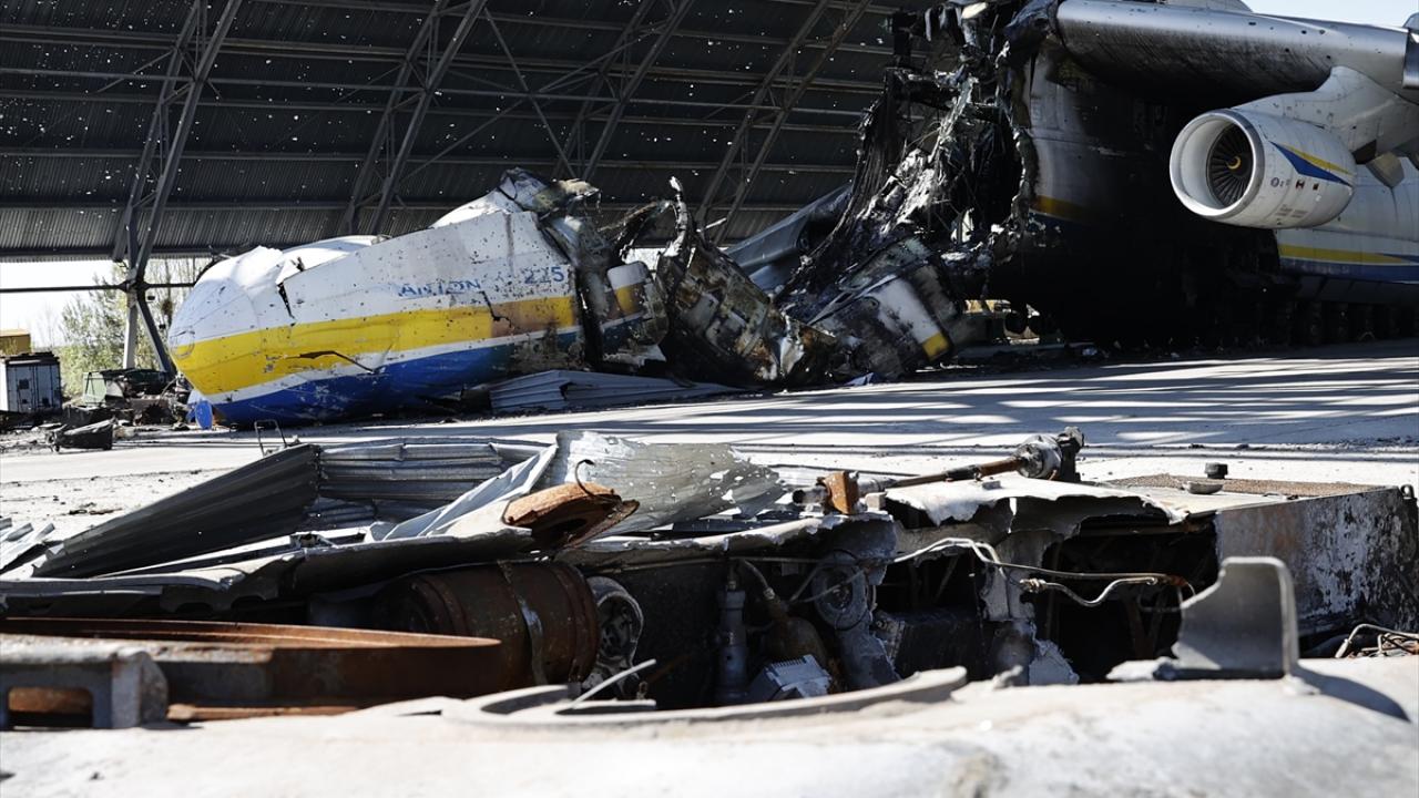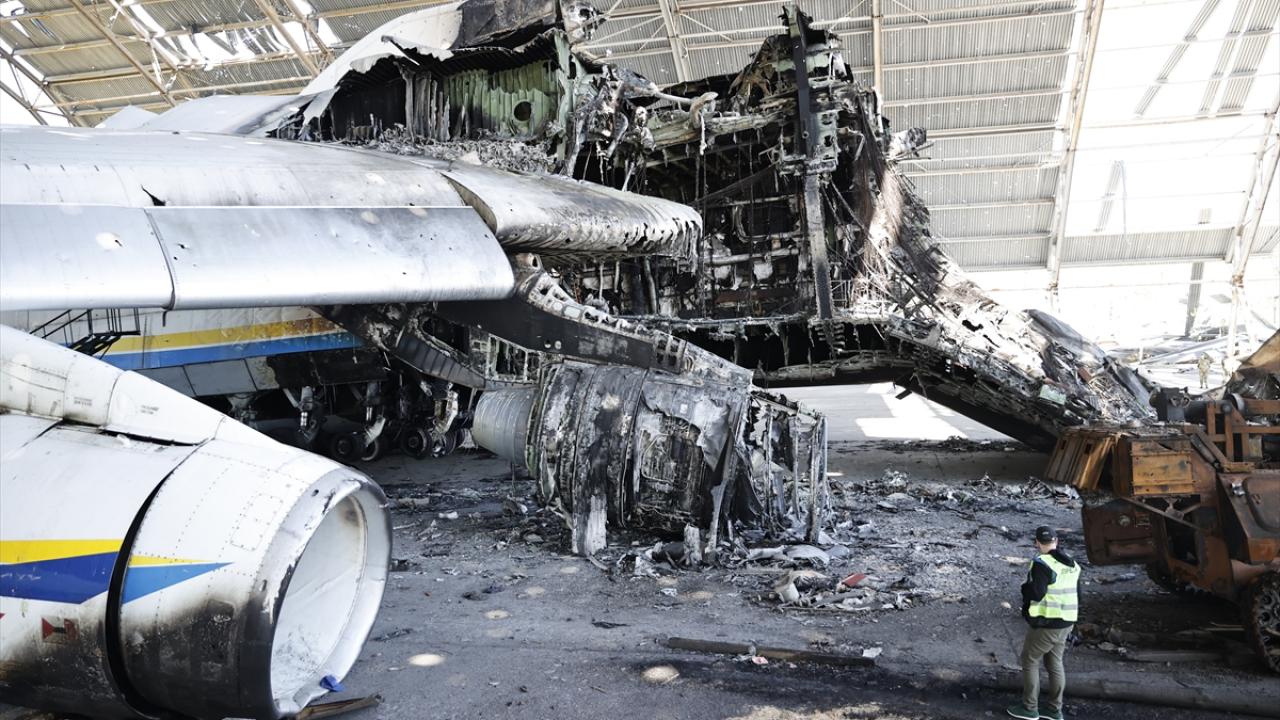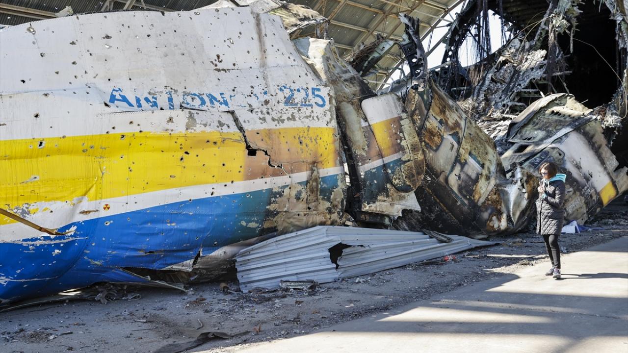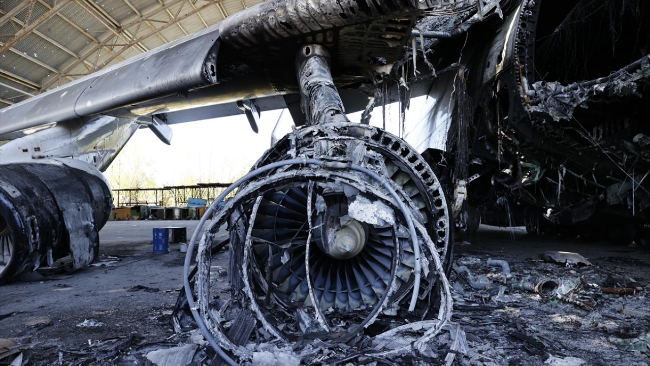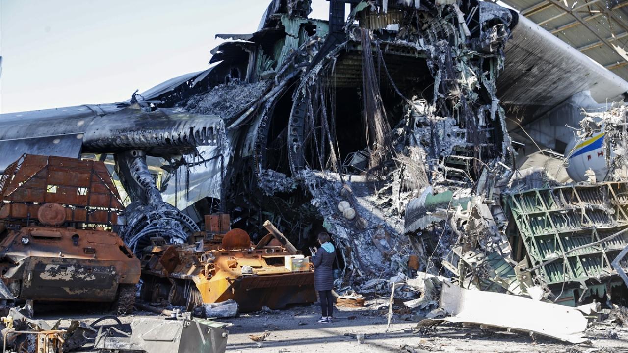 Antonov uçak tesisinde yaşanan ağır çatışmalar sırasında yanmış çok sayda tank ve diğer zırhlı aracın enkazı AN-225`in kanatları altında kalmış durumda.
