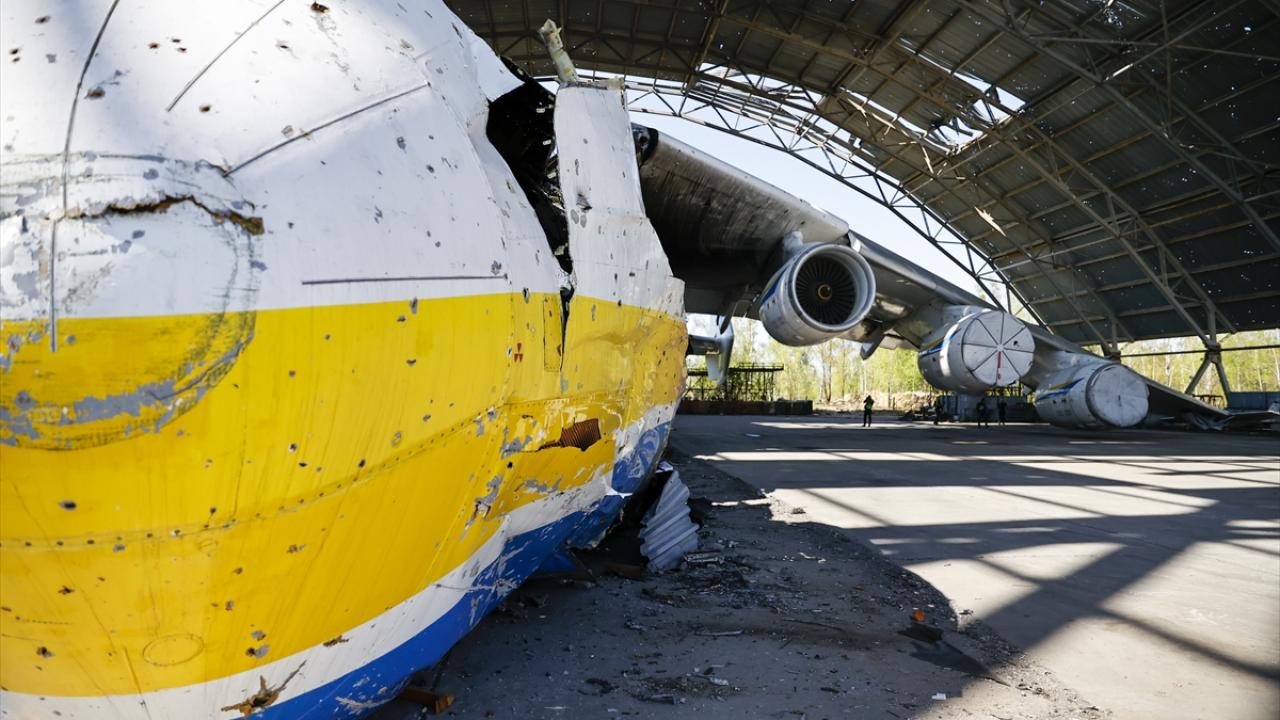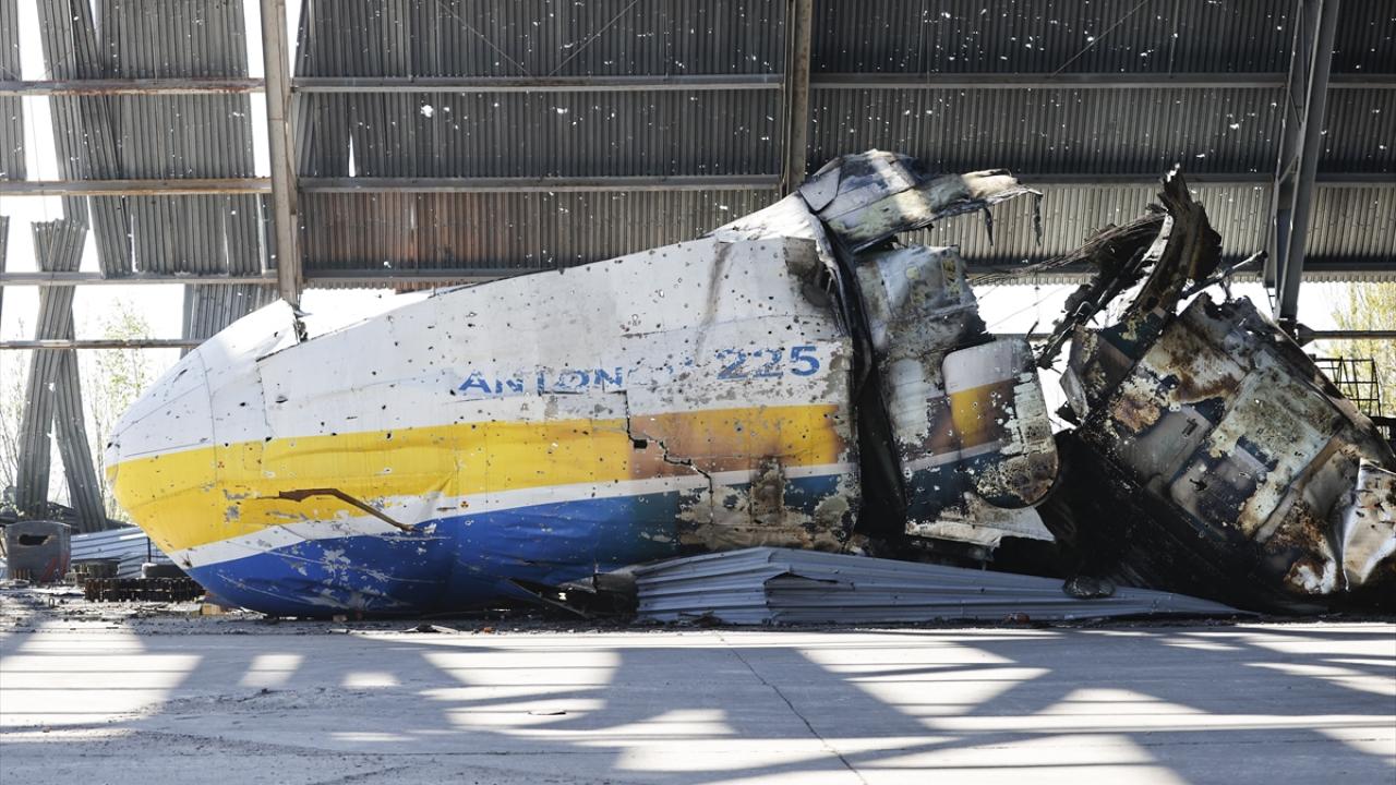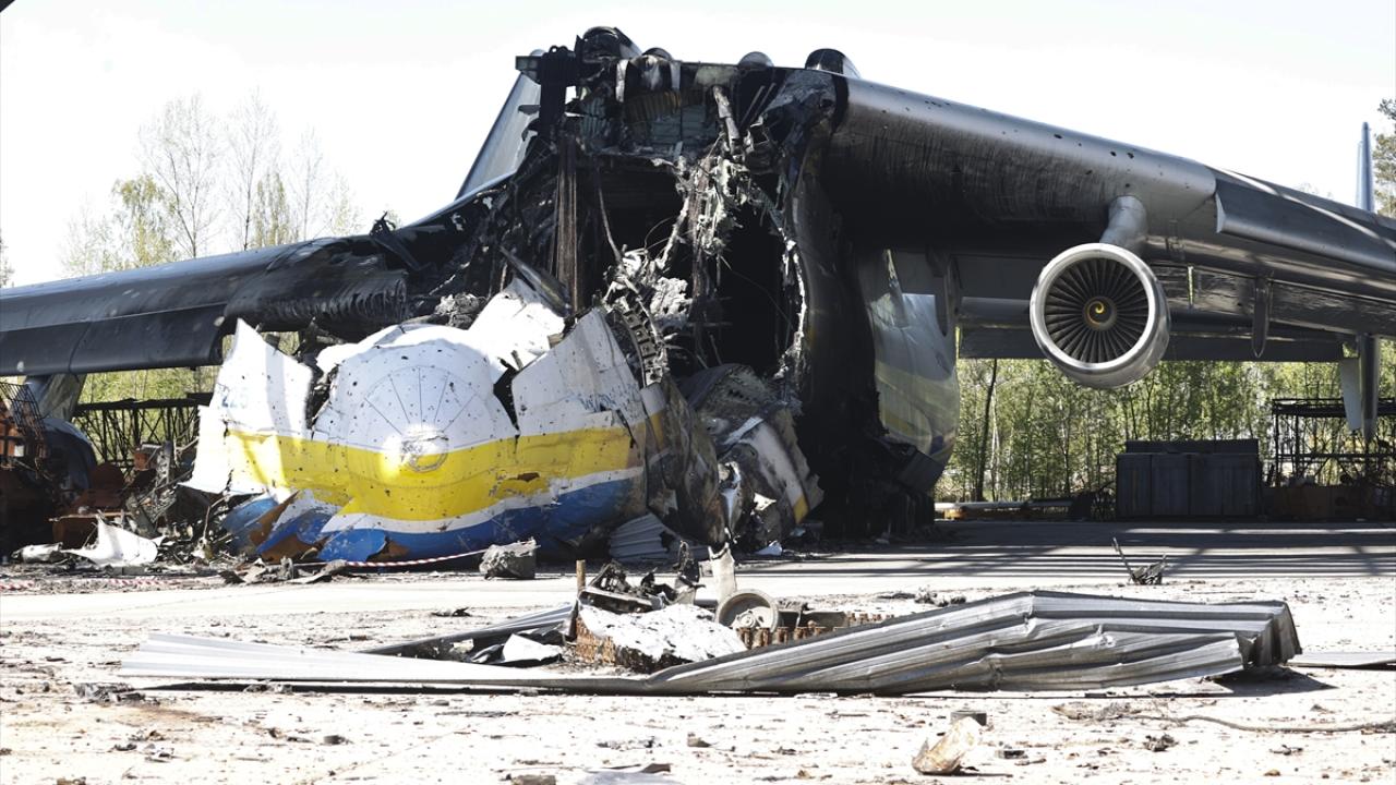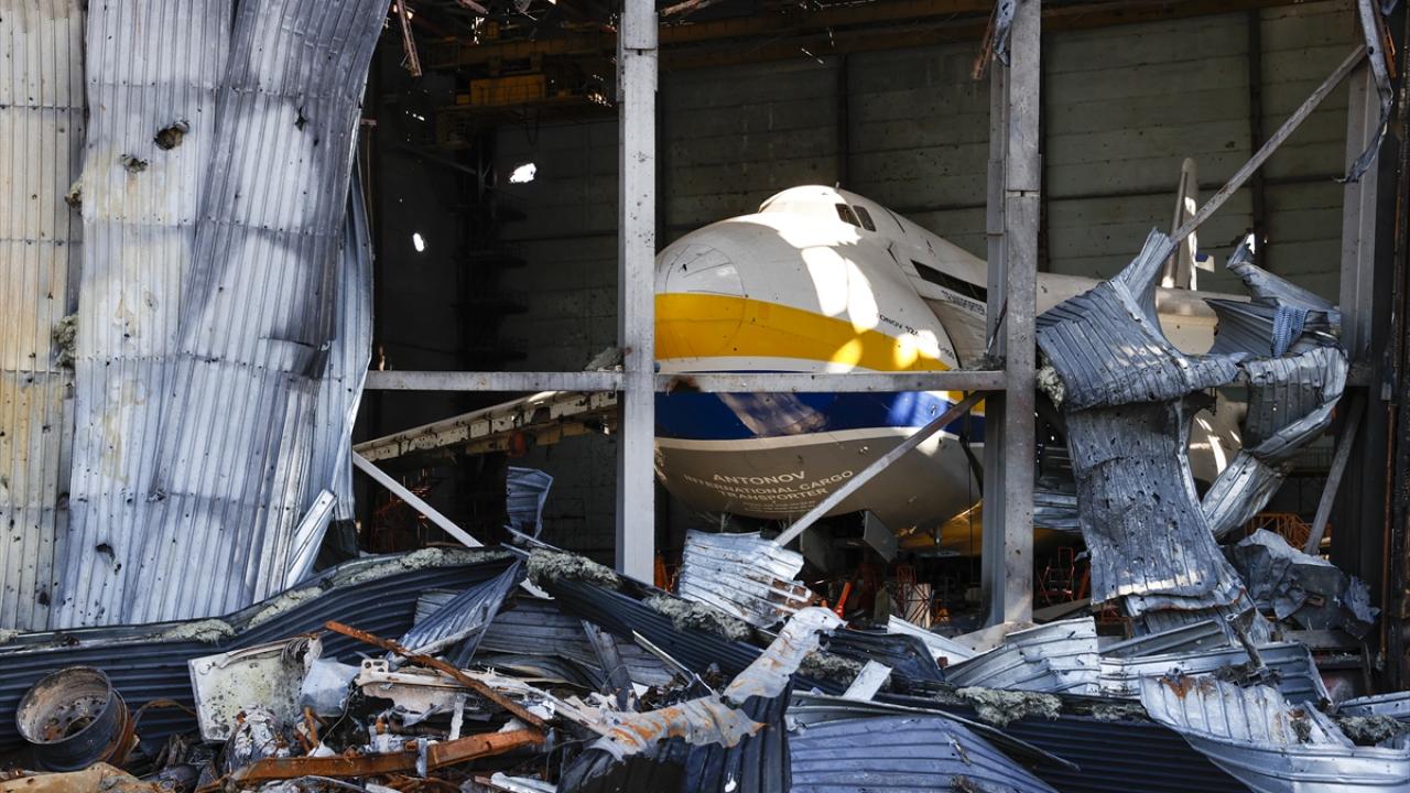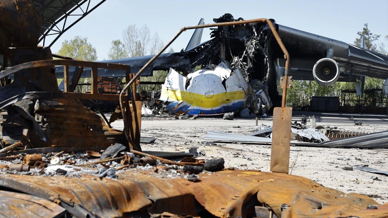 Antonov uçak tesisinde yaşanan ağır çatışmalar sırasında yanmış çok sayda tank ve diğer zırhlı aracın enkazı AN-225`in kanatları altında kalmış durumda.