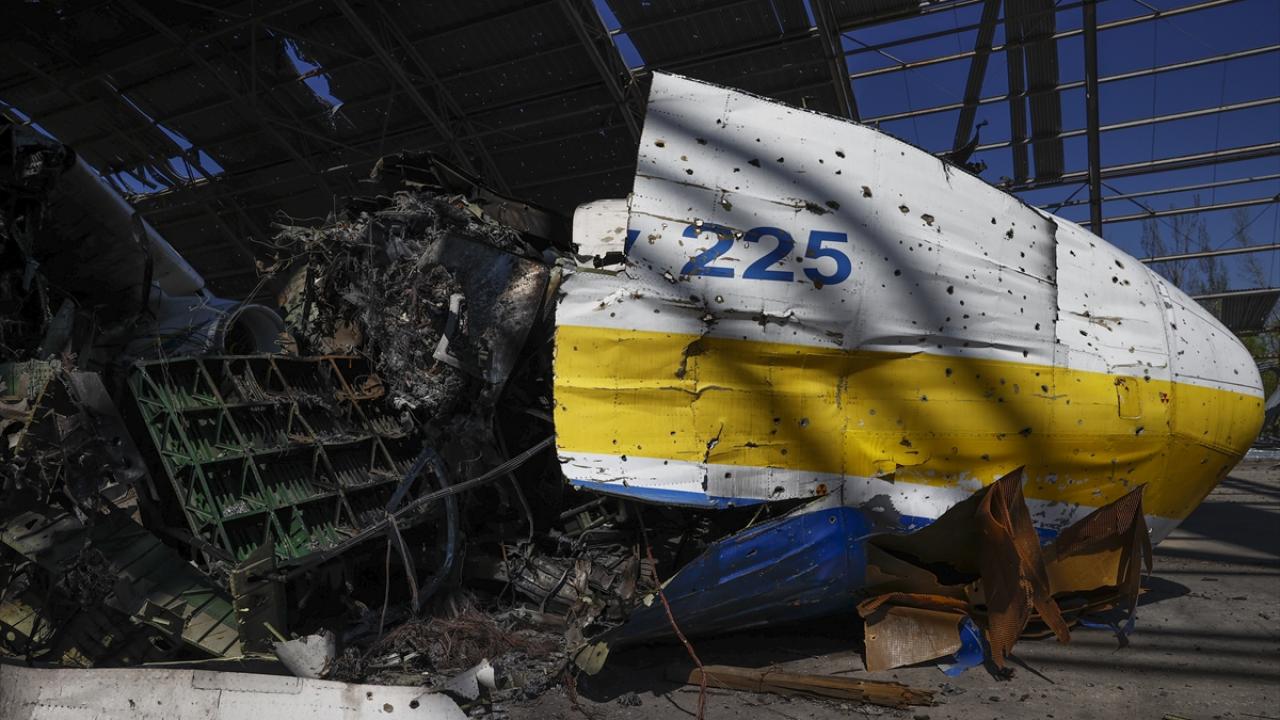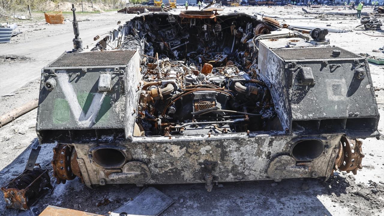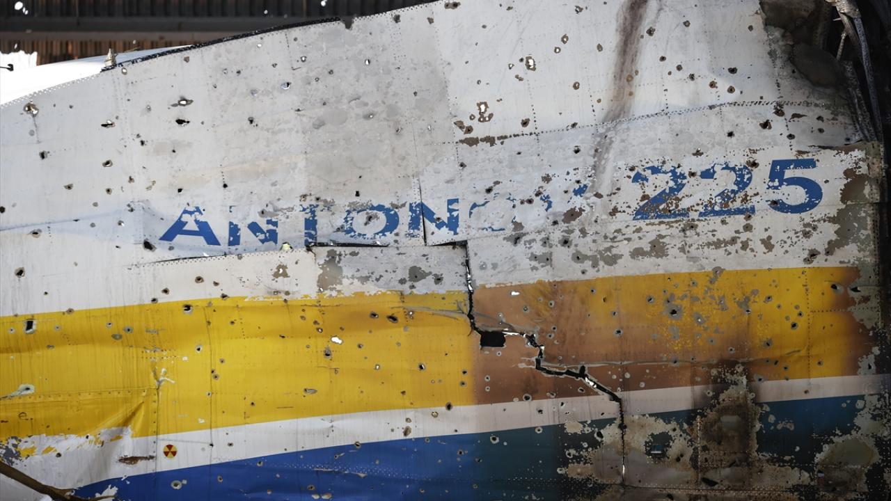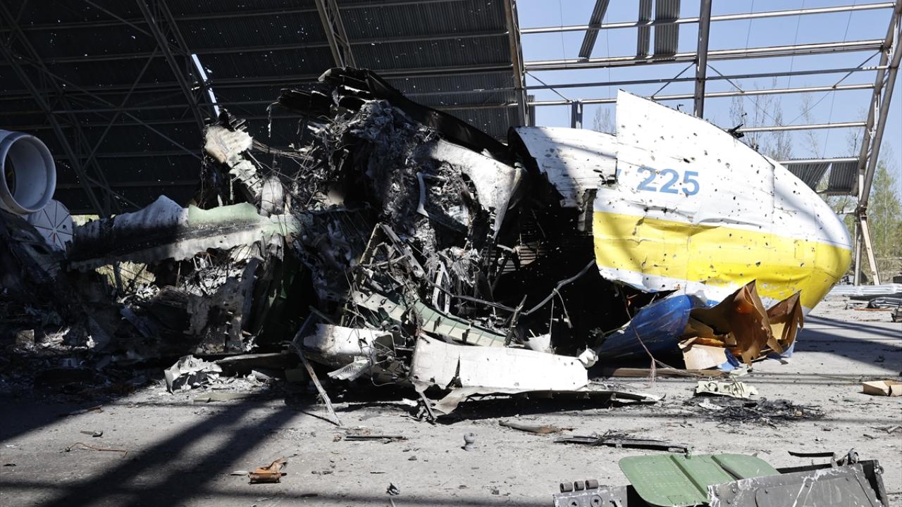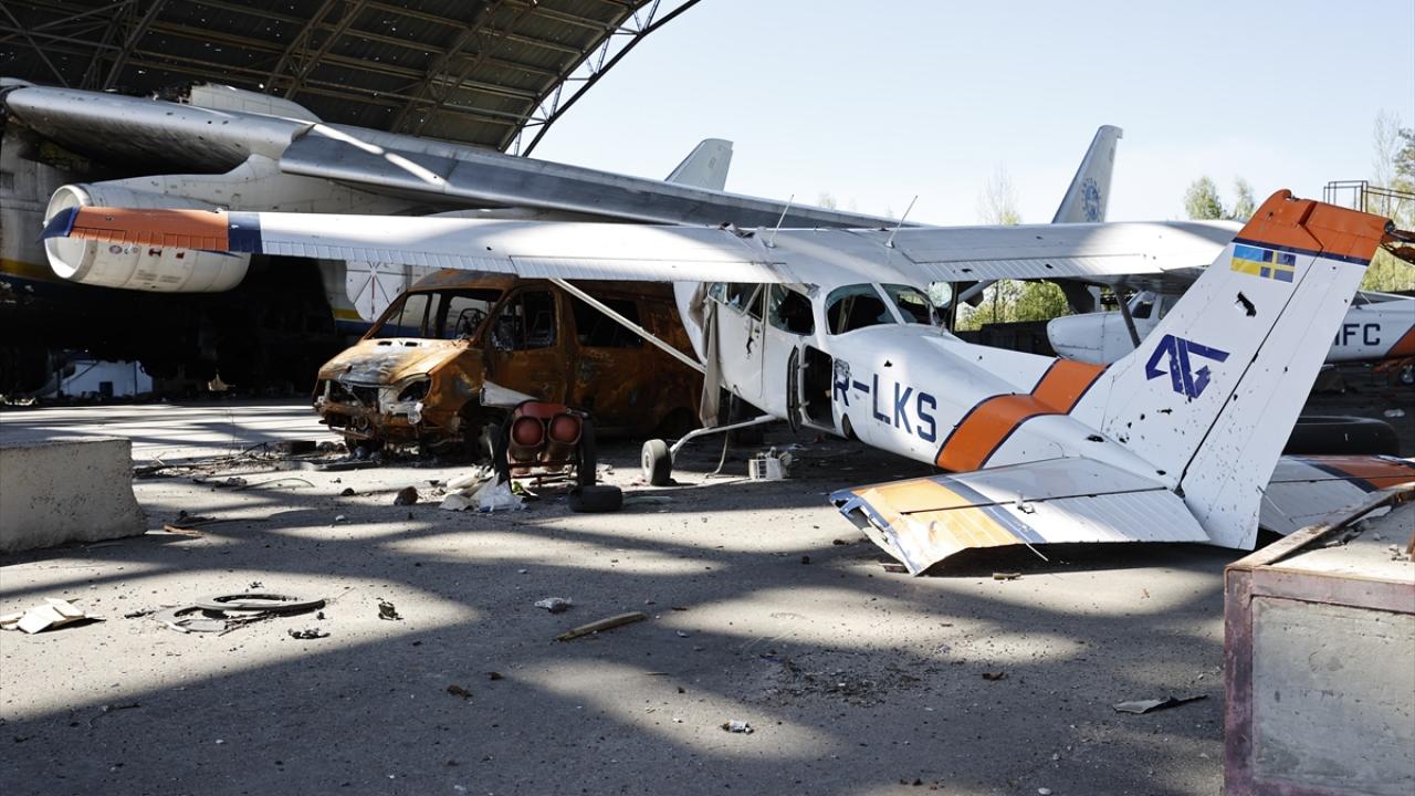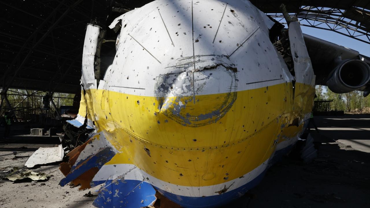 Antonov uçak tesisinde yaşanan ağır çatışmalar sırasında yanmış çok sayda tank ve diğer zırhlı aracın enkazı AN-225`in kanatları altında kalmış durumda.