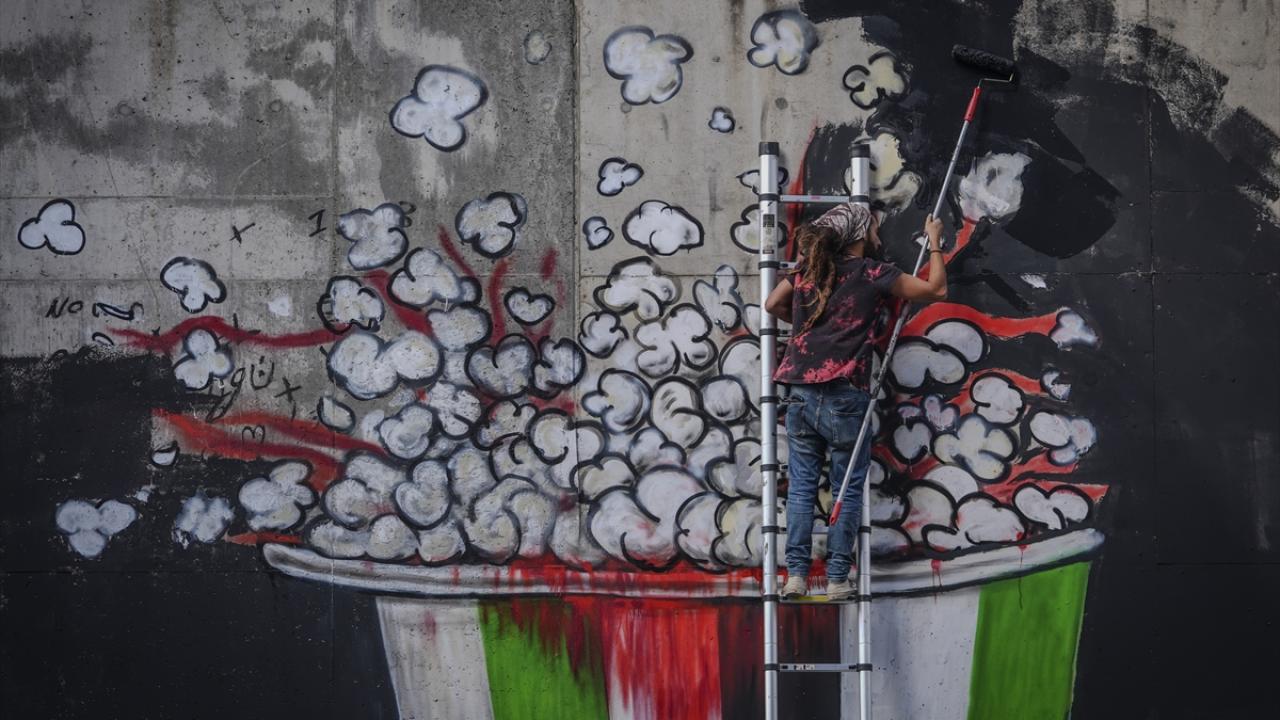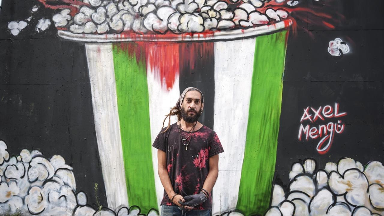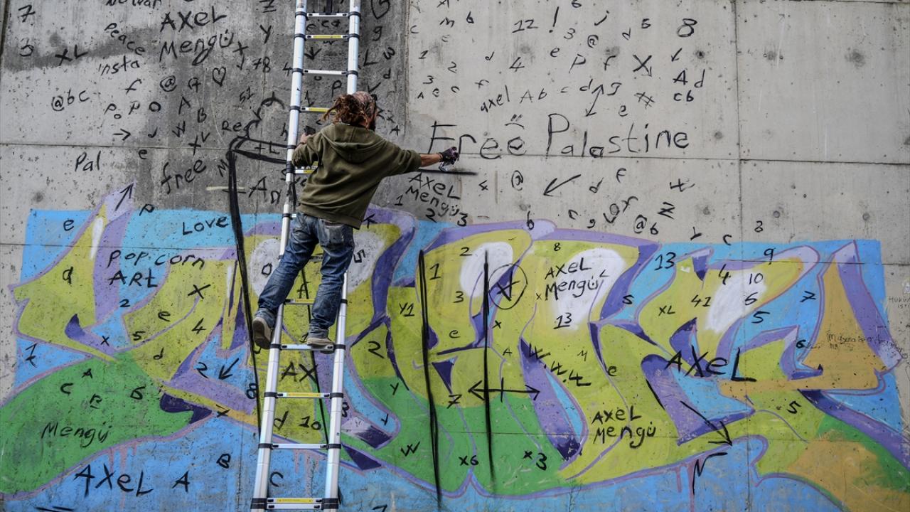 İsrail'in Gazze'deki saldırılarında çocukların, kadınların ve gazetecilerin hayatını kaybetmesine sessiz kalan dünyaya dikkati çekmek isteyen mural sanatçısı Axel Mengü, İstanbul'da "Dünya İzlerken" adlı mural çalışması yaparak, işlenen insanlık suçuna karşı sessizliği sanatın diliyle gözler önüne serdi.