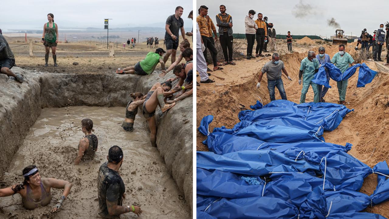 Eğlenmek için çamur birikintisi olan çukura girenler ve İsrail`in öldürdüğü Gazzelilerin toplu mezarlara gömülmesi...