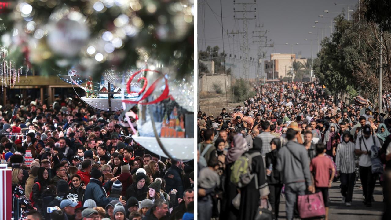 Bir tarafta insanlar yeni yıl için alışverişe çıkarken, diğer tarafta İsrail`in Gazze`de "zorla" yerinden ettiği yüz binlerce Filistinli...