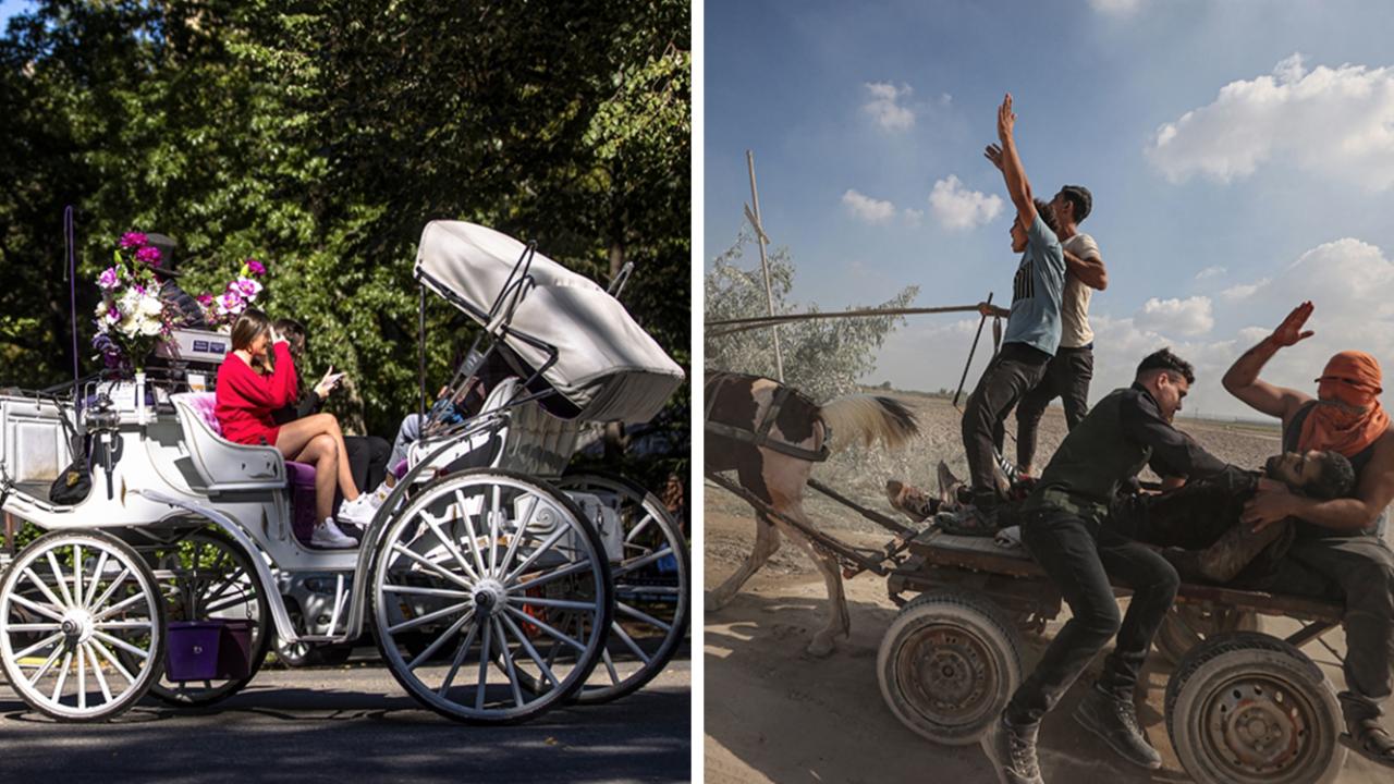 Turistik bir gezi için at arabası kullananlara karşın, İsrail`in saldırılarında yaralananları hastaneye ulaştırmak için at kullananlar...