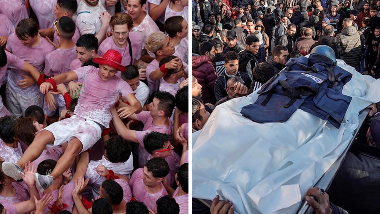 Bir festival için üzerlerini, yüzlerini boyayanların eğlence için bir kişiyi el üstünde tutmasına karşın; İsrail`in Gazze`deki katliamında hayatını kaybeden bir gazetecinin cenaze töreni...