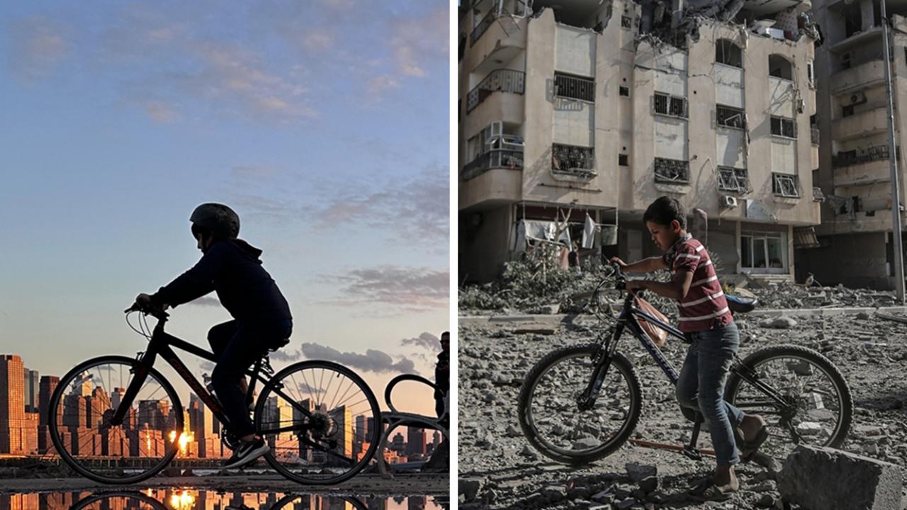Bir tarafta özgürce bisikletini süren bir çocuk; diğer tarafta ise İsrail`in bombardımanı altında ailesine ekmek ulaştırmaya çalışan bir çocuk.
