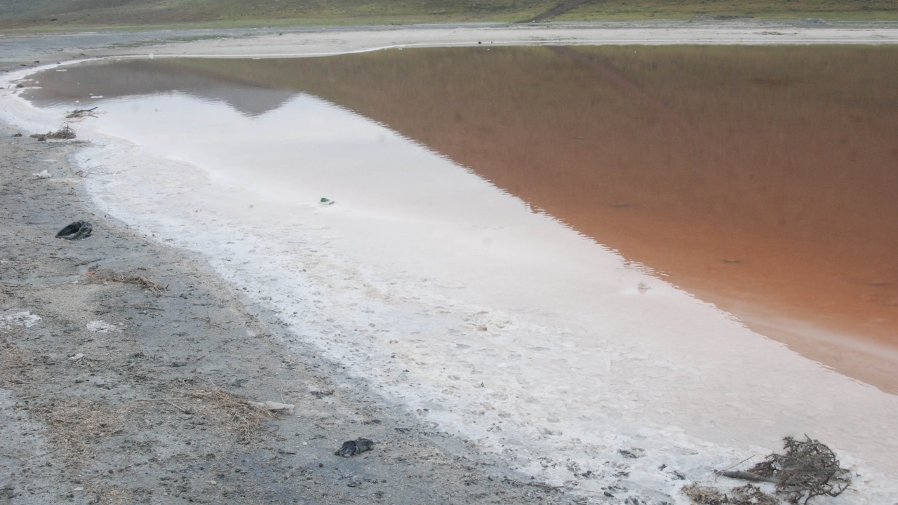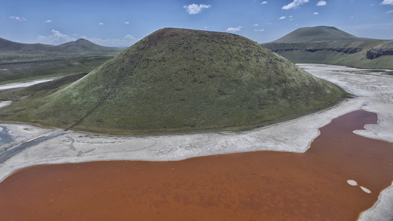 Konya'da bulunan Meke Gölü, yeraltı sularının çekilmesi nedeniyle kurudu. Neredeyse bir avuç kadar kalan suyun rengi de mikroorganizma nedeniyle kırmızıya döndü.