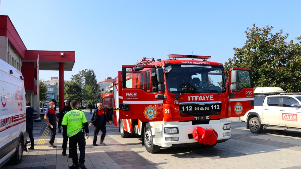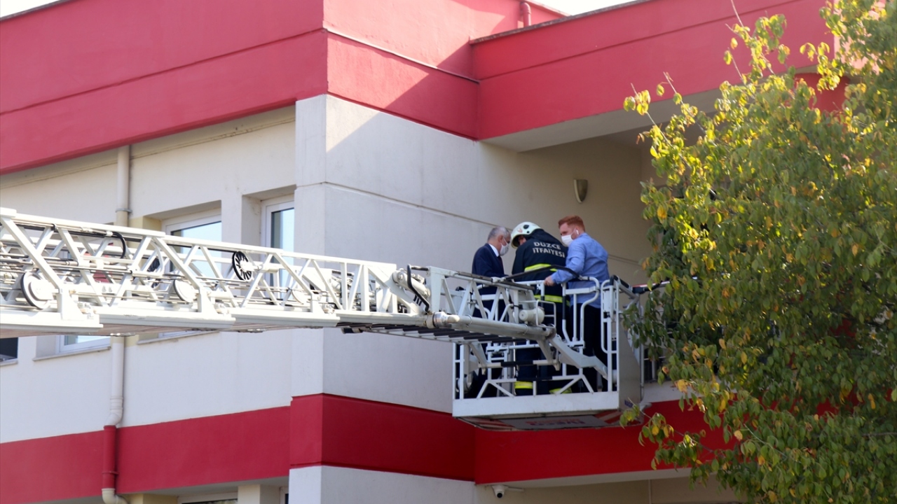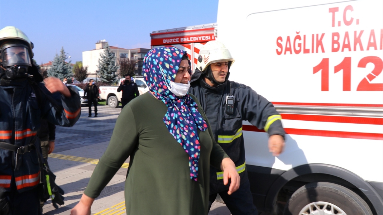 Düzce Belediyesine bağlı itfaiye ekipleri, merdivenli araç yardımıyla, gazdan etkilenen idari personeli camdan tahliye etti.