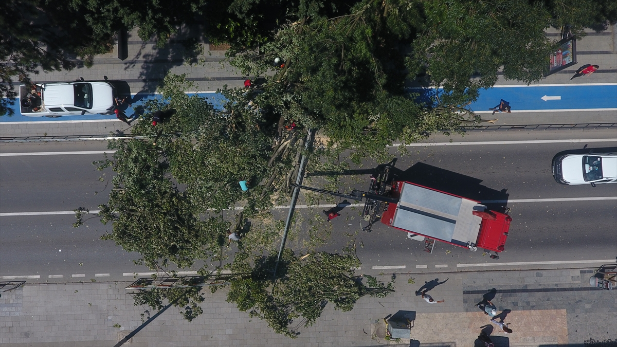 Görüntülerde, ağacın gürültüyle yola devrilmesi, bu sırada caddede yürüyen insanların kaçışması yer alıyor.