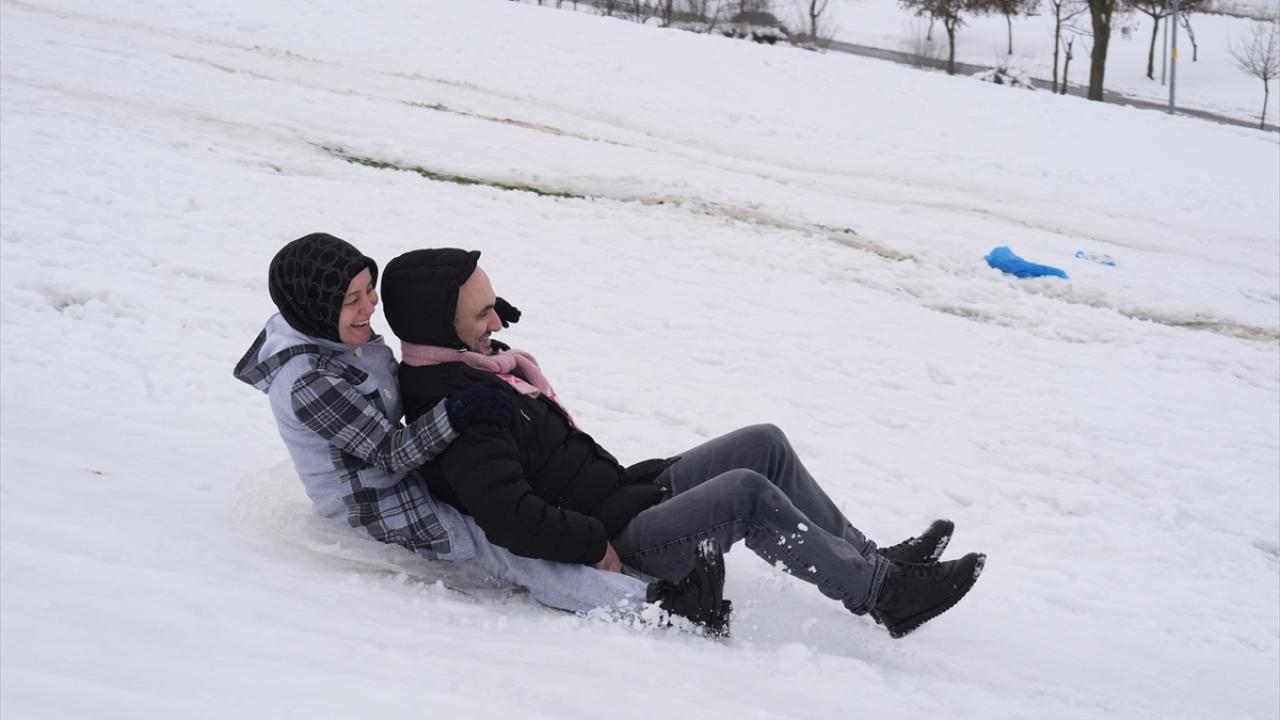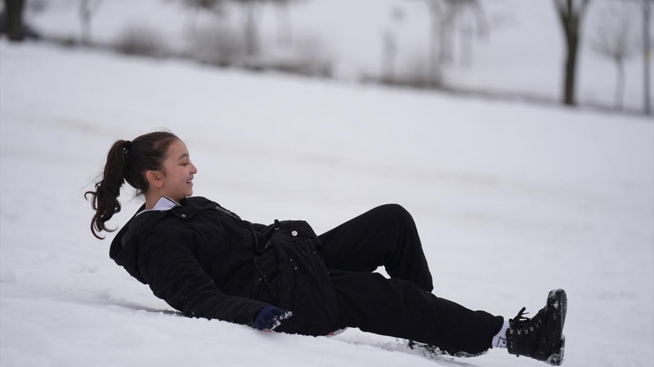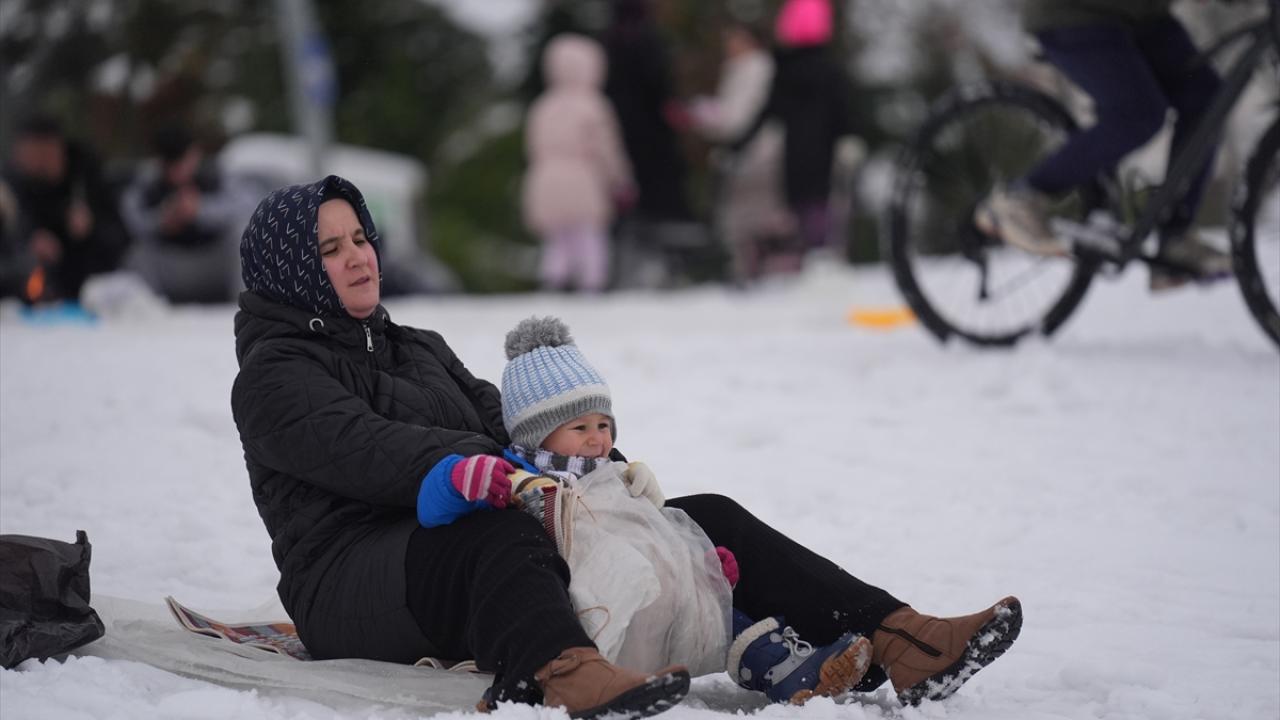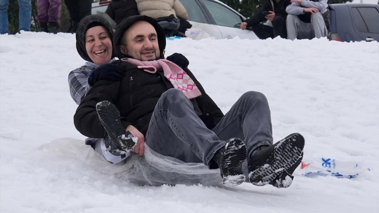 Olumsuz hava koşuları nedeniyle okulların tatil edilmesinin ardından çocuklar, aileleriyle yüksek kesimlerde biriken karlı alanlara çıktı.