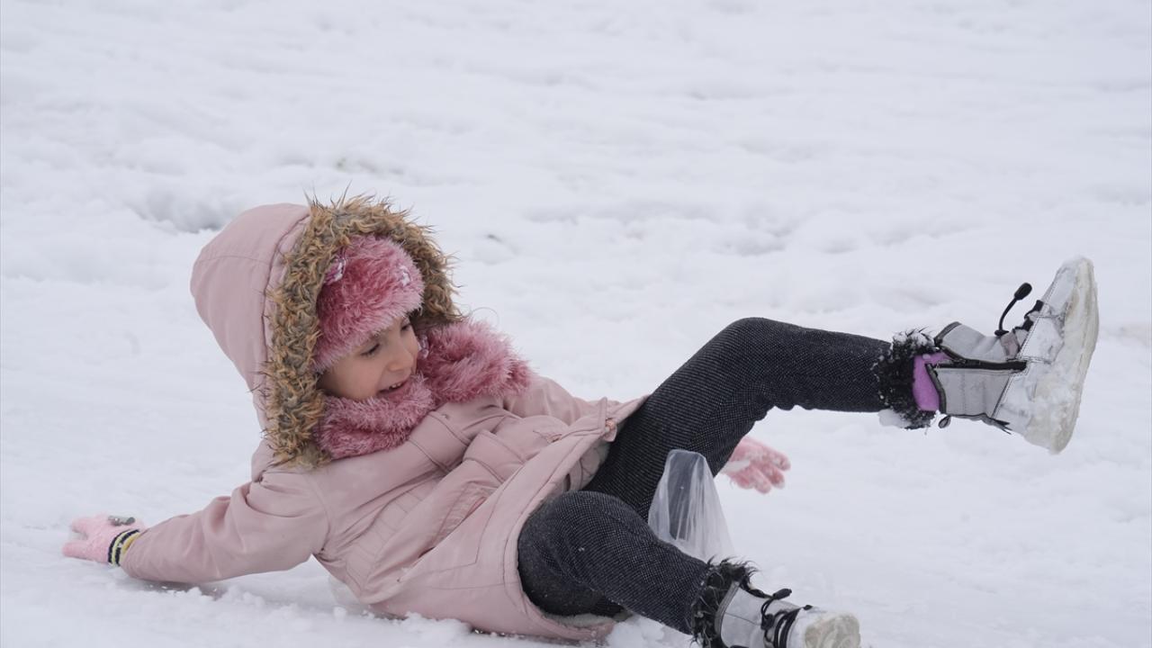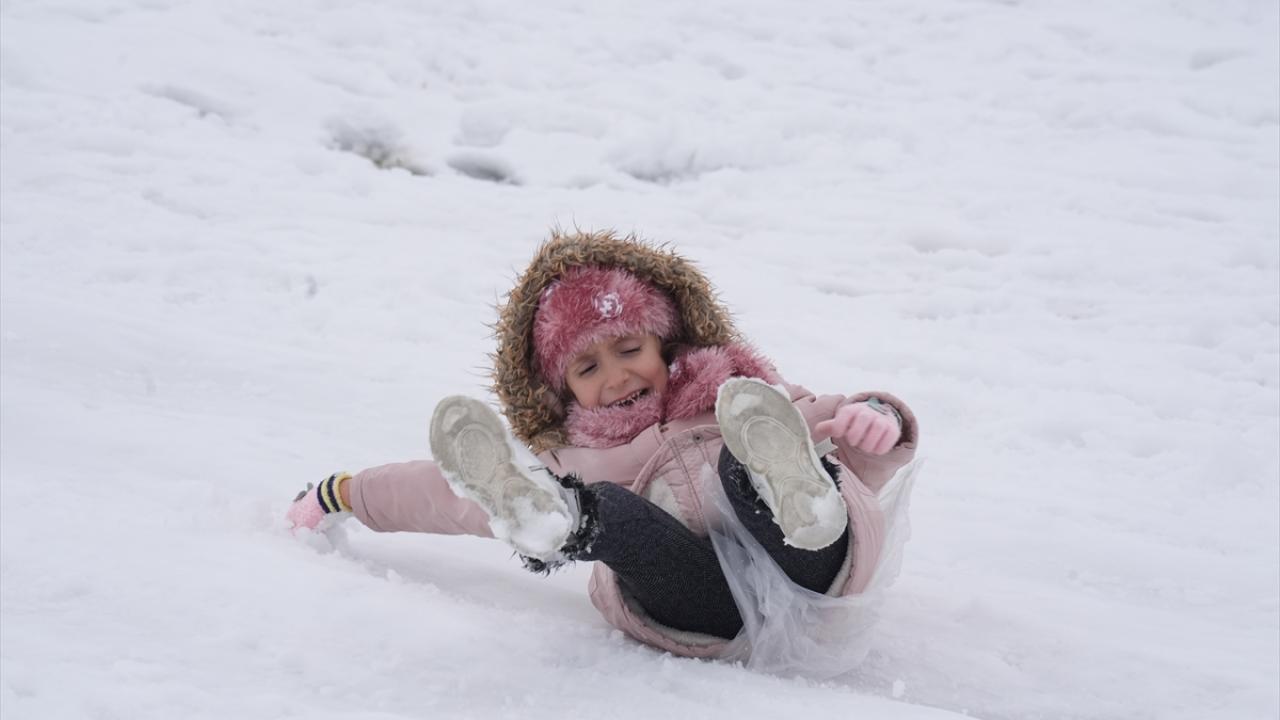 Yanlarında getirdikleri kızak, naylon, şambrel, mont ve poşetleri kayak malzemesi olarak kullanan çocuklar, tepelik alanlardan kaydı, kar topu oynadı.