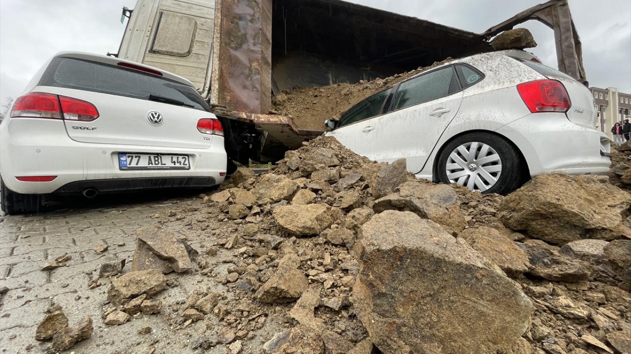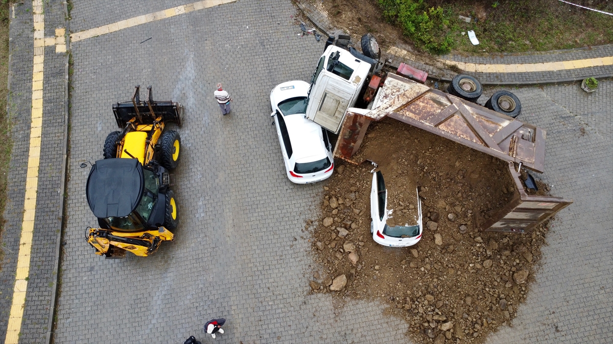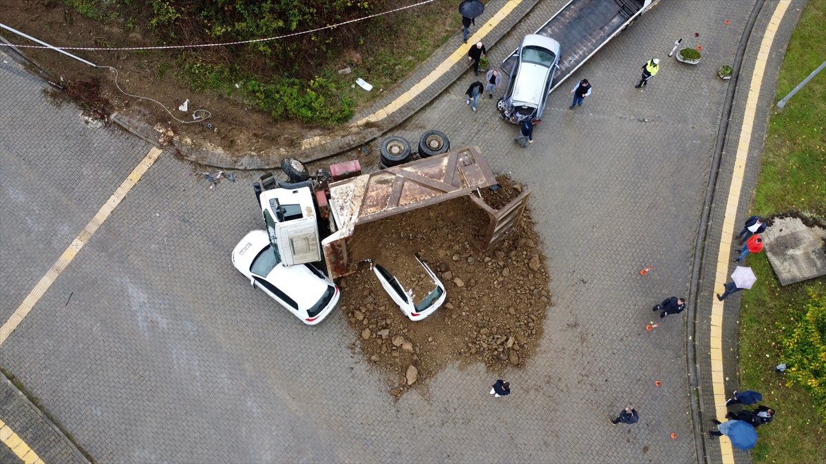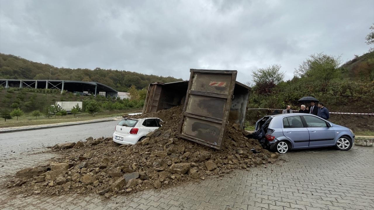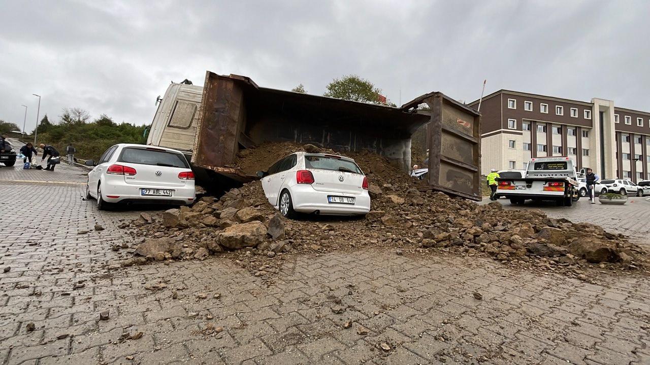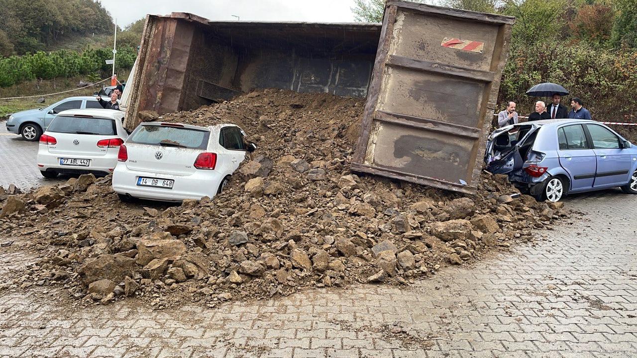 Kontrolden çıkan kamyon, daha sonra park halindeki 3 aracın üzerine devrildi.