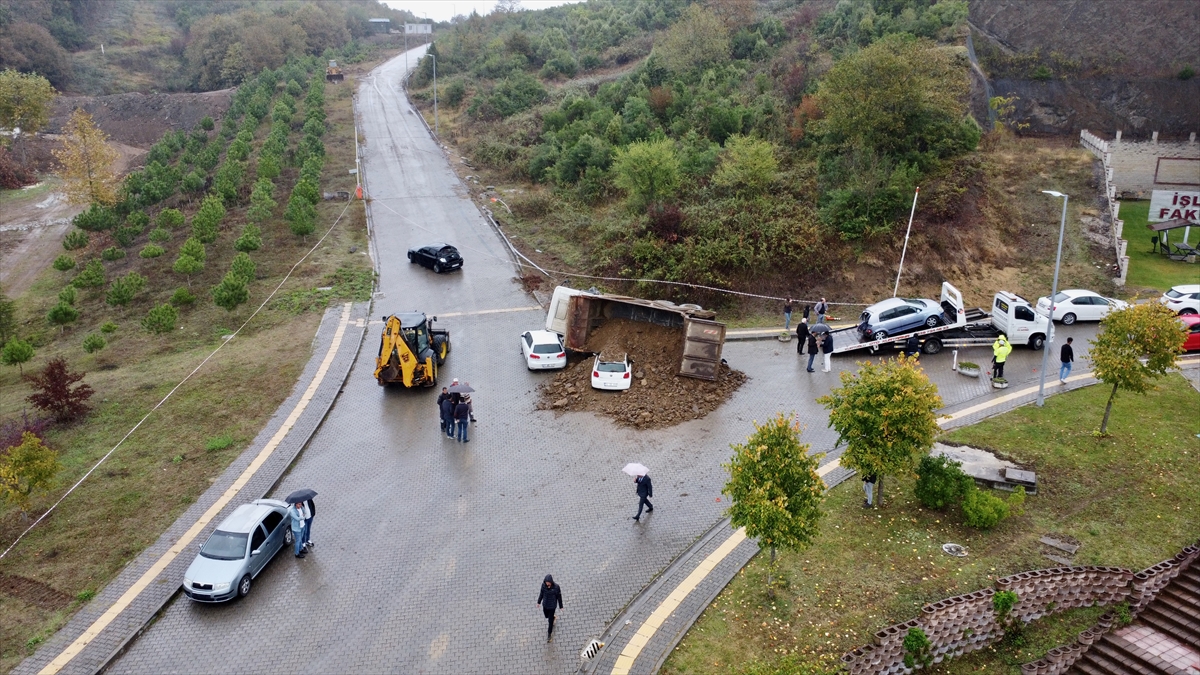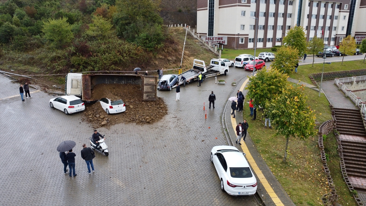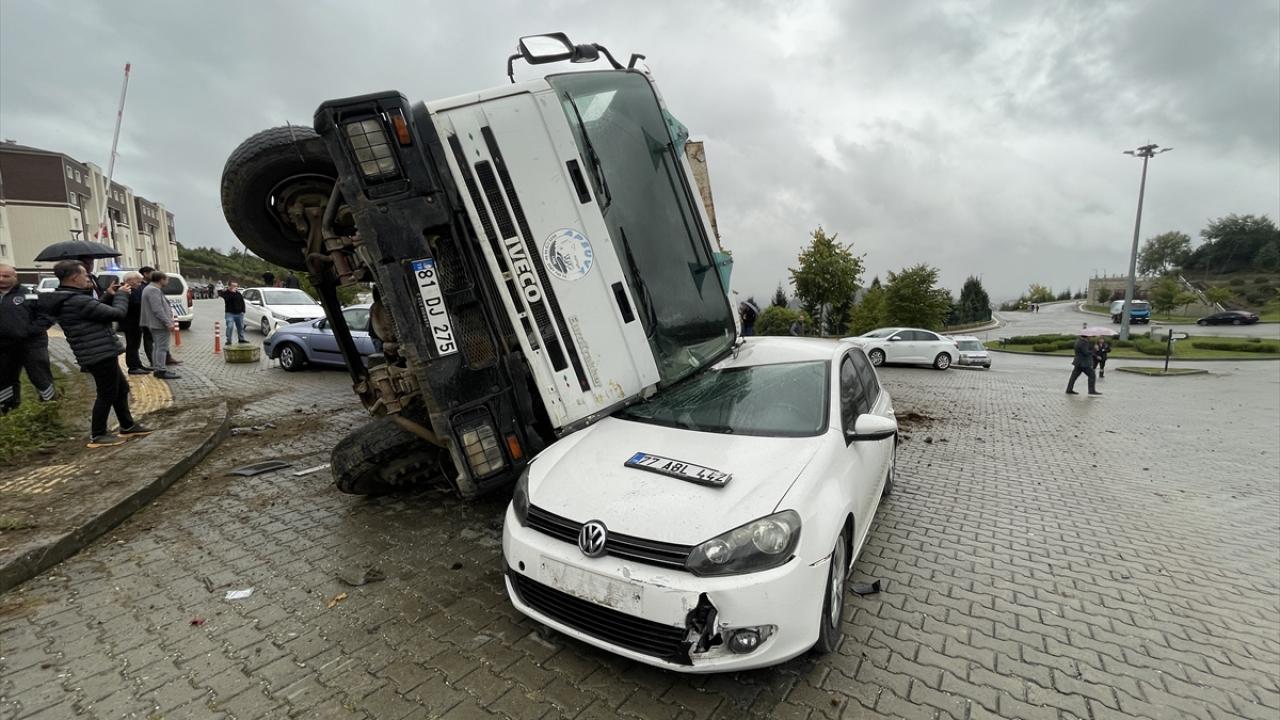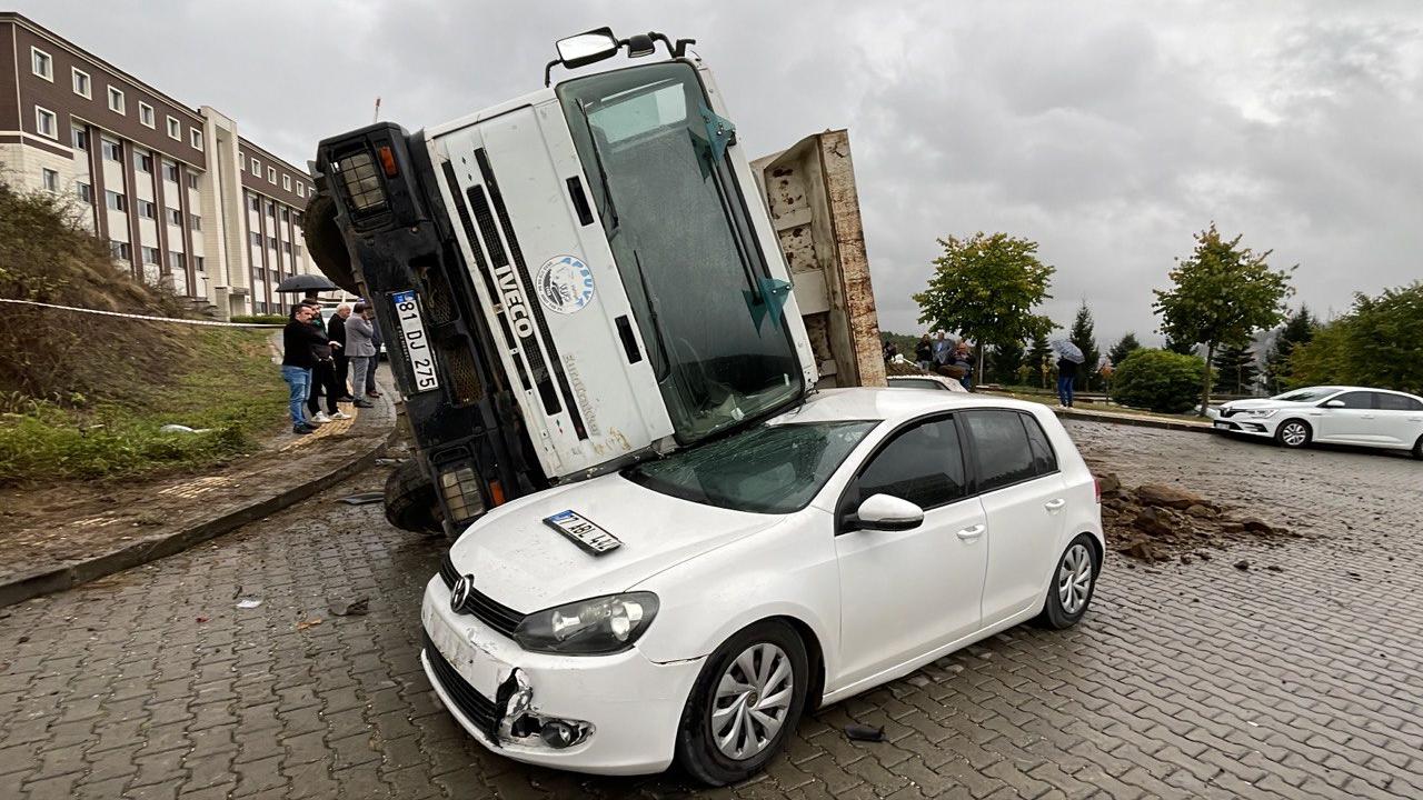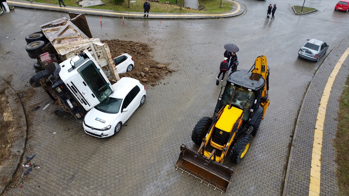 Düzce Üniversitesi Fen Edebiyat ve İşletme fakülteleri mevkisinde yürütülen doğalgaz hat taşıma çalışması sırasında Y.A`nın kullandığı 81 DJ 275 plakalı hafriyat yüklü kamyon, geri manevra yaparken park halindeki 2 otomobile çarptı.