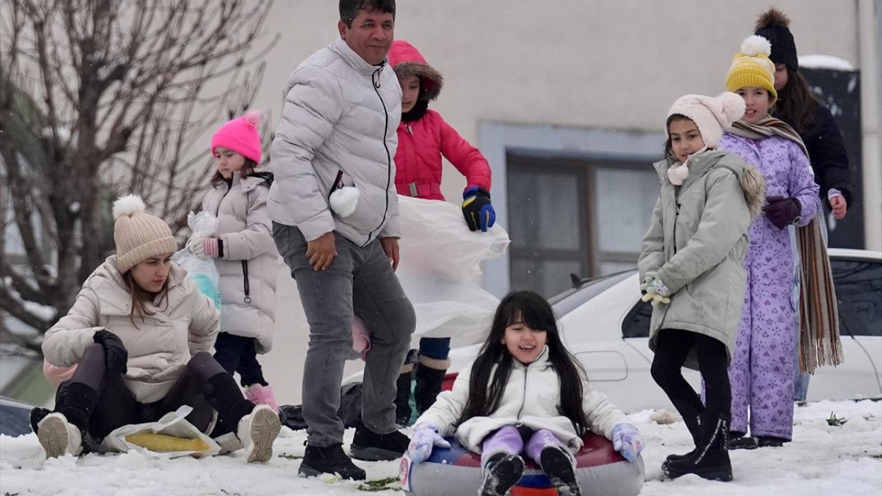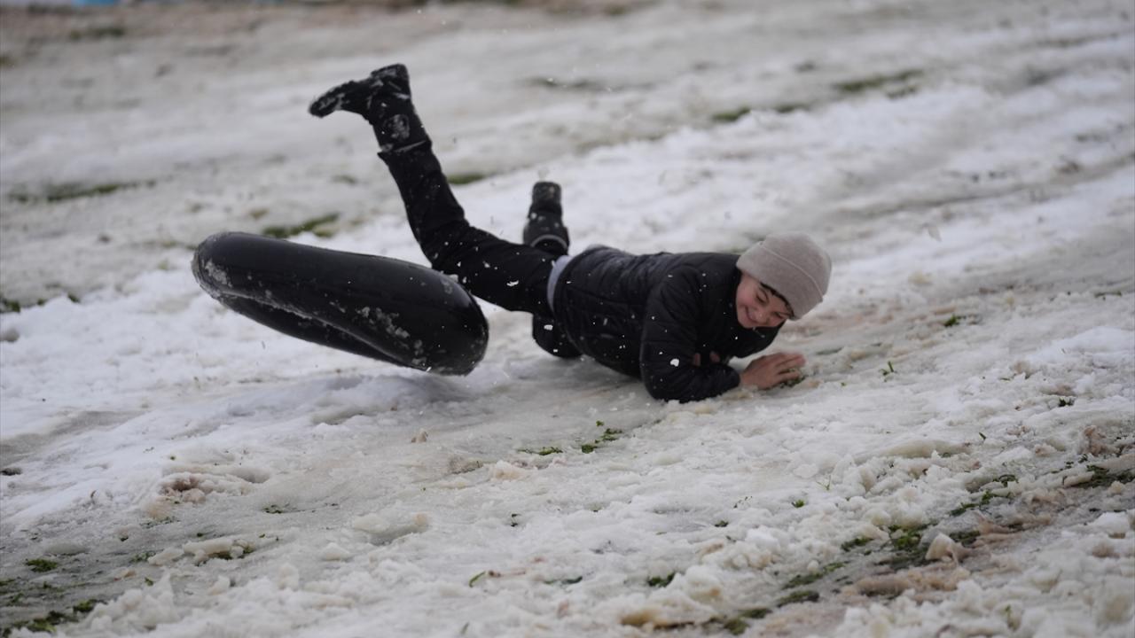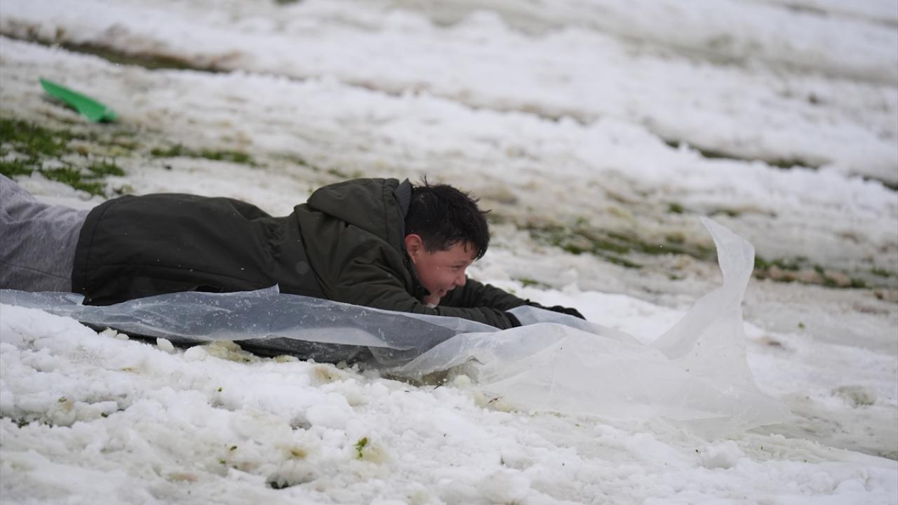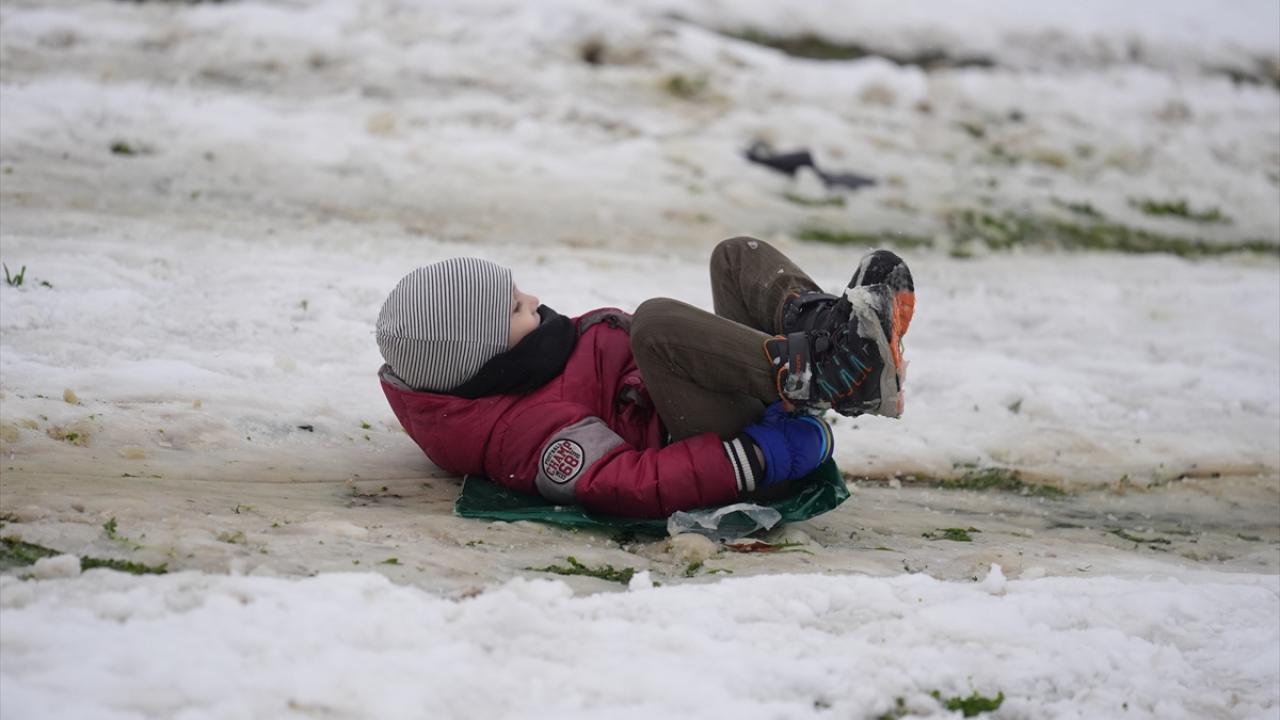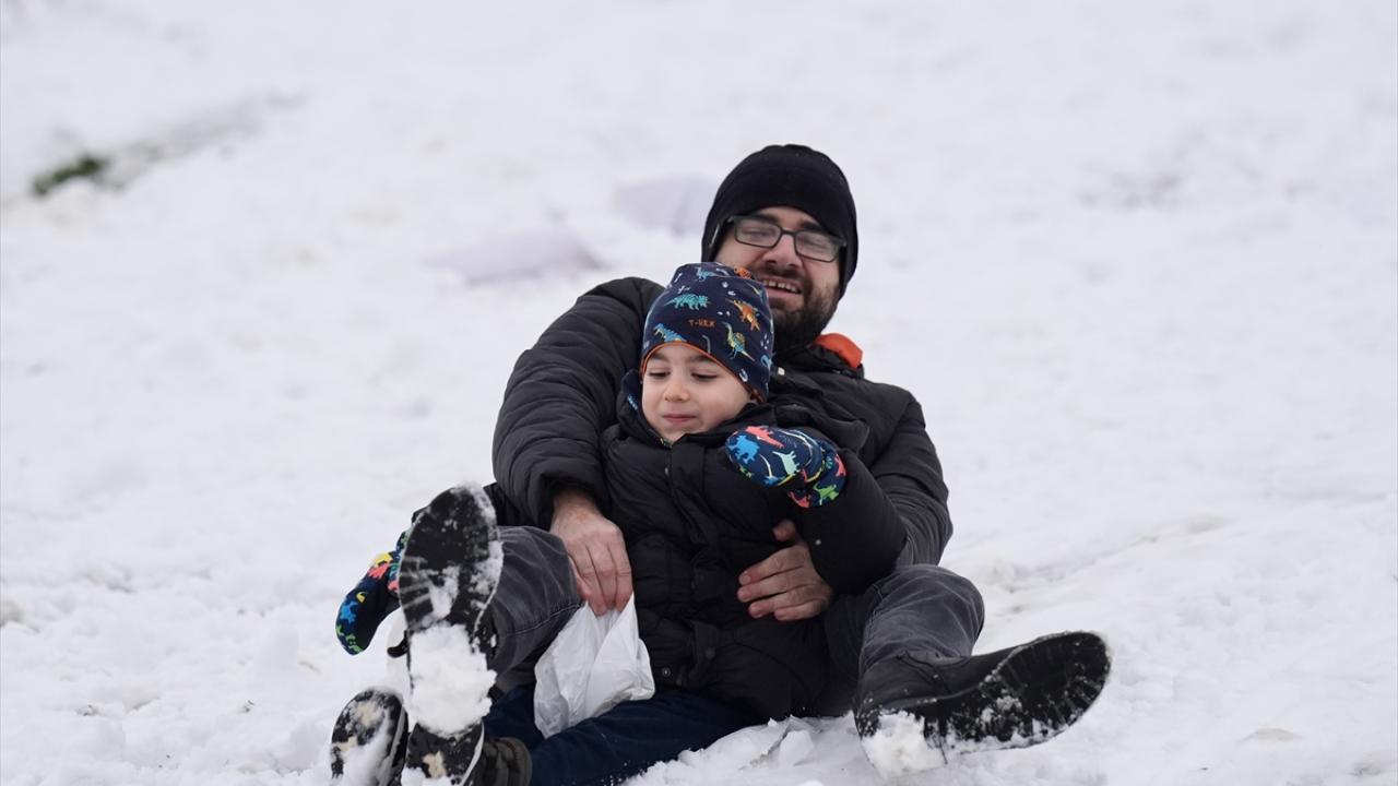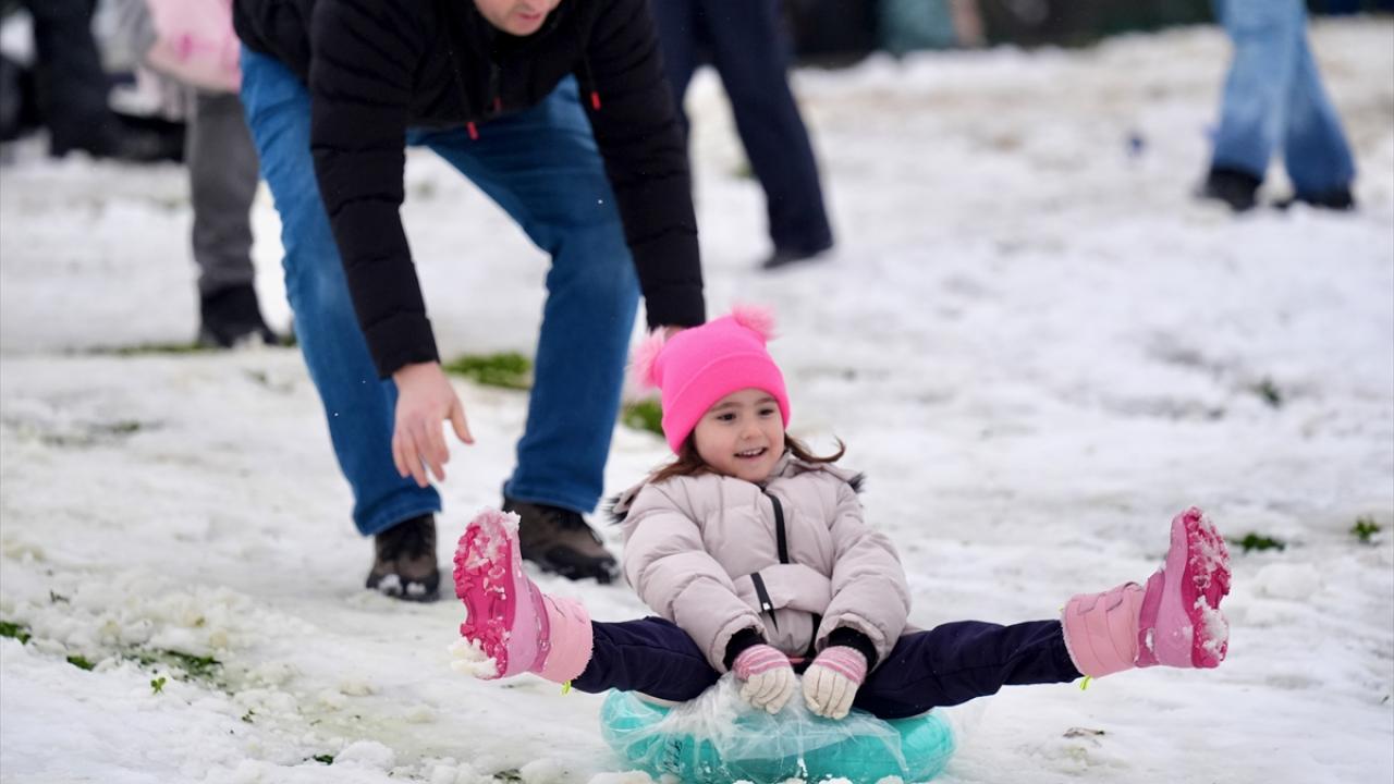Düzce'de kar yağışı nedeniyle eğitime 1 gün ara verilmesini fırsat bilen çocuklar, kızakla kaydı, kar topu oynadı.