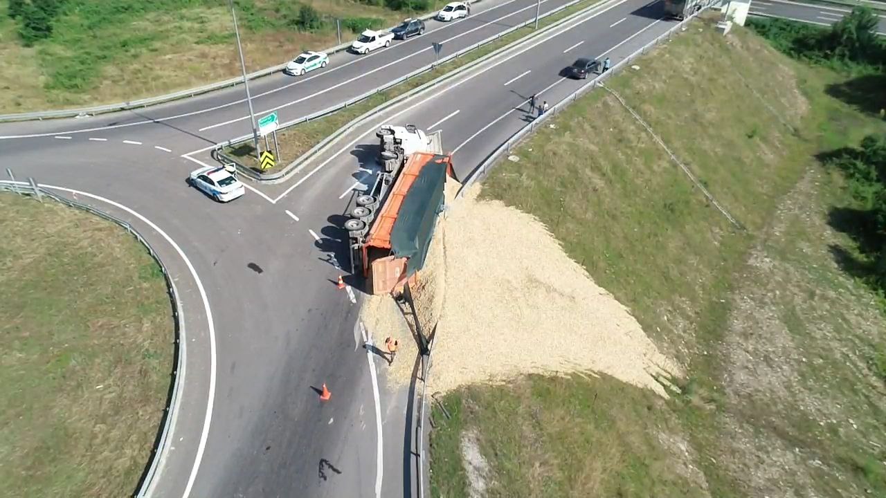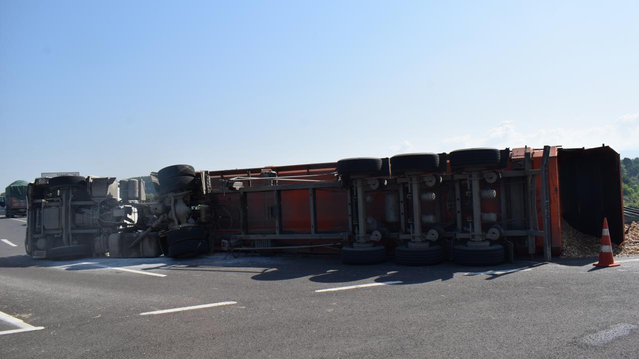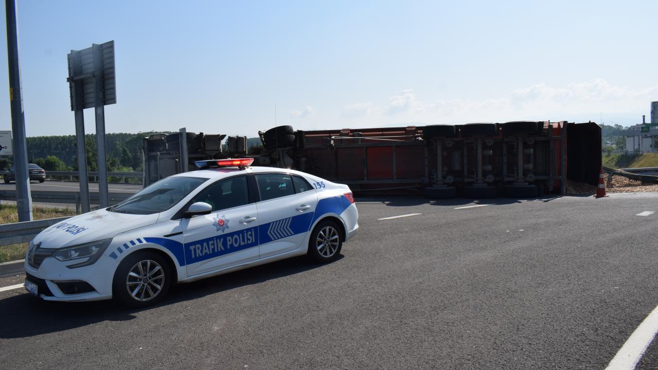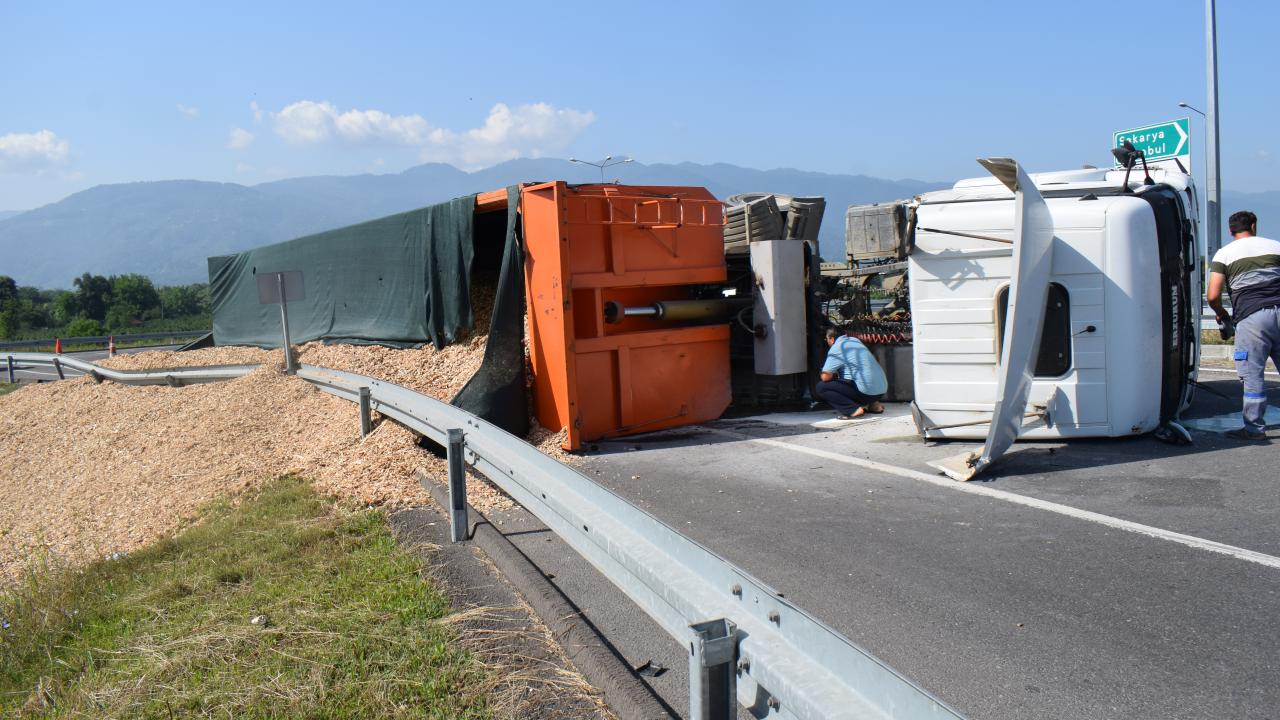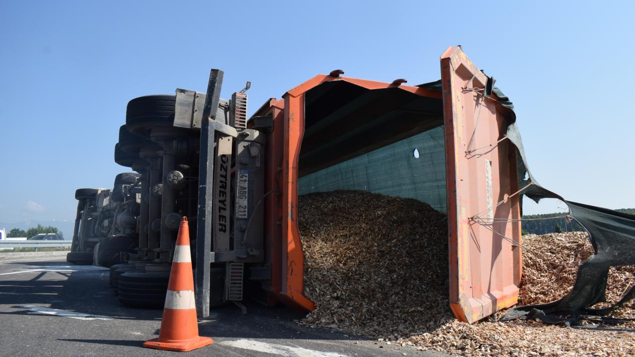 Düzce'de talaş yüklü tır devrildi: 1 yaralı