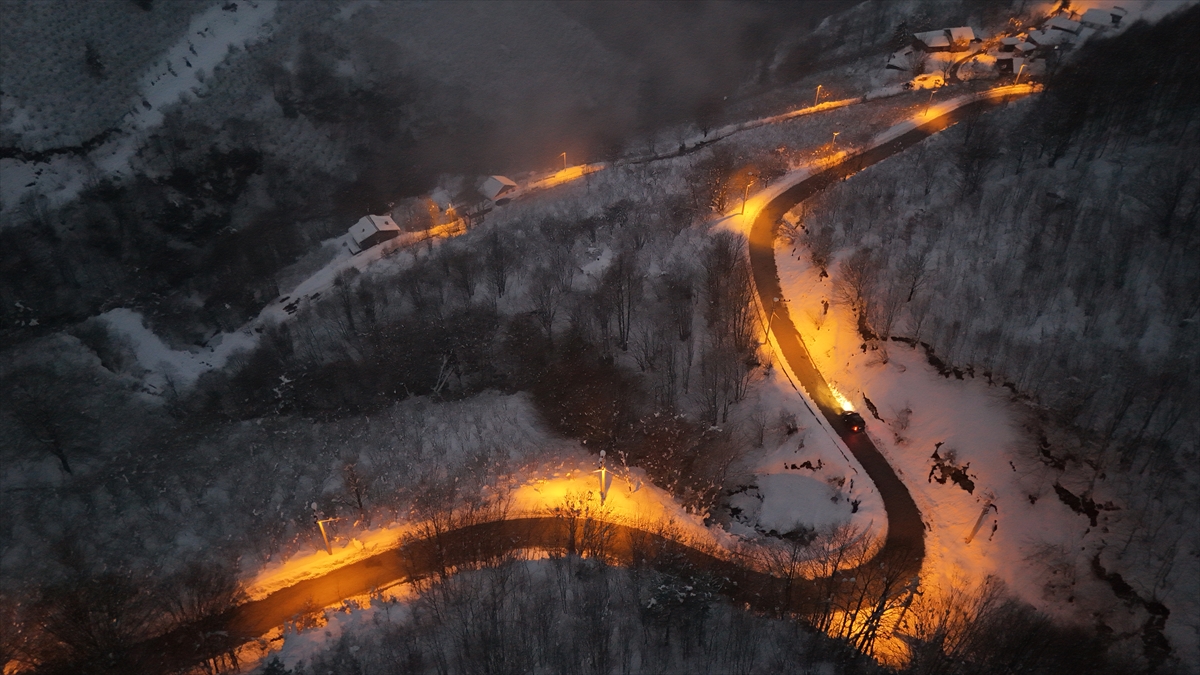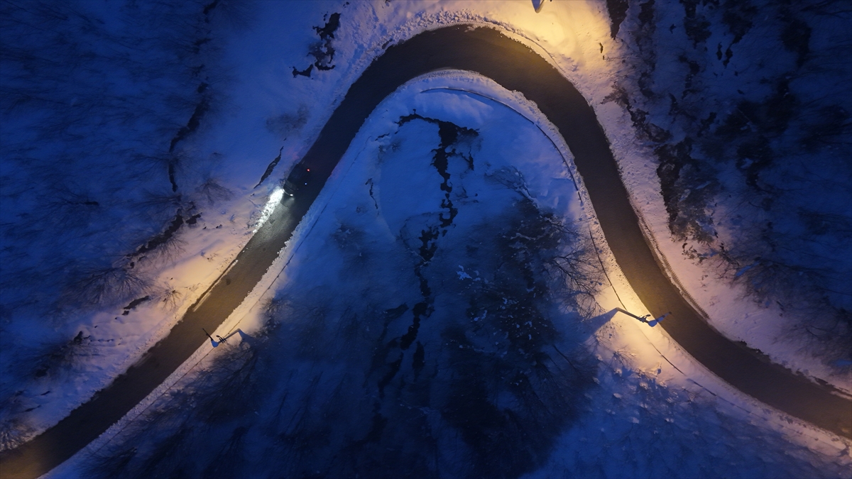 Çam, gürgen ve çınar ağaçlarıyla çevrili yaylanın kış güzelliği havadan görüntülendi.