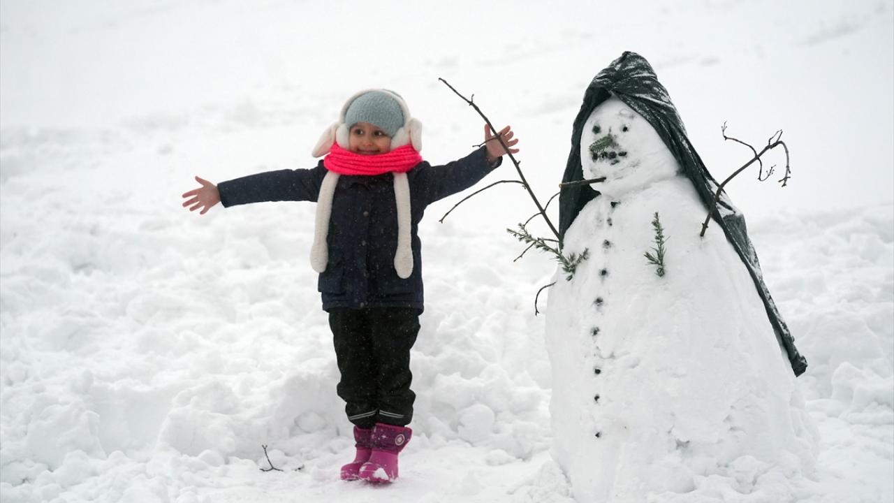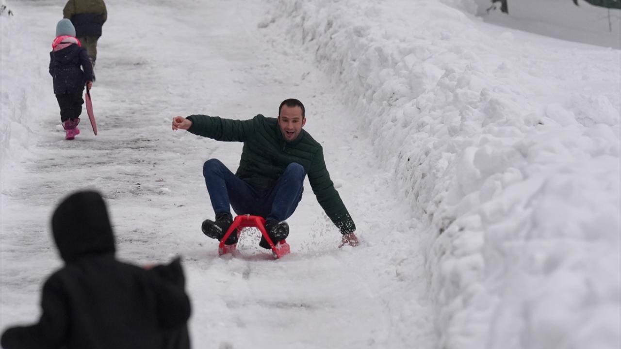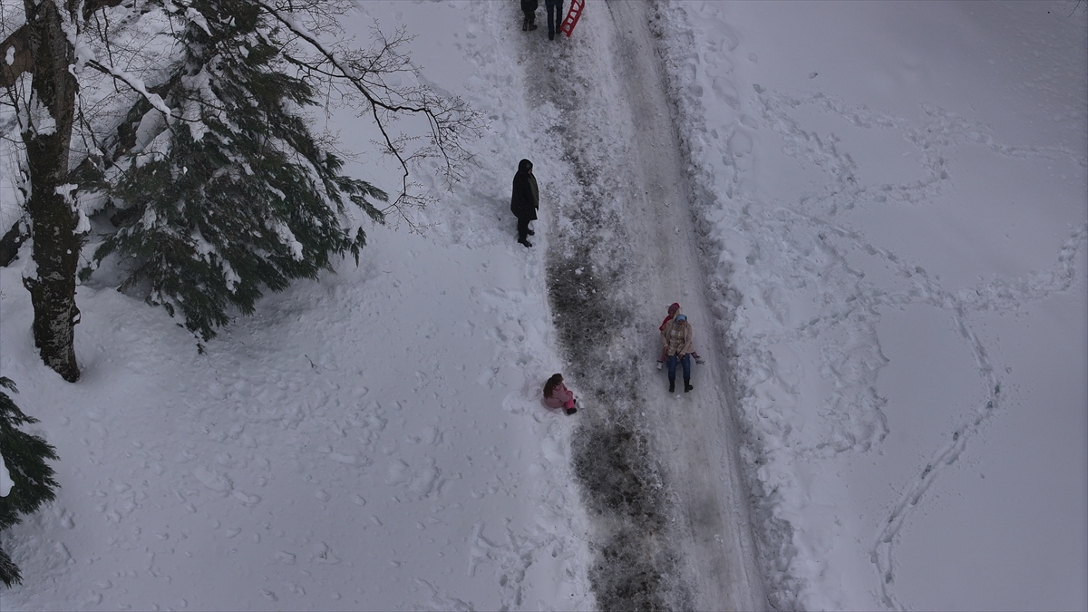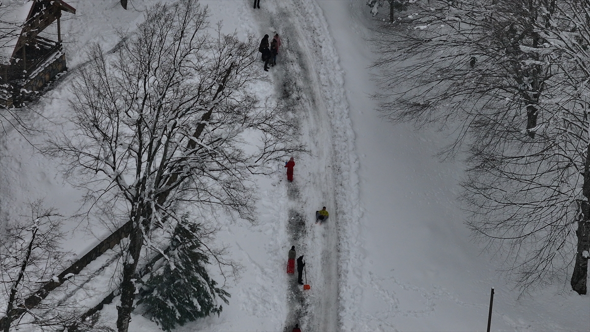 Bölgedeki bungalov evlerde konaklayan aileler, çocuklarıyla karda kayarak ve kar topu oynayarak keyifli vakit geçirdi.