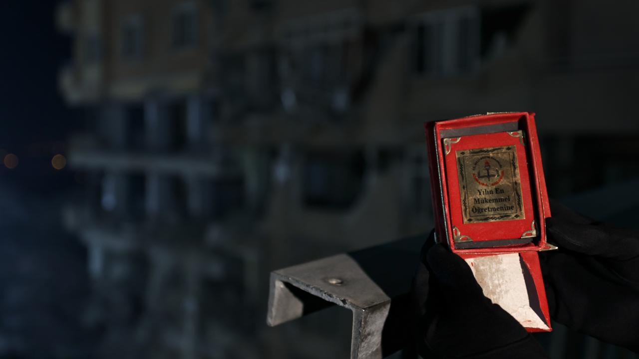Fotoğraflar arasında bulunan küçük bir kız çocuğunun "Benim annem bir melek" yazısının önünde çektirdiği kare ile "Yılın En Mükemmel Öğretmeni"ne yazılı küçük plaket, depremin geride bıraktığı acı izler arasında yer aldı.