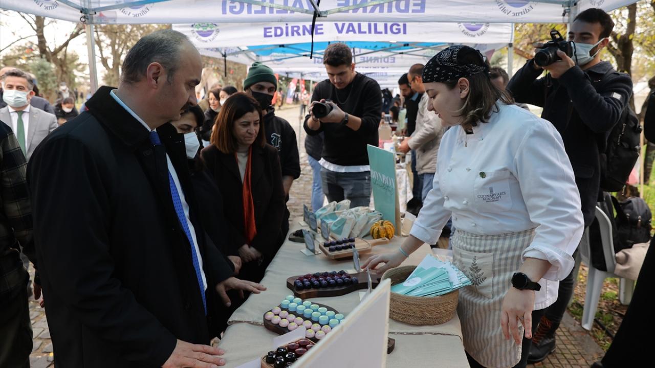 Vali Ekrem Canalp ve eşi Ayten Canalp, TBMM Kadın Erkek Fırsat Eşitliği Komisyonu Başkanı ve AK Parti Edirne Milletvekili Fatma Aksal, İl Kültür ve Turizm Müdürü Kemal Soytürk ile kurulan kahve çikolata stantlarını gezdi, ürünlerin tadına baktı.
