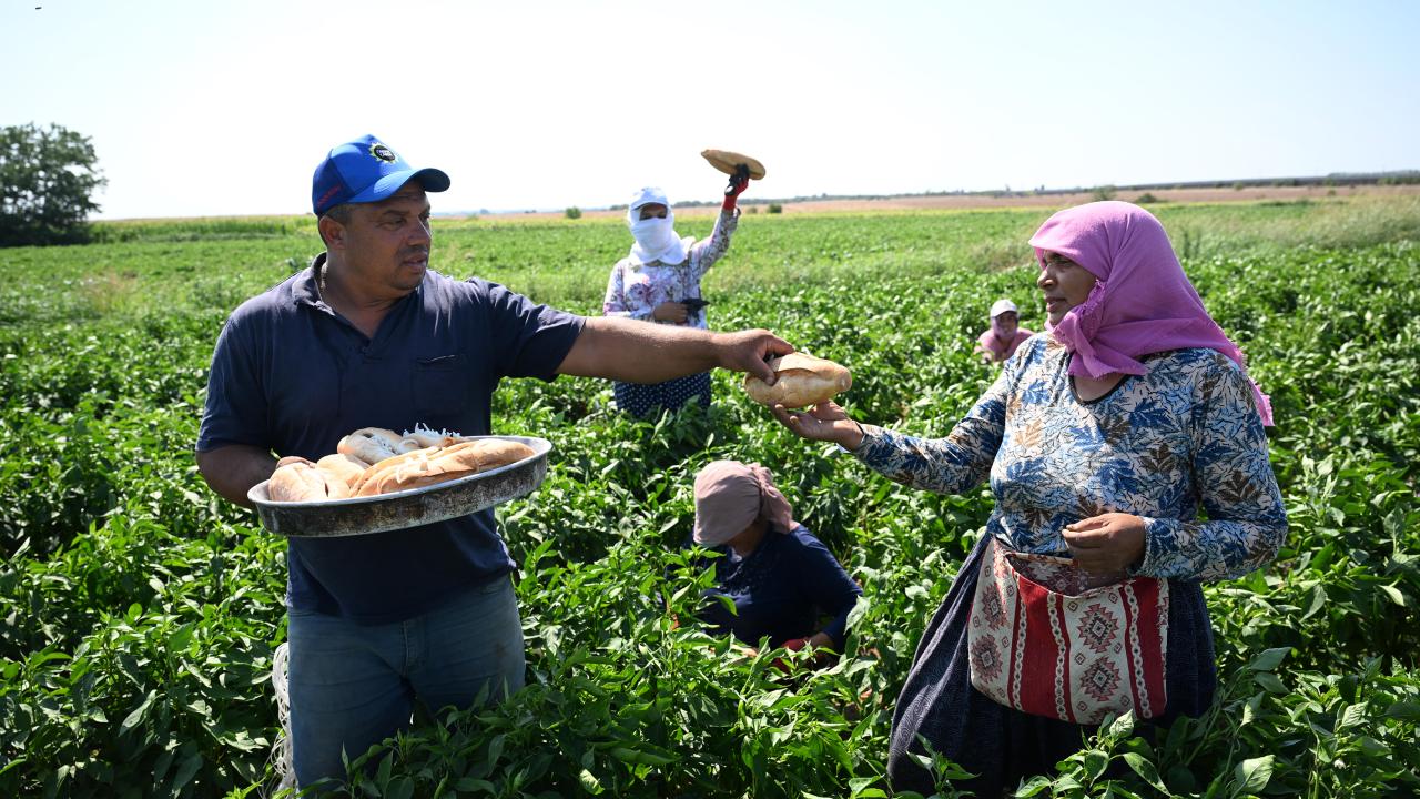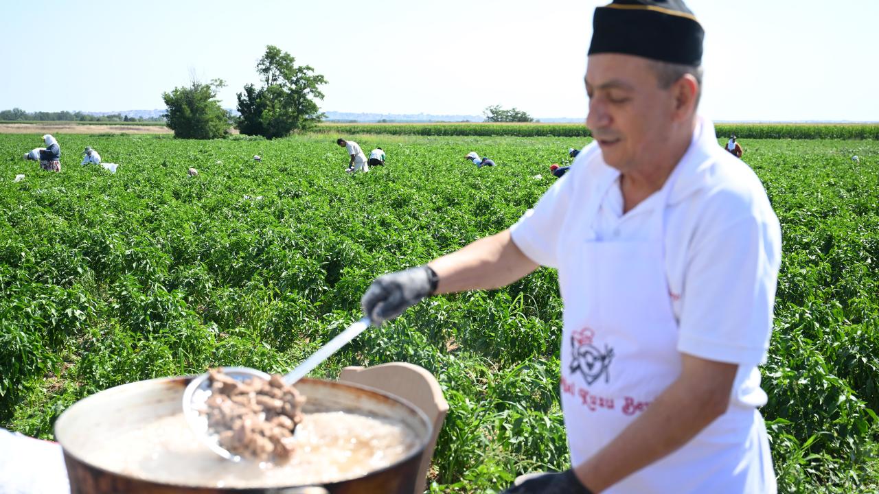 Sıcak havada başlayan hasat mesaisinde işçilere ekmek arası tava ciğer ve hasat ettikleri biberin kurutulmuşu ikram edildi.