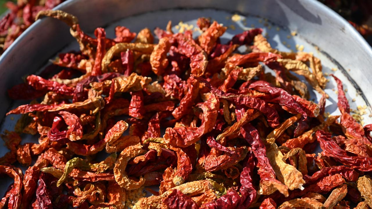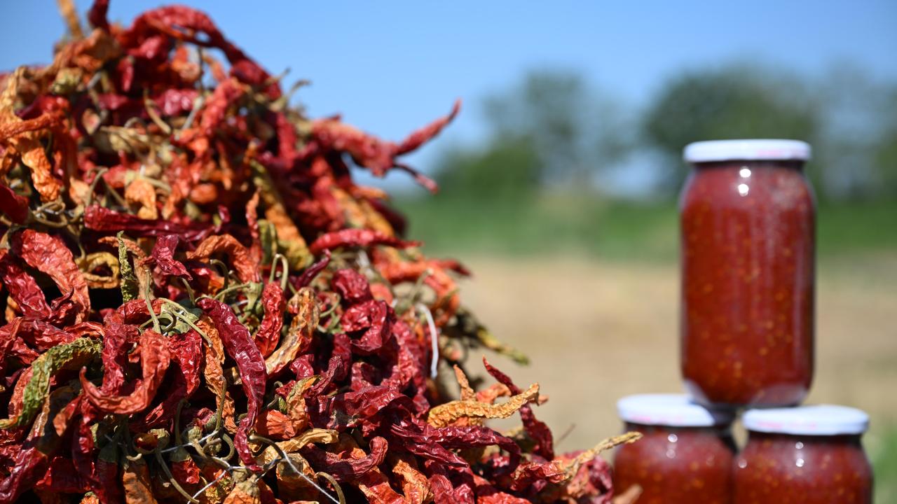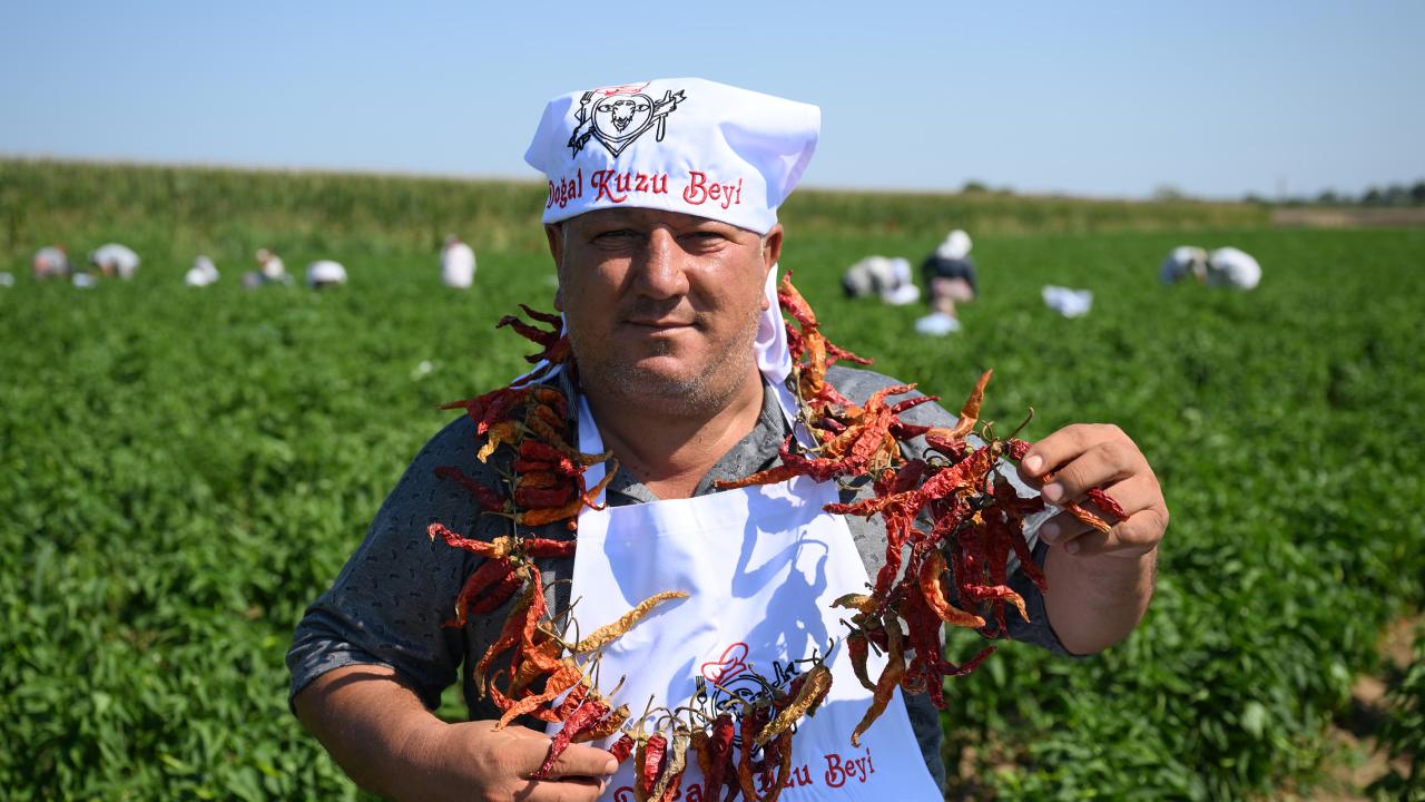 Acı biberin zorlu bir sürecin ardından sofralara geldiğini dile getiren Ule, "Toplandıktan sonra tek tek ipe diziliyor, ardından askılara asıyoruz. Bu biberin gölgede kuruması lazım. İnce kabuk olması en büyük özelliği, güneş görmeden kurutulması gerekiyor. Hasada başladığımız için bugün kuru biber ve ciğer pişirdik. İşçilerimizin biber ve ciğer tatmasını istedik." diye konuştu.