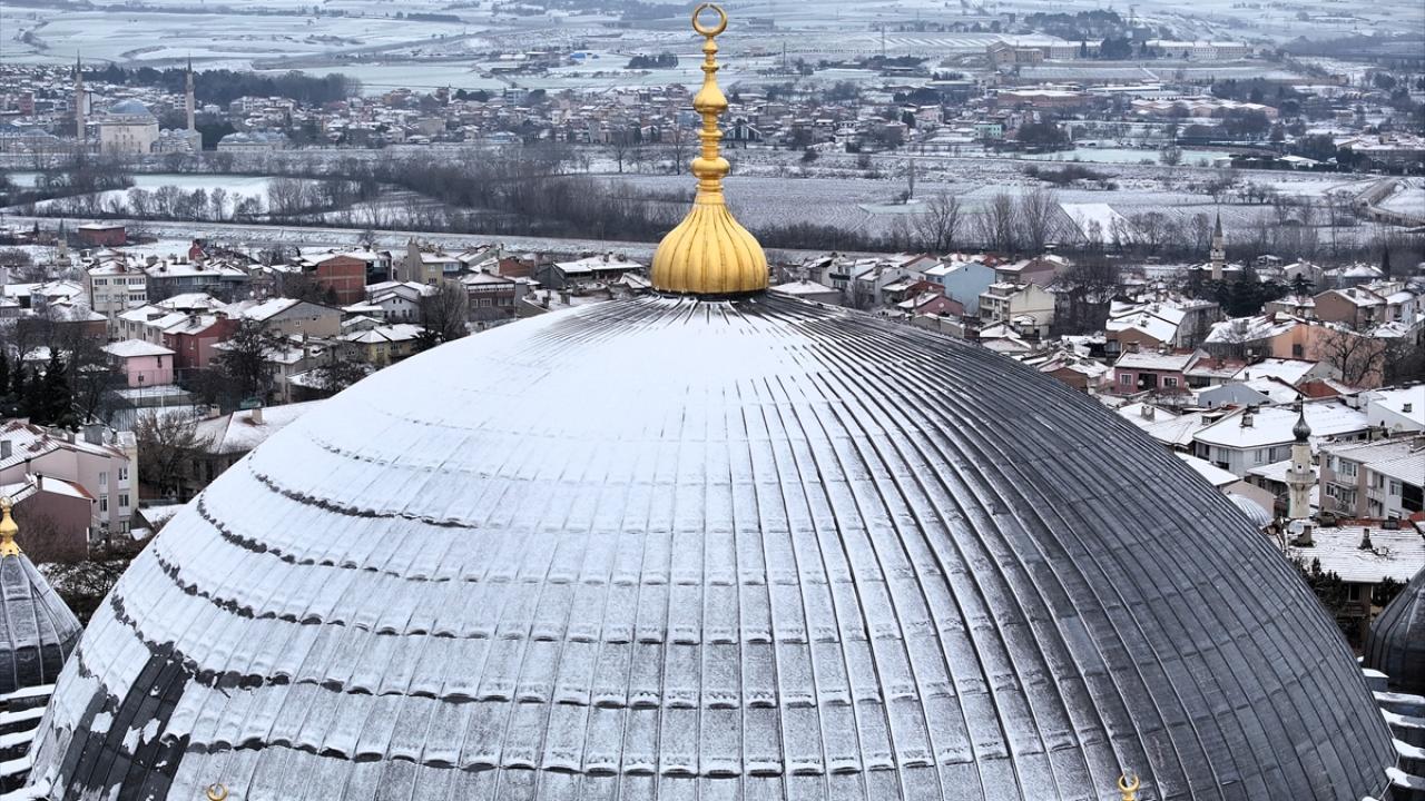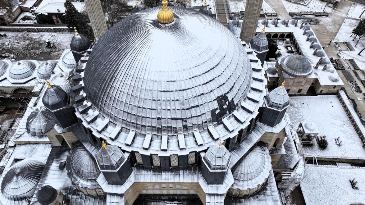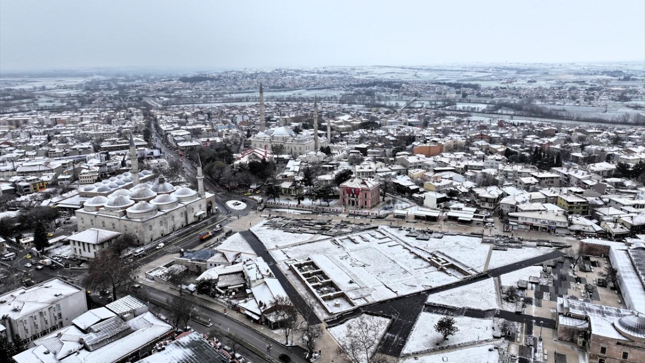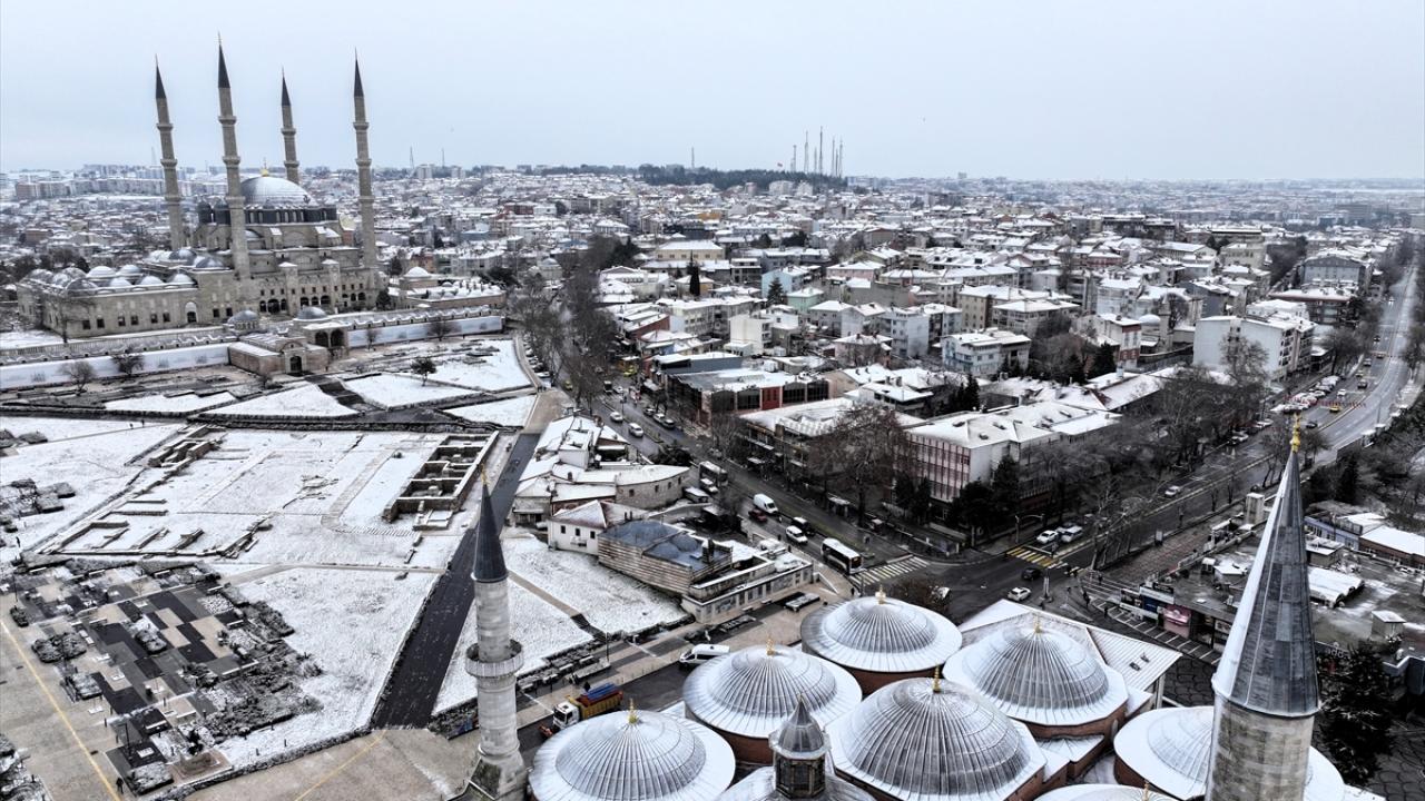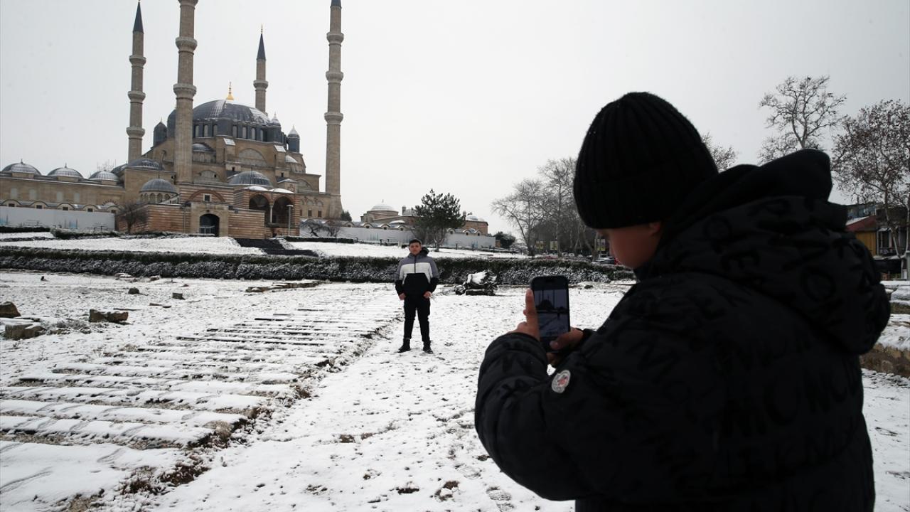 Selimiye Camisi`nin çevresinde karla kaplanan alanların manzarası görenleri hayran bıraktı.