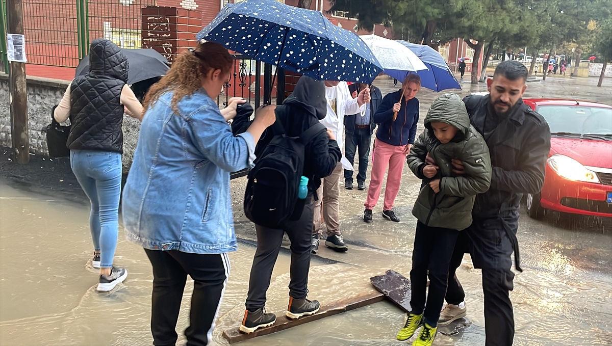 Öğretmenler, öğrencilerin su birikintisinden geçebilmesi için taş ve tahtalardan geçiş alanları oluştururken, bazı veliler de çocuklarını sırtlarında taşıyarak öğrencilerin ayaklarının ıslanmaması için çaba gösterdi.