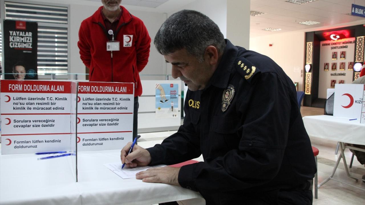 Edirne Emniyet Müdürü Onur Karaburun da müdürlük içerisinde kurulan Kızılay kan bağış noktasını gezerek, görevlilerden bilgi aldı.
