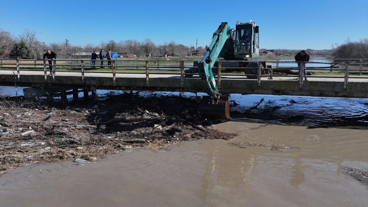 Edirne'de suyun sürüklediği ağaç gövdeleri ve çöplerle tıkanan köprü gözleri temizleniyor