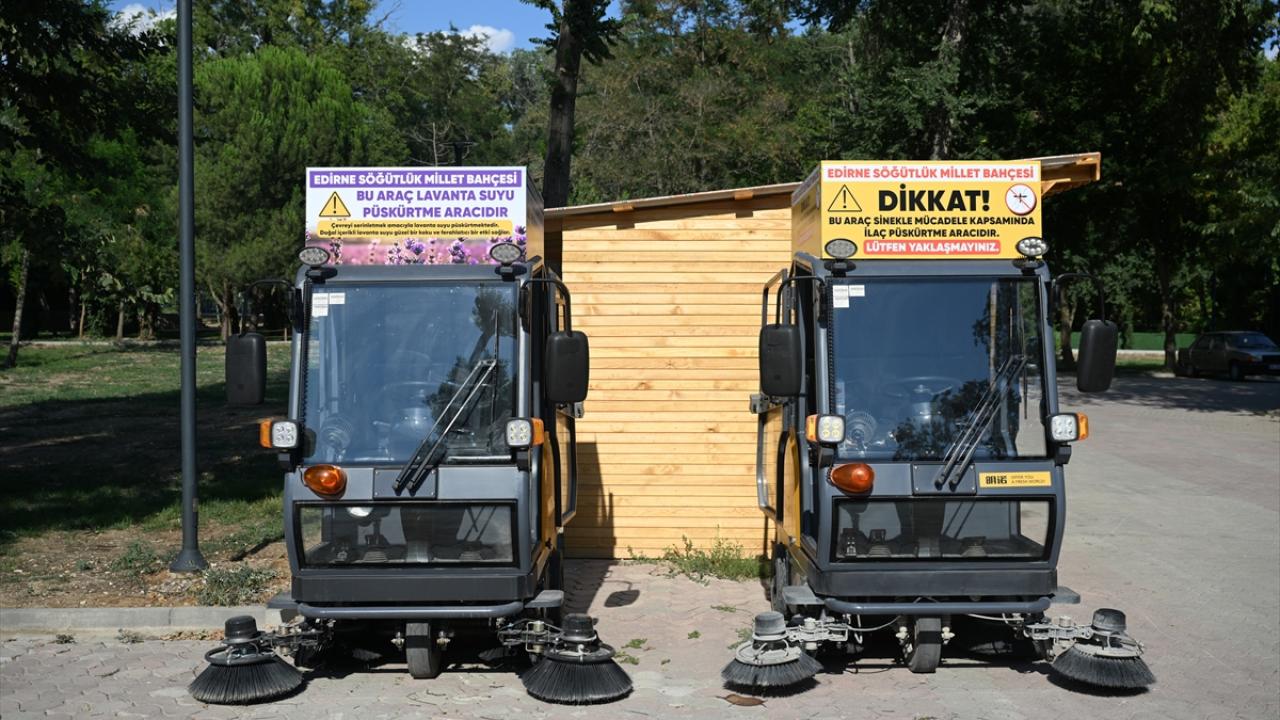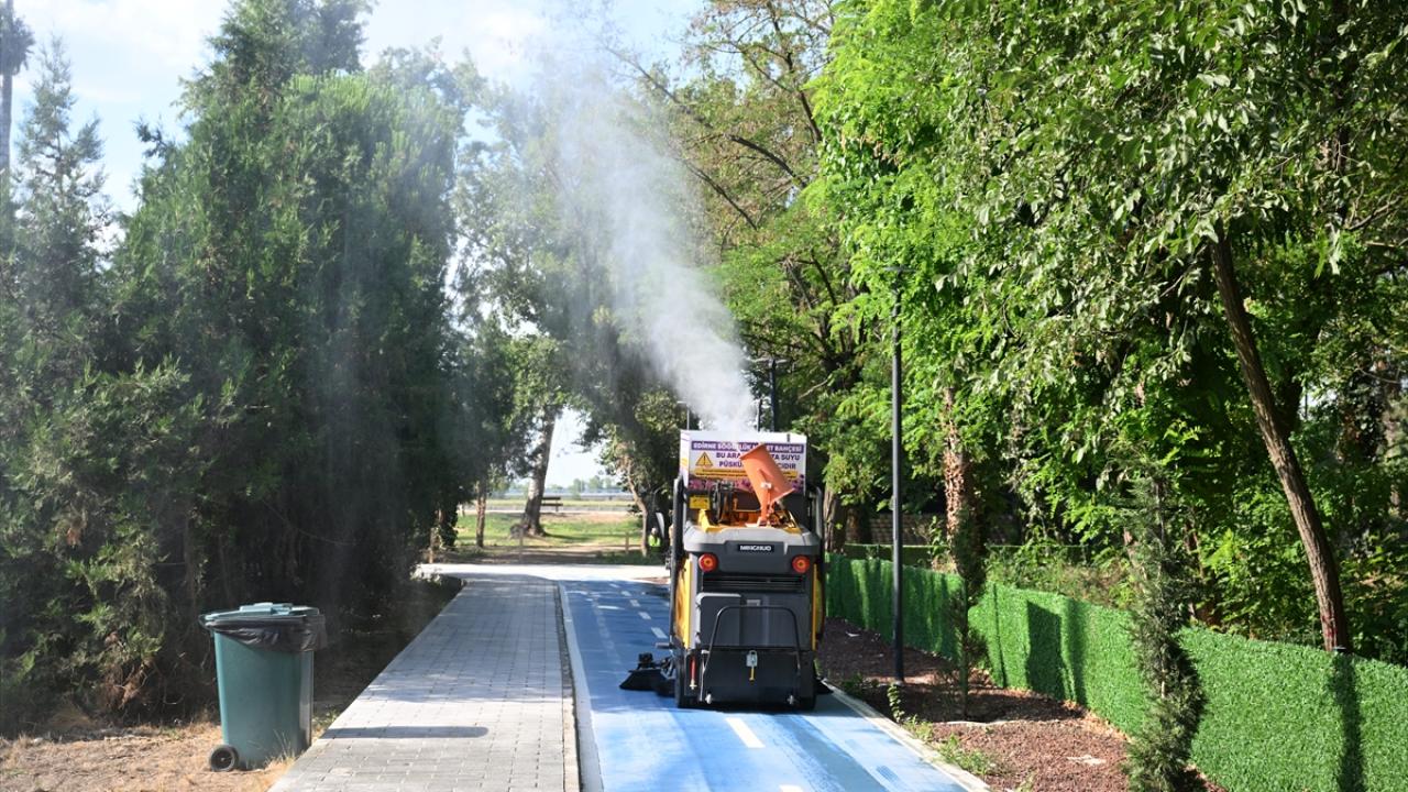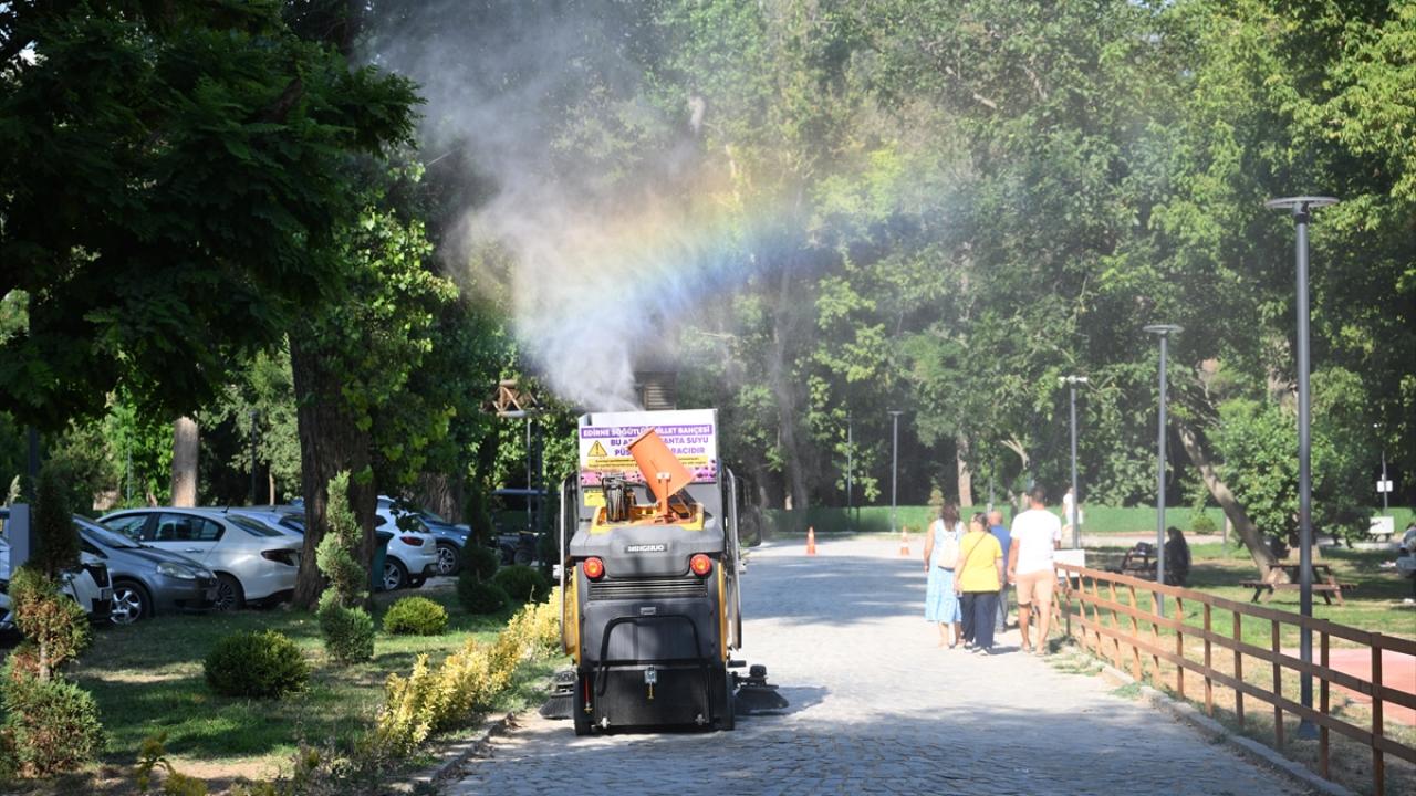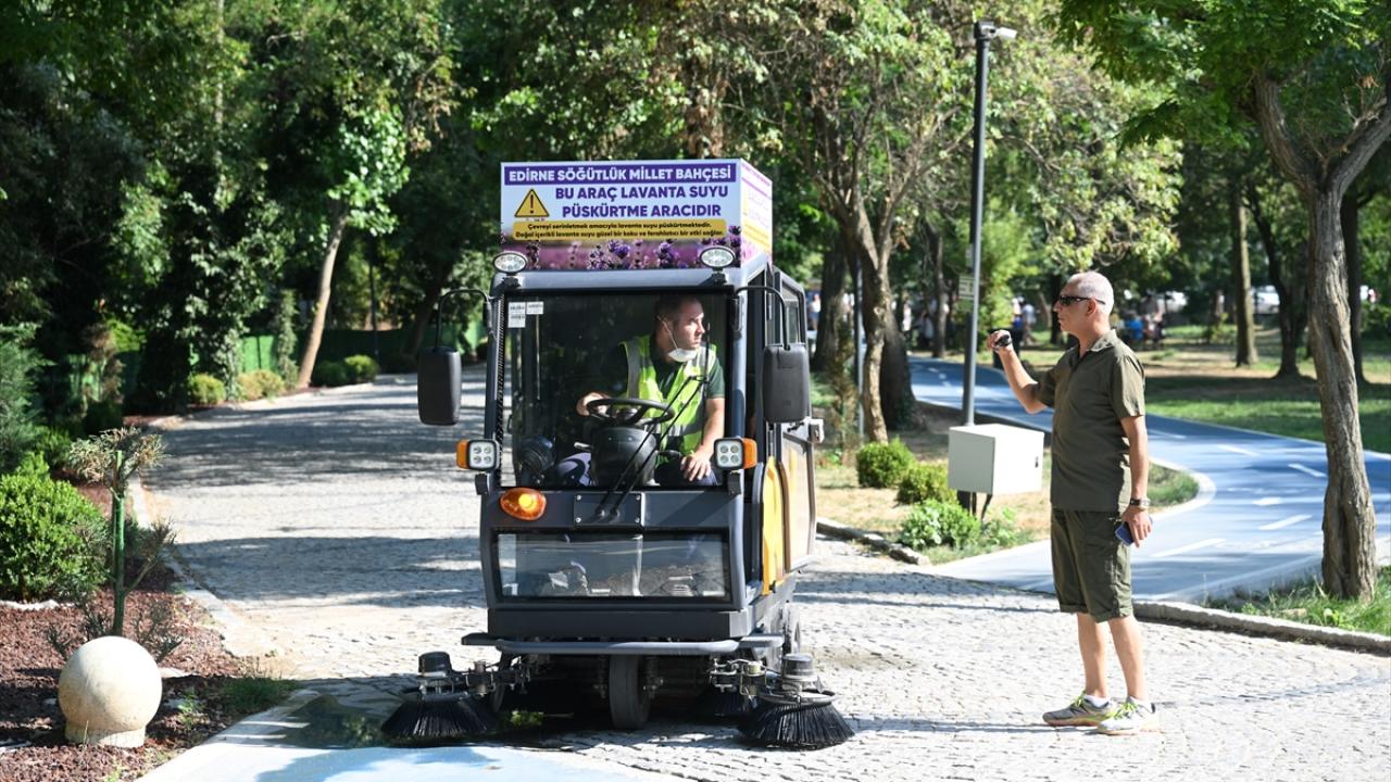 Özel donanımlı süpürme aracı yardımıyla bahçede temizlik yapılırken aynı zamanda lavanta suyu püskürtülerek ziyaretçilerin serinlemesi sağlanıyor.
