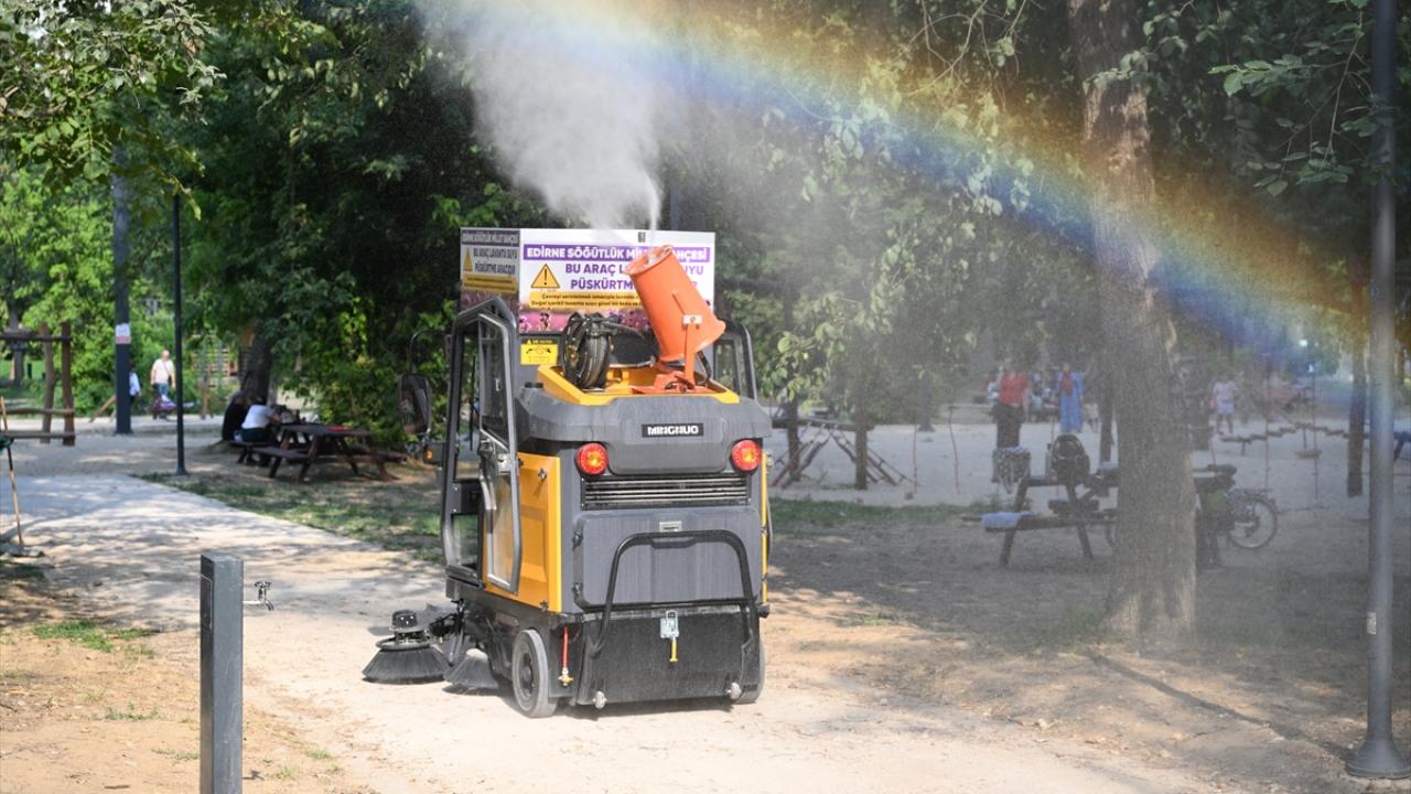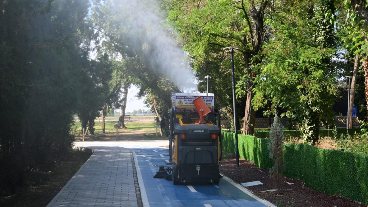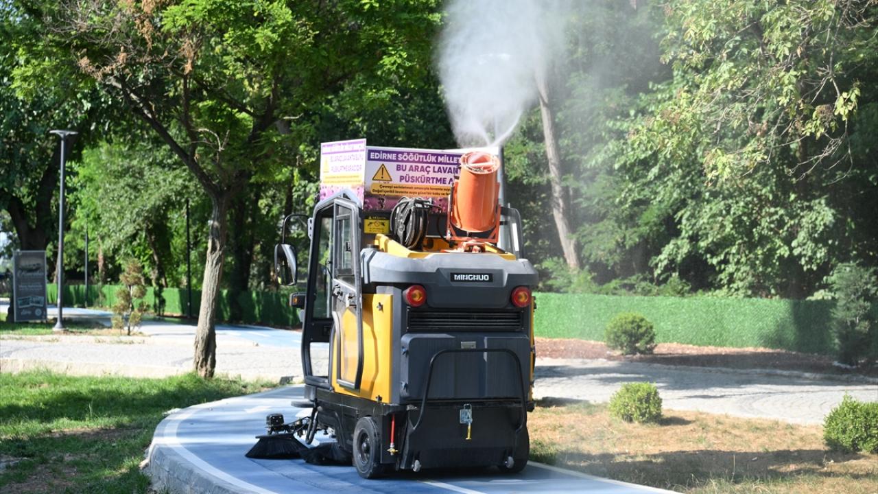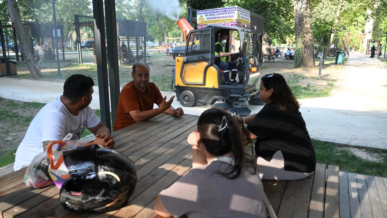 Özel donanımlı süpürme aracı yardımıyla bahçede temizlik yapılırken aynı zamanda lavanta suyu püskürtülerek ziyaretçilerin serinlemesi sağlanıyor.