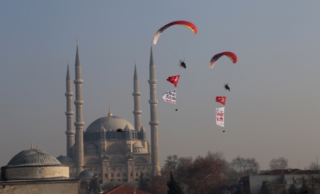 Edirne'nin kurtuluşunun 94'üncü yıl dönümü, törenlerle kutlandı. Türk Hava Kurumuna ait iki paramotor üzerinde Türk bayrağı ve Mustafa Kemal Atatürk'ün sözü "Cumhuriyet fazilettir" yazılı pankartla tören alanının üzerinde bir süre uçtu.