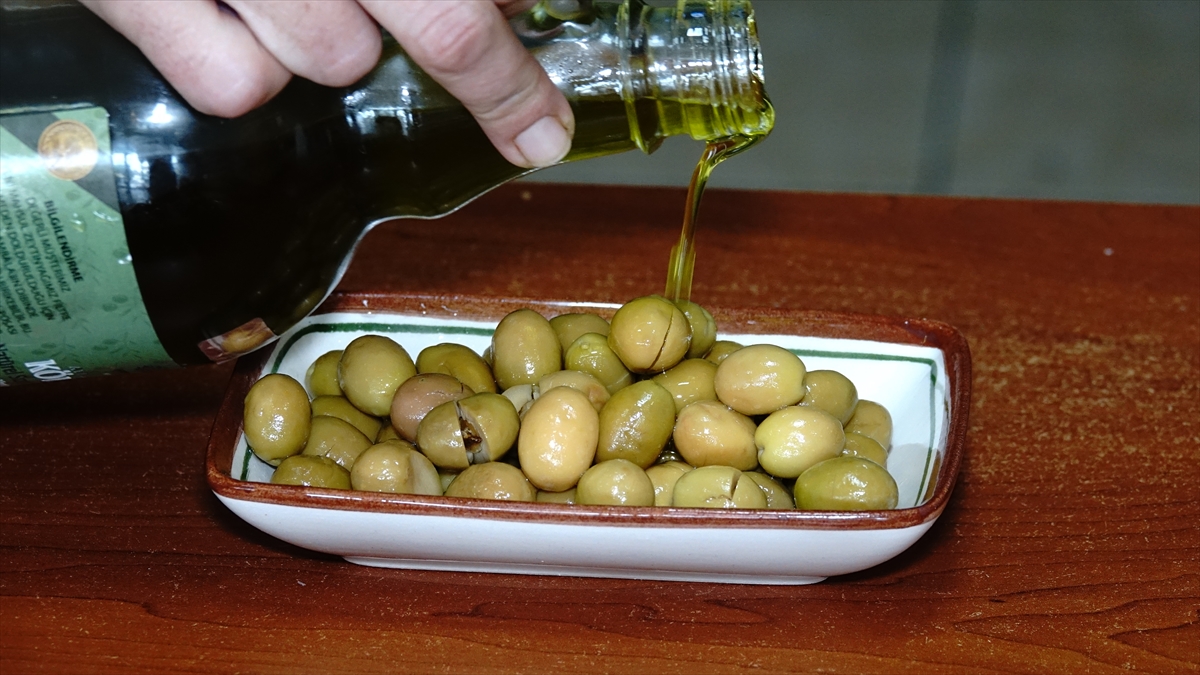 Türkiye'nin önemli zeytin üretim merkezlerinden olan Balıkesir'in Edremit Körfezi'nde toplanan yeşil zeytinler, taş veya ahşap takoz kullanılarak kırıldıktan sonra "kırma zeytin" olarak sofralarda yerini alıyor.