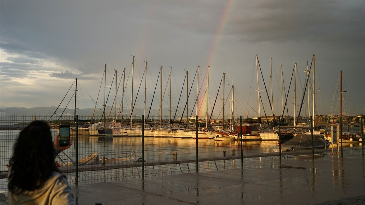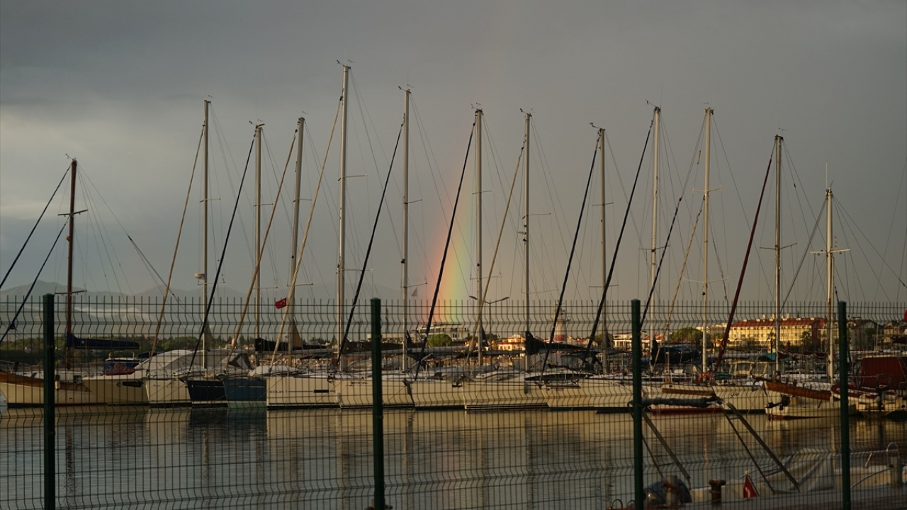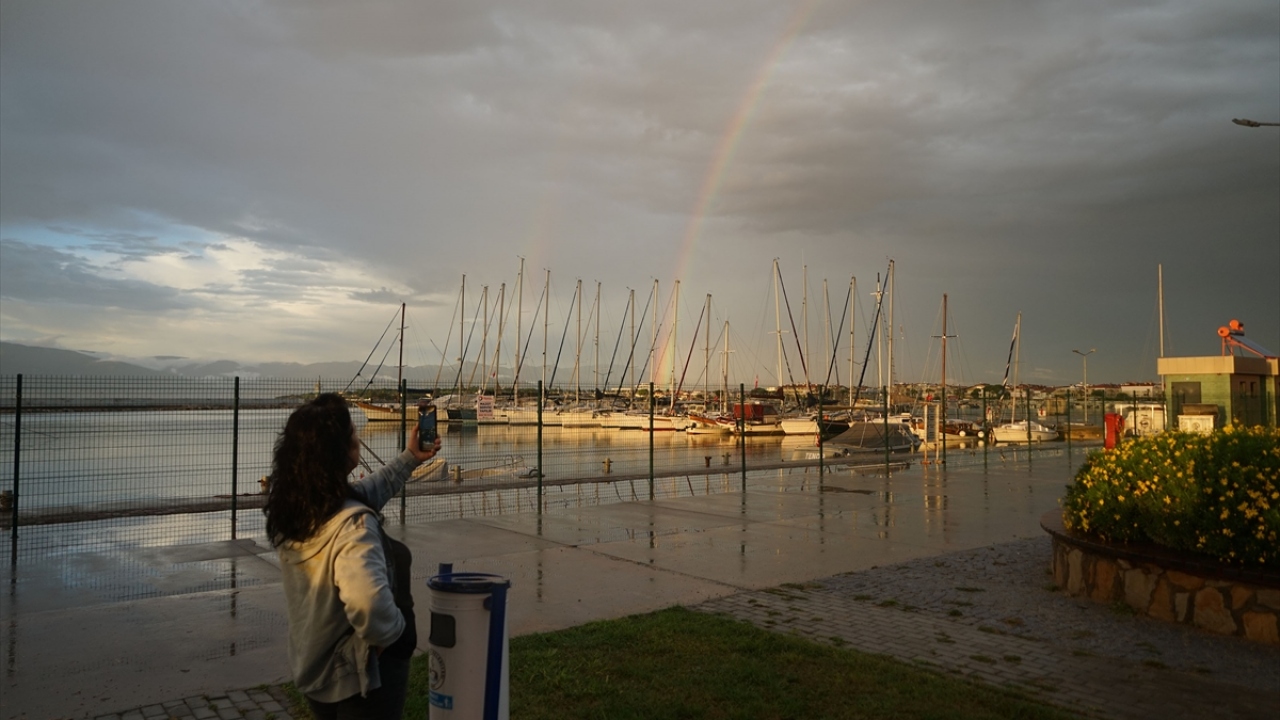 Kuzey Ege'de sabah saatlerinden beri etkili olan sağanak yağışın ardından akşamüzeri oluşan ve yaklaşık yarım saat havada kalan gökkuşağı adeta güzel görüntü oluşturdu.