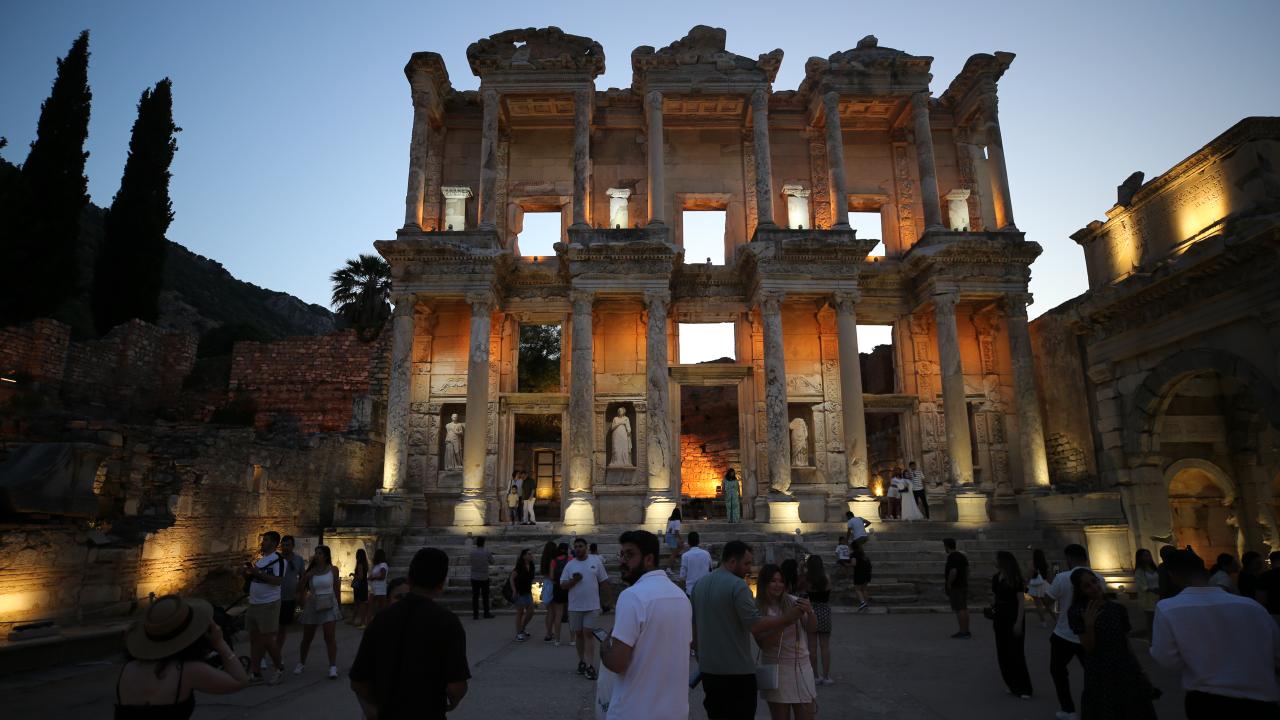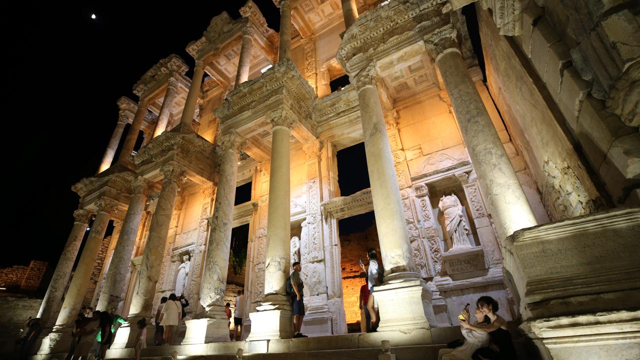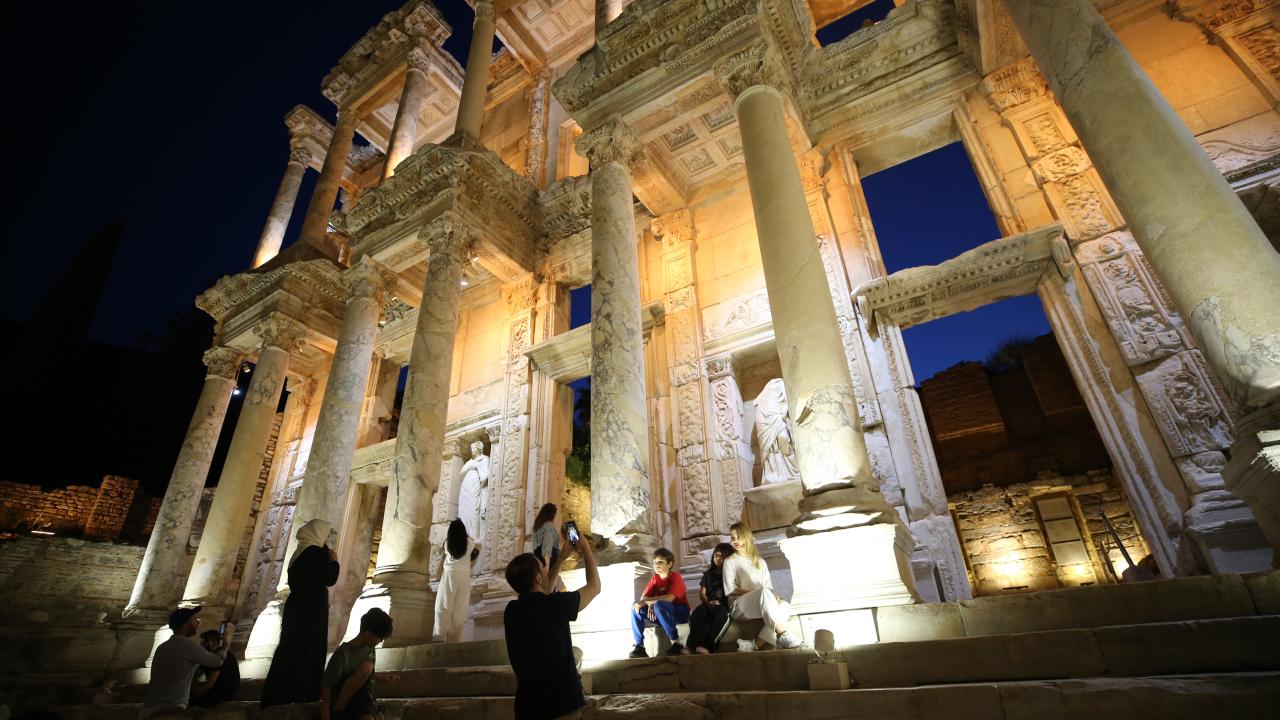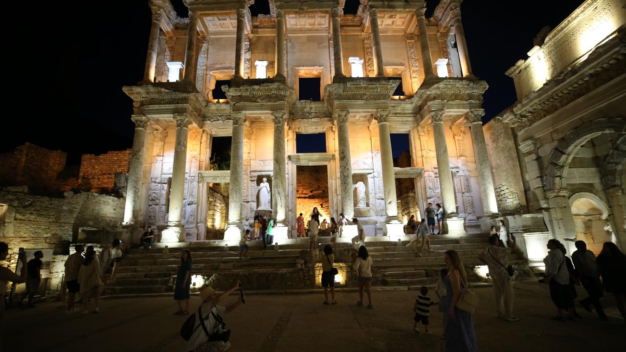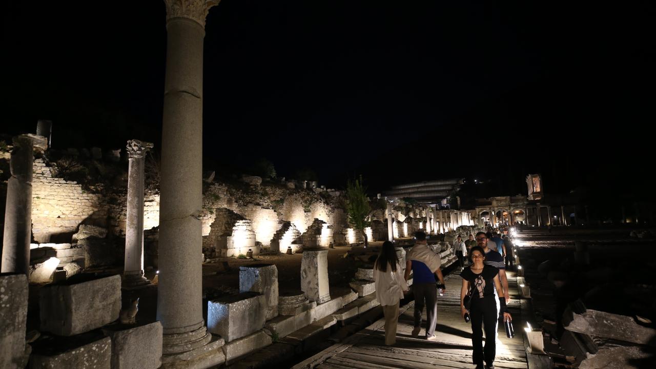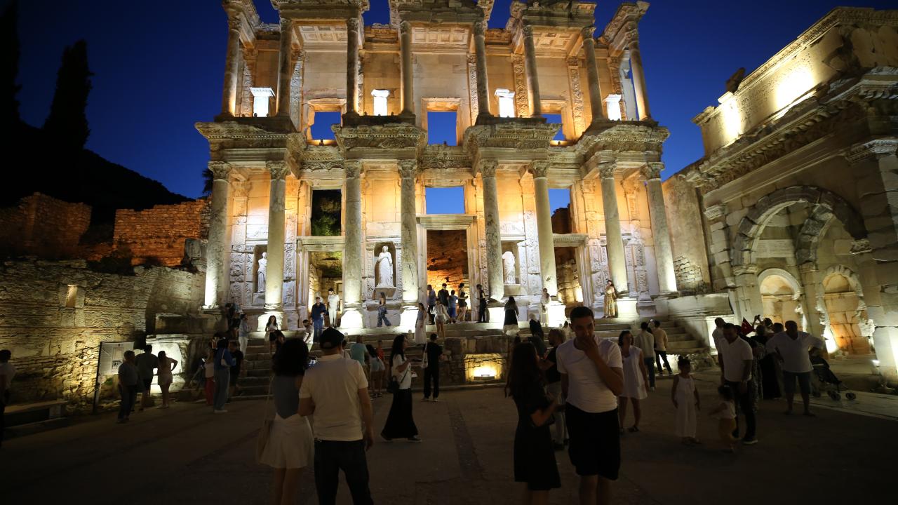UNESCO Dünya Miras Listesi'nde yer alan Efes Antik Kenti, gece müzeciliği uygulaması kapsamında ışıklarla aydınlatılarak ziyaretçilere gece saatlerinde de kapılarını açtı.