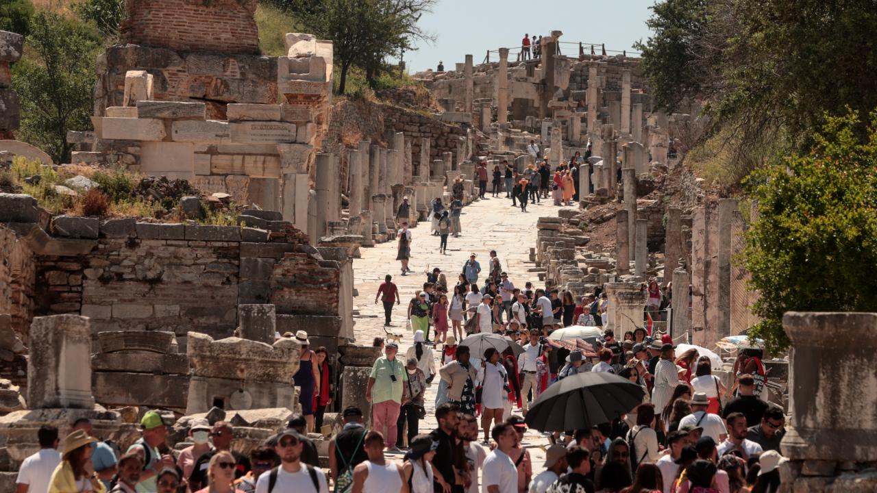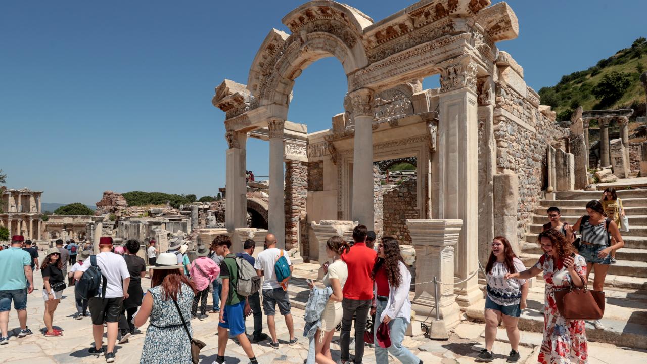 Efes Antik Kenti'nde COVID-19 salgını döneminde düşen ziyaretçi sayısı, hastalığın etkilerinin azalması ve kruvaziyer turizminin canlanmasıyla günlük 10 bine yaklaştı.