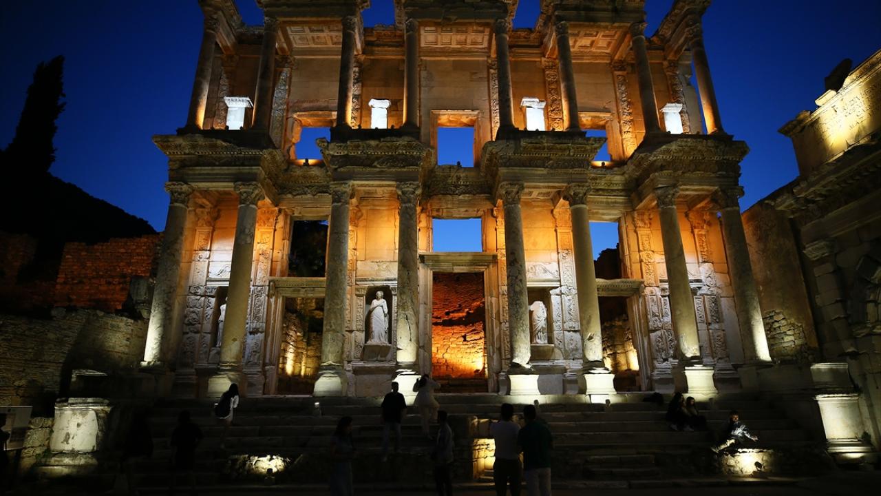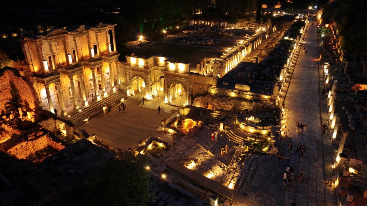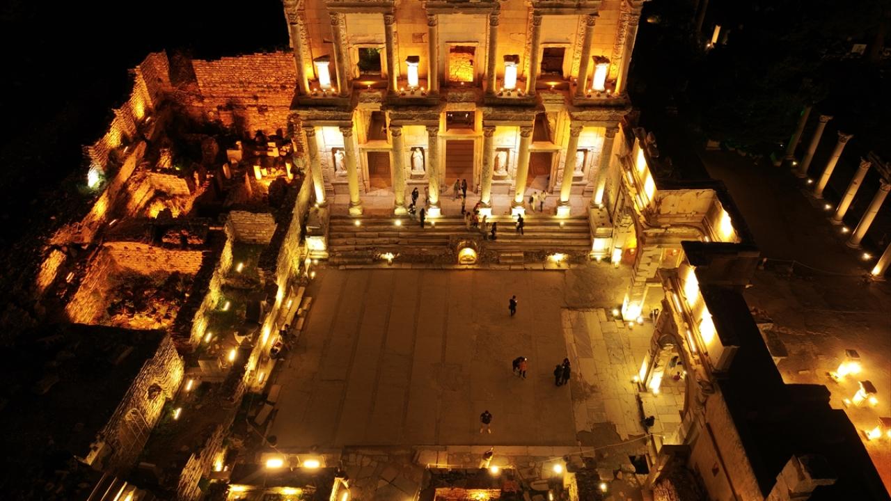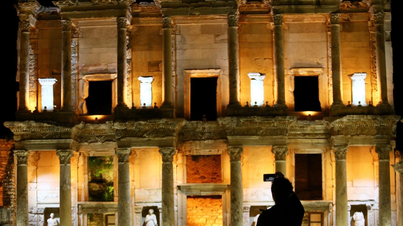 Dünyanın farklı noktalarından her yıl yüz binlerce ziyaretçi çeken yaklaşık 2 bin 300 yıllık Efes Antik Kenti`nin sahip olduğu eşsiz güzellikler, Kültür ve Turizm Bakanlığının "Gece müzeciliği" uygulamasıyla 9 Nisan`dan itibaren gün batımından sonra da ziyaret edilebiliyor.