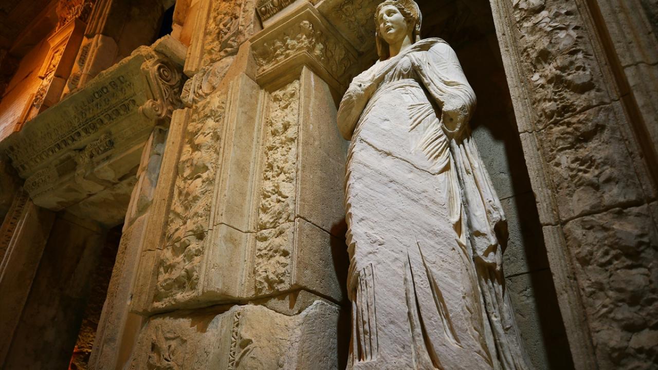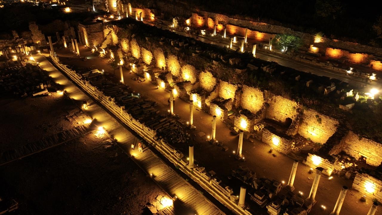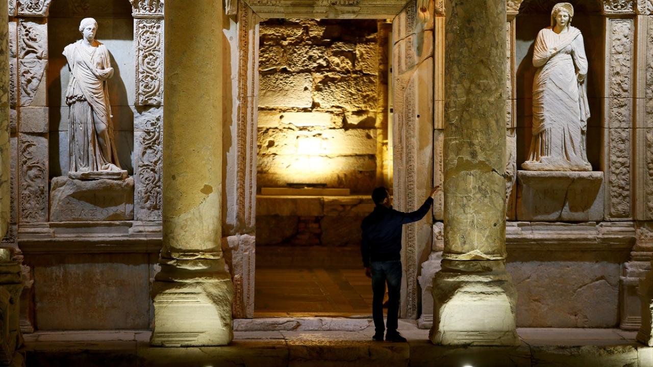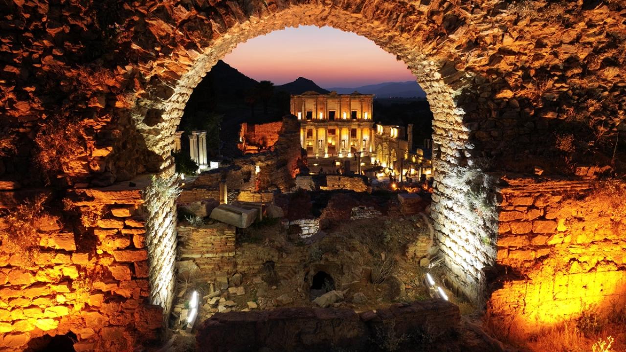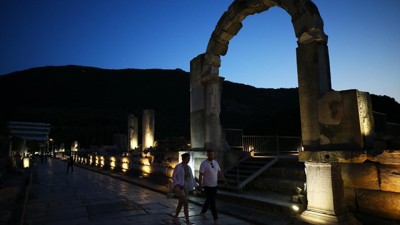 Dünyanın farklı noktalarından her yıl yüz binlerce ziyaretçi çeken yaklaşık 2 bin 300 yıllık Efes Antik Kenti`nin sahip olduğu eşsiz güzellikler, Kültür ve Turizm Bakanlığının "Gece müzeciliği" uygulamasıyla 9 Nisan`dan itibaren gün batımından sonra da ziyaret edilebiliyor.