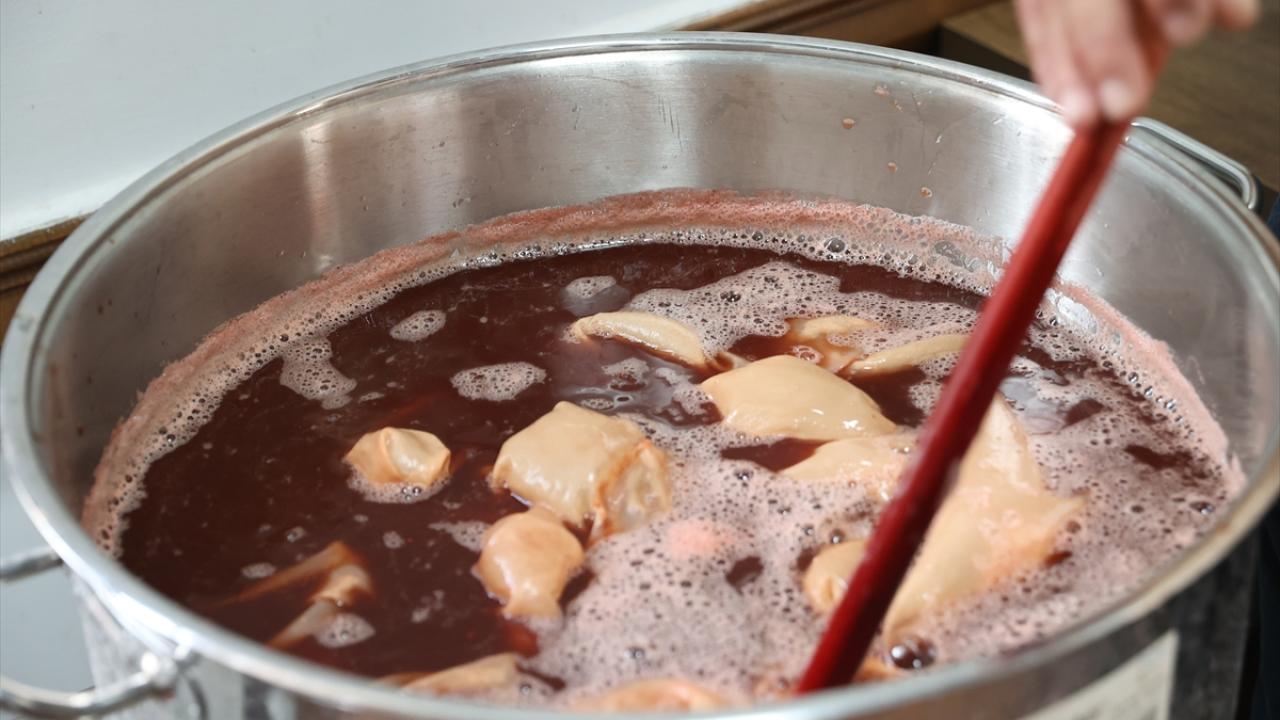 "Edirne kırmızısını reçetesini doğru uygulamak çok önemli. İpek kumaşımızı saf sabunla arıtıp sonrasında kurutuyoruz. Toz haline getirmiş olduğumuz rubia tinctorum bitkisini kazanlarda yumuşak suyla karıştırarak rengin salınmasını sağlıyoruz. Bitkisel posayı süzerek ayırıyoruz. Sonrasında da kumaşlarımızı Edirne kırmızısı rengiyle buluşturuyoruz."