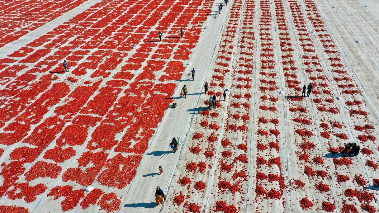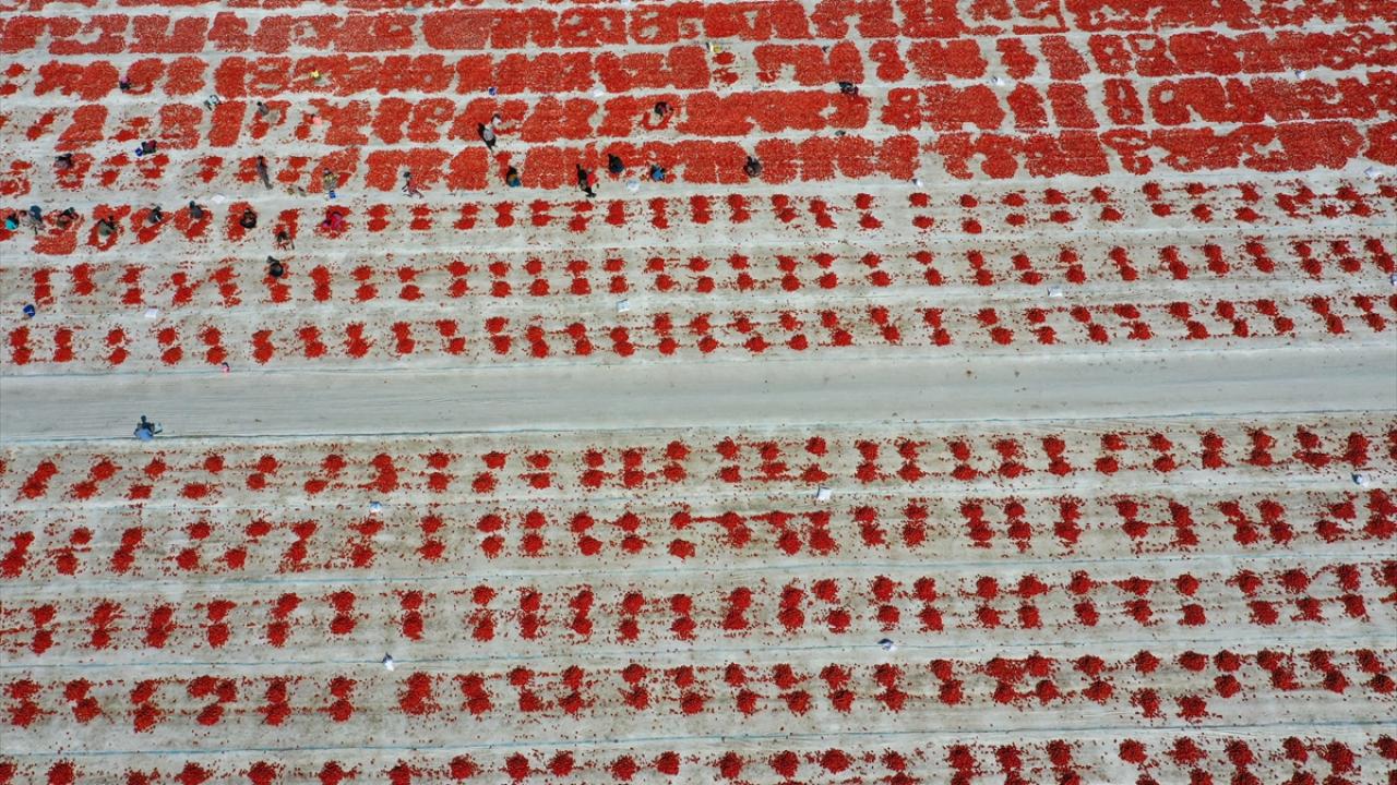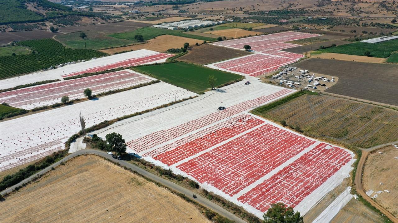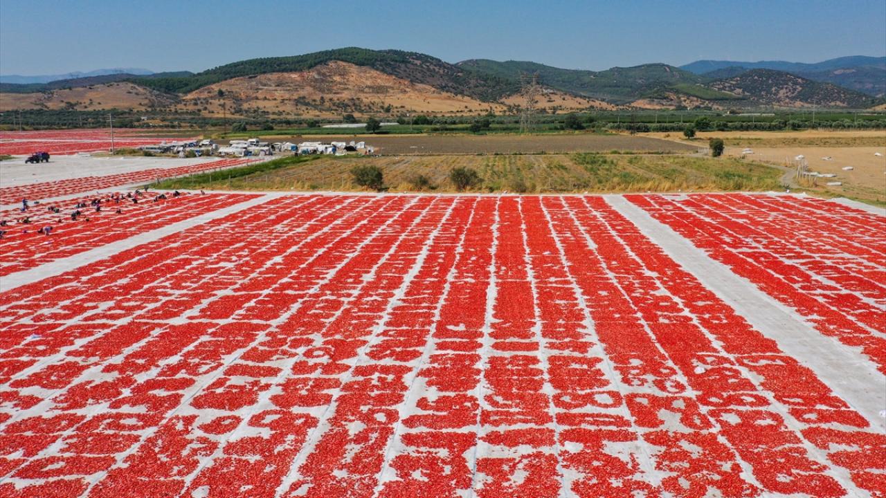 Ege Bölgesi'nde kurutulmuş domates üretim merkezlerinden Torbalı'da, aşırı sıcak nedeniyle ürünlerin hızlı olgunlaşması sezonun erken tamamlanmasına neden oldu. Temmuz ayından itibaren kırmızıya bürünen bölgede, sezonun erken kapanması nedeniyle işçiler son çalışmalarını gerçekleştiriyor.