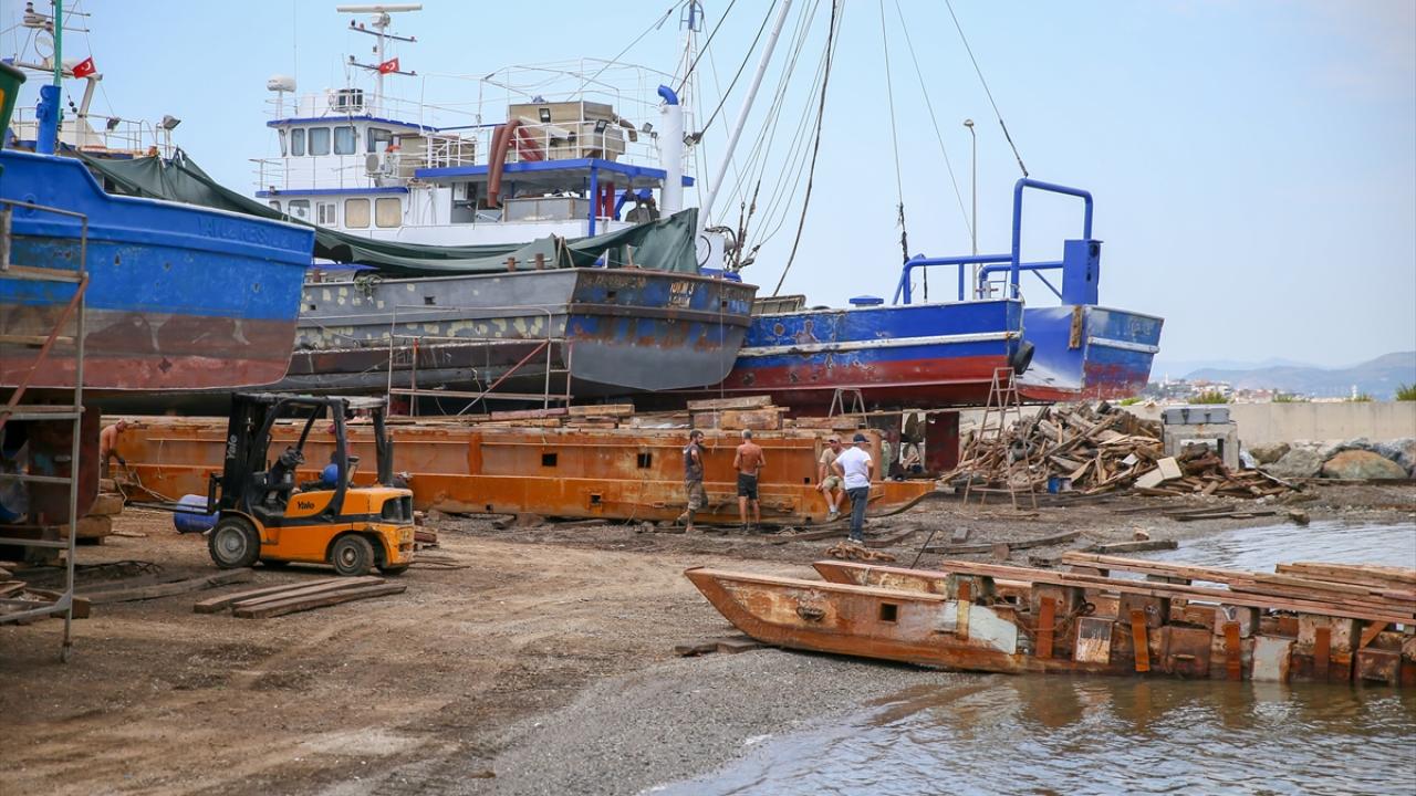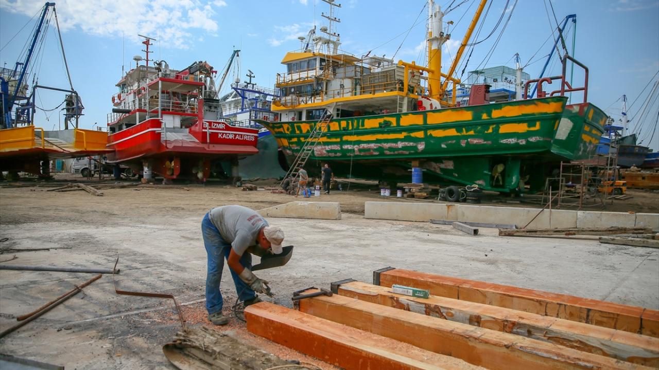 İzmir Güzelbahçe`deki limanda 15 Nisan`da başlayan av yasağının ardından teknelerini kıyıya çeken balıkçılar, yaklaşan av sezonu öncesi hummalı çalışmalar yürütüyor.