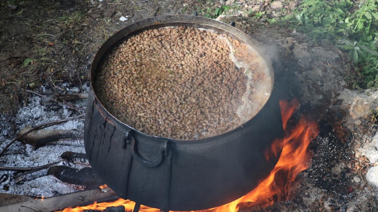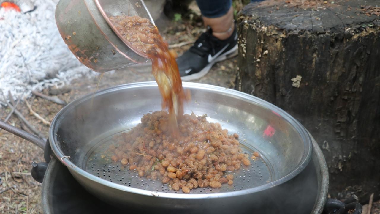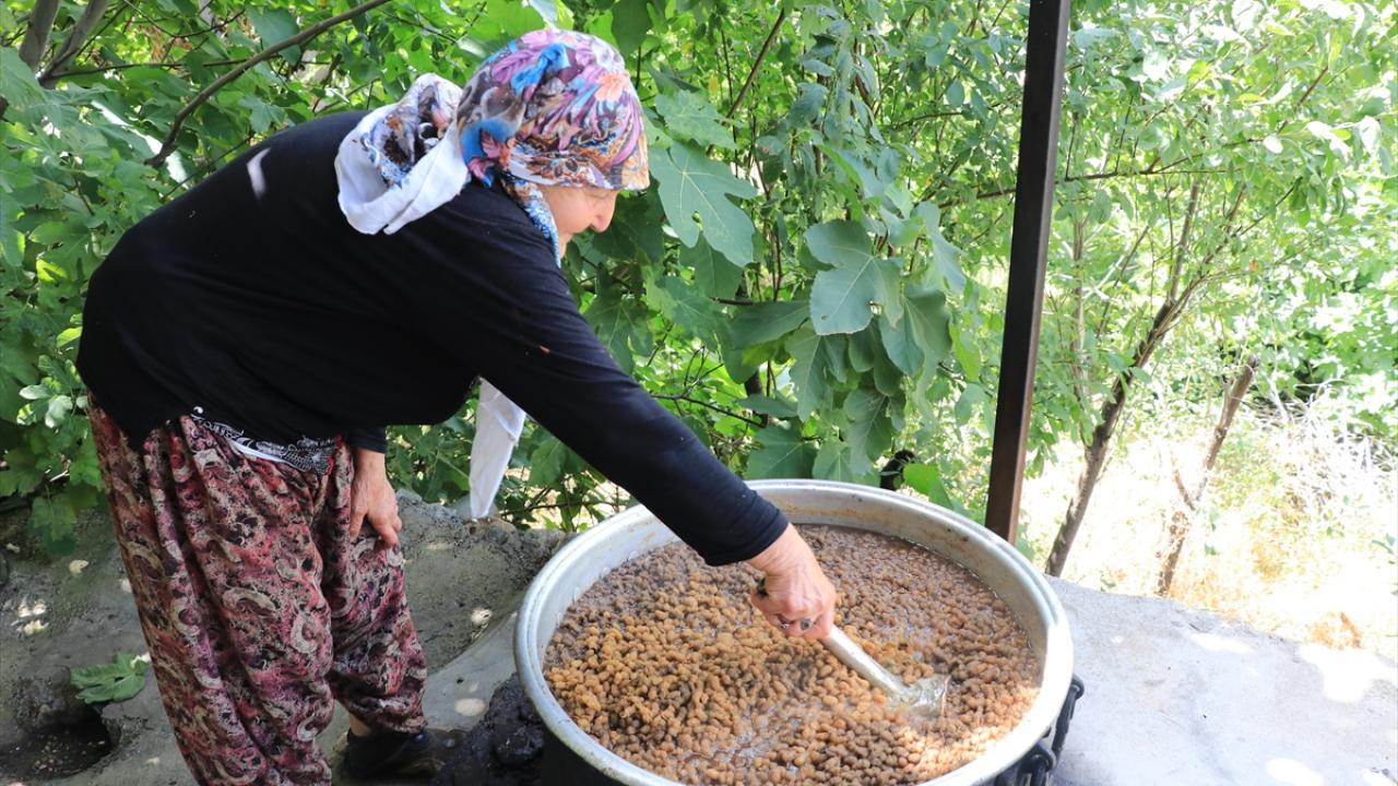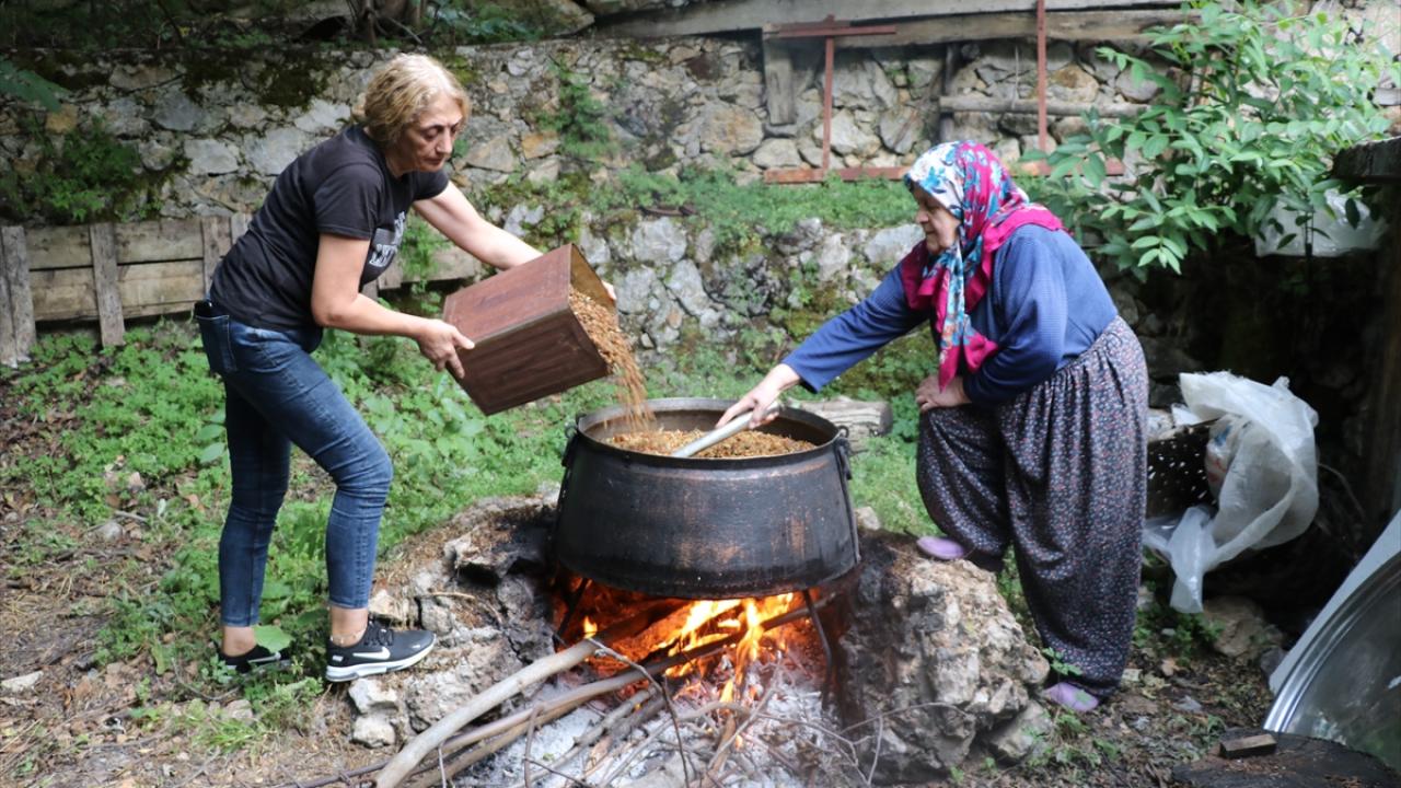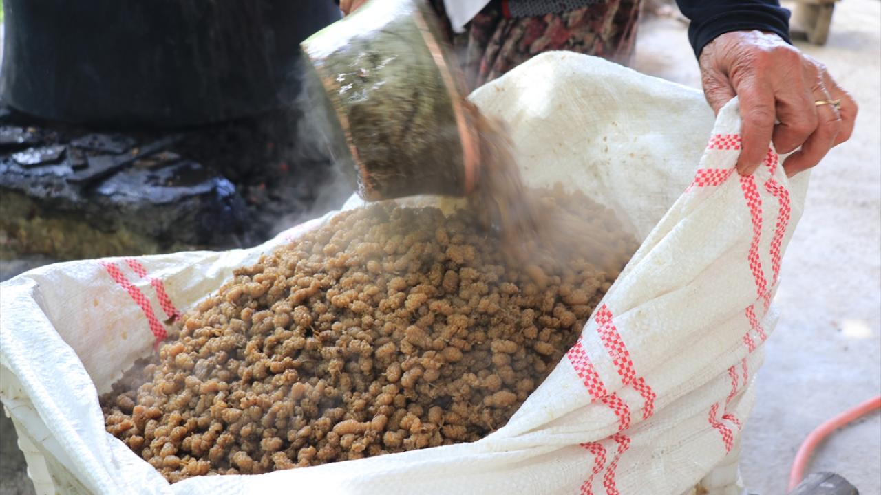 Kurutma işlemi sonrası kadınlar tarafından yaprak ve saplarından ayrılan dutlar, odun ateşinde yakılan kazanlara doldurulup, pişirme ve süzme işlemleriyle pekmez haline getiriliyor.