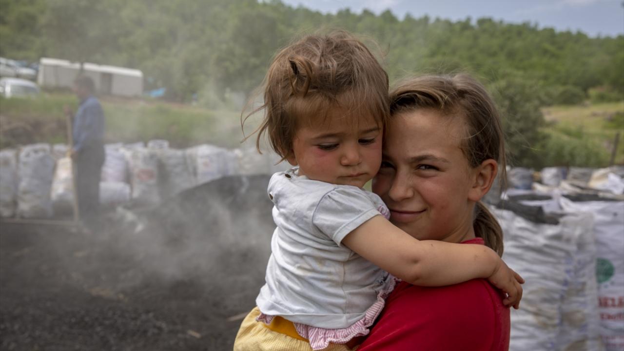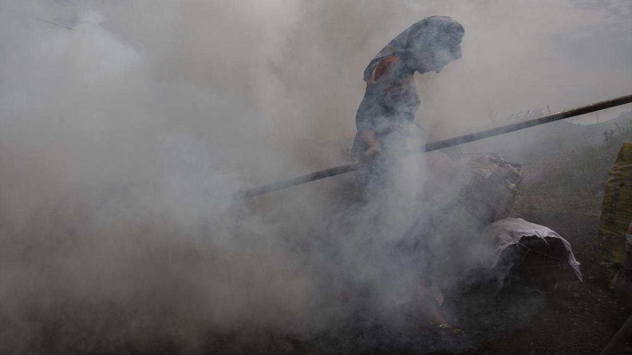 Mardin'den Diyarbakır'ın Çermik ilçesine çalışmak için gelen ve kırsalda kurdukları çadırlarda kalan aileler, ateş karşısında duman ve ise aldırış etmeden meşe odununu mangal kömürüne dönüştürüyor.