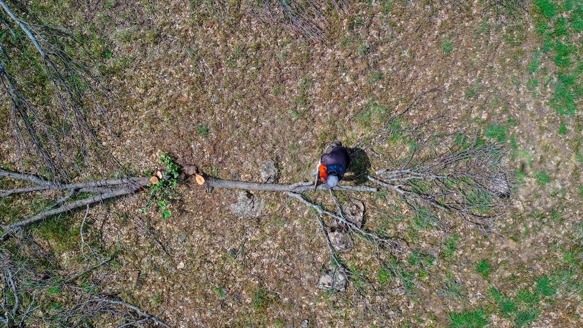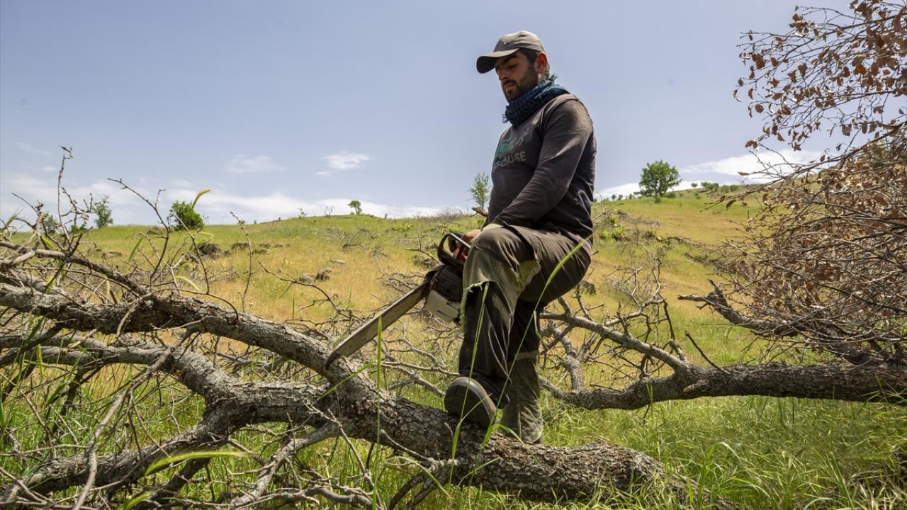 Orman sahalarında yürütülen gençleştirme çalışmaları kapsamında kesime ayrılan meşe ağaçlarını motorlu testereyle kesen işçiler yığma işi bittikten sonra odunların üzerini ve etrafını meşe yaprağı ve toprakla kapatıyor.