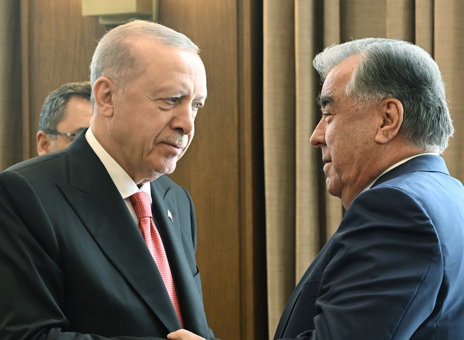 Cumhurbaşkanı Erdoğan, programa katılan Tacikistan Cumhurbaşkanı İmamali Rahman ile selamlaştı.