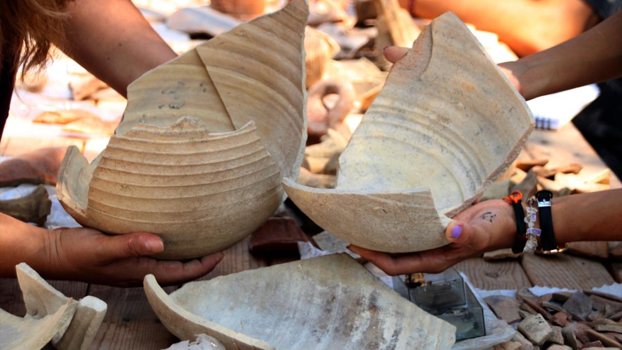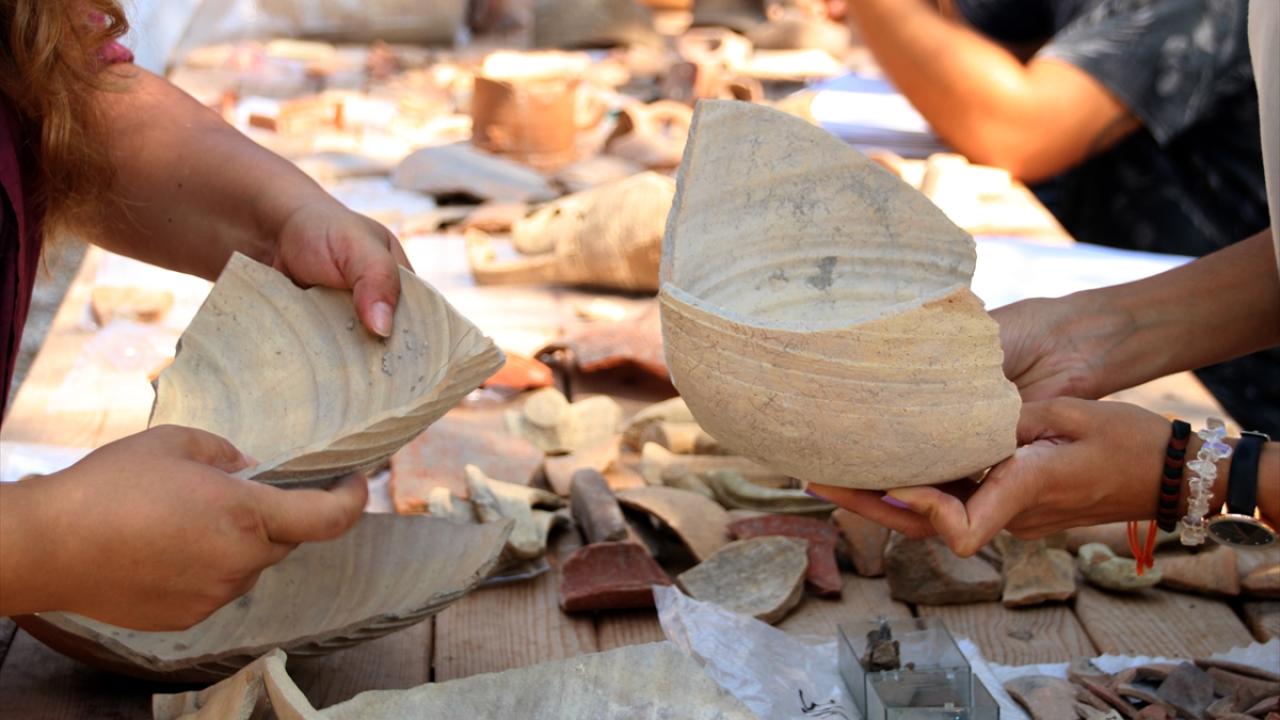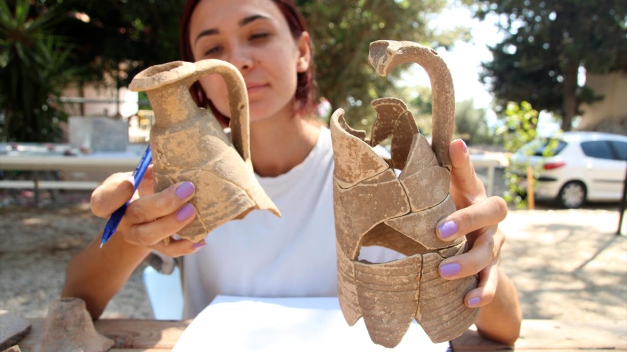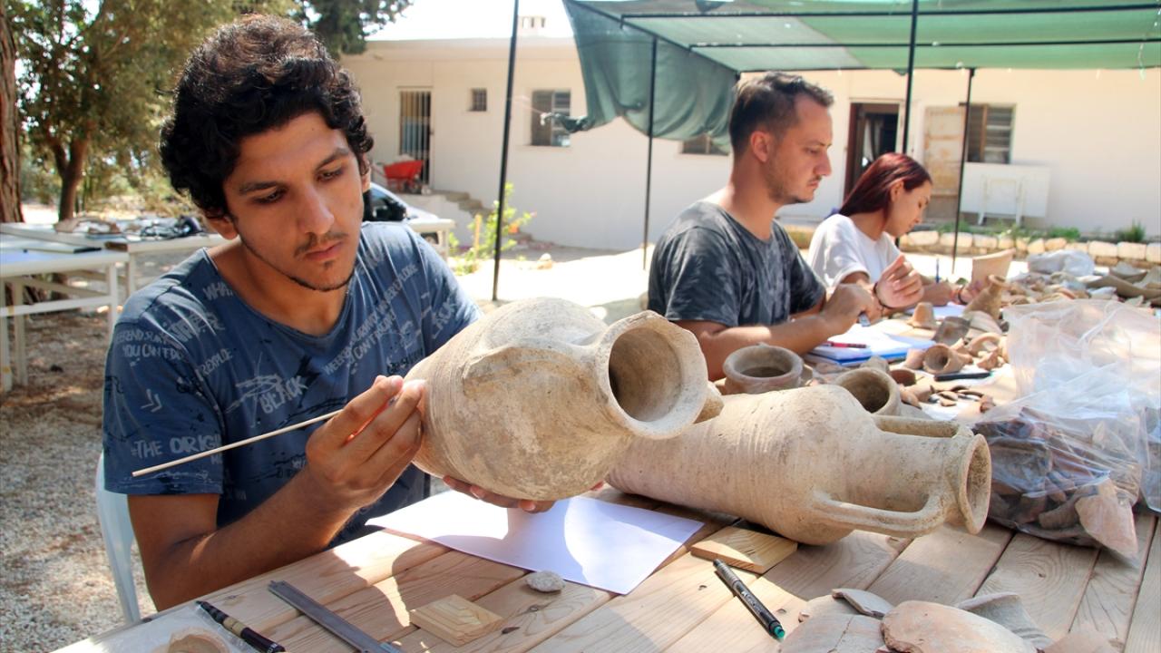 Mersin'in Erdemli ilçesinde, Roma ve Bizans dönemlerinin izlerini taşıyan Elaiussa Sebaste Antik Kenti'ndeki kazılarda bulunan amfora parçaları birleştiriliyor.
