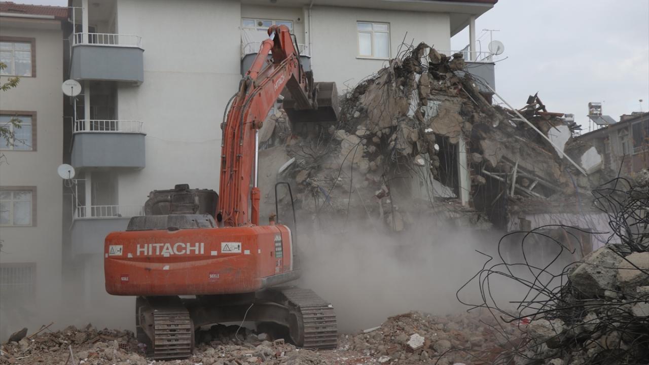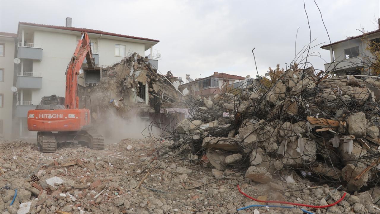 Depremlerin ardından boşaltılan ağır hasarlı yapıların yıkımı için tedbir amacıyla çevresindeki yapılarda yaşayanlar da tahliye ediliyor, daha sonra uzman ekiplerin gözetimi ve güvenlik önlemleriyle iş makineleri çalışma yürütüyor.