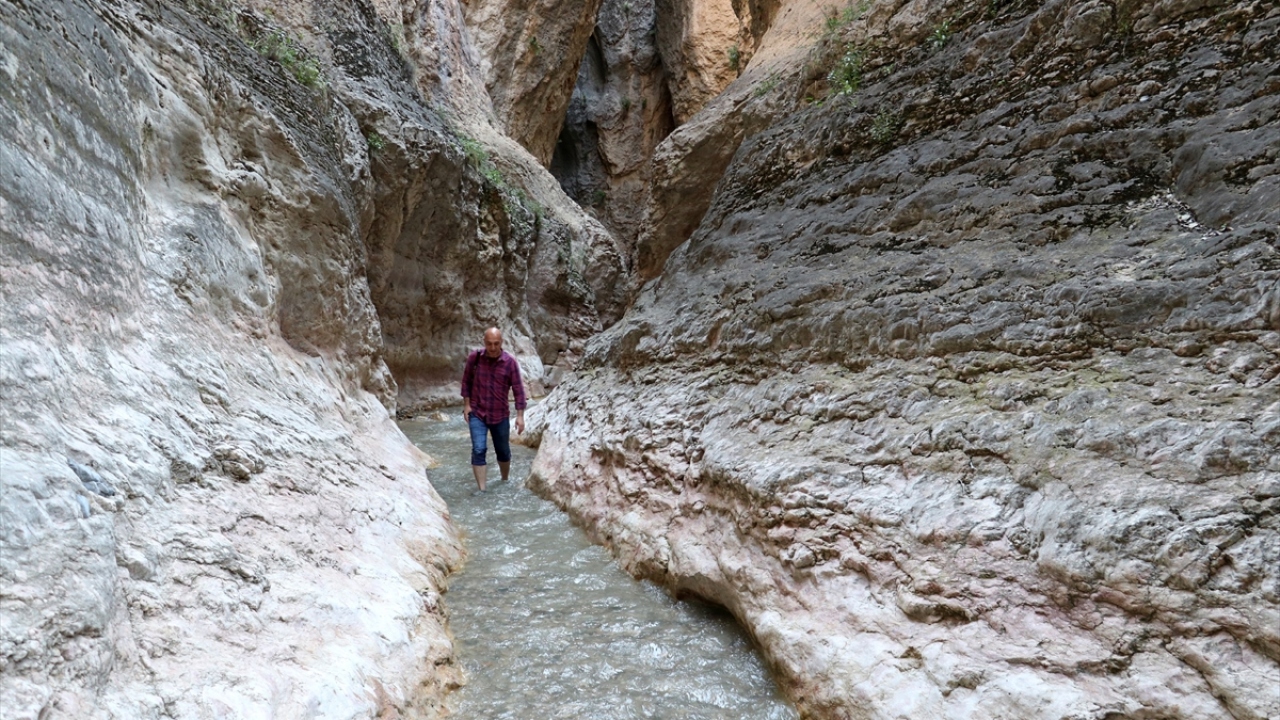 Yer altı sularının meydana getirdiği akarsuyun 4,5 kilometrelik Saklıkapı kanyonundan geçerek Keban Baraj Gölü`ne dökülmesi ile oluşan yürüyüş parkuru görüntülendi.